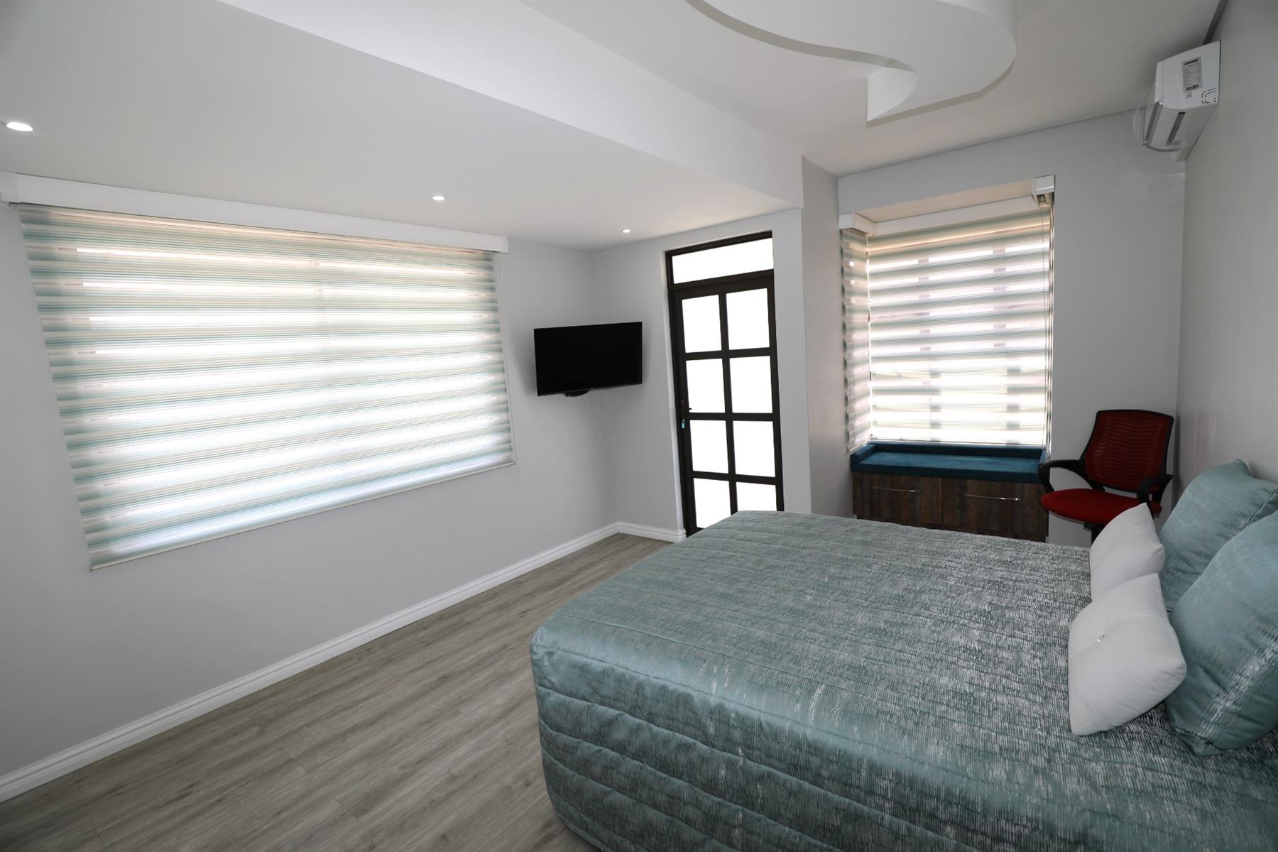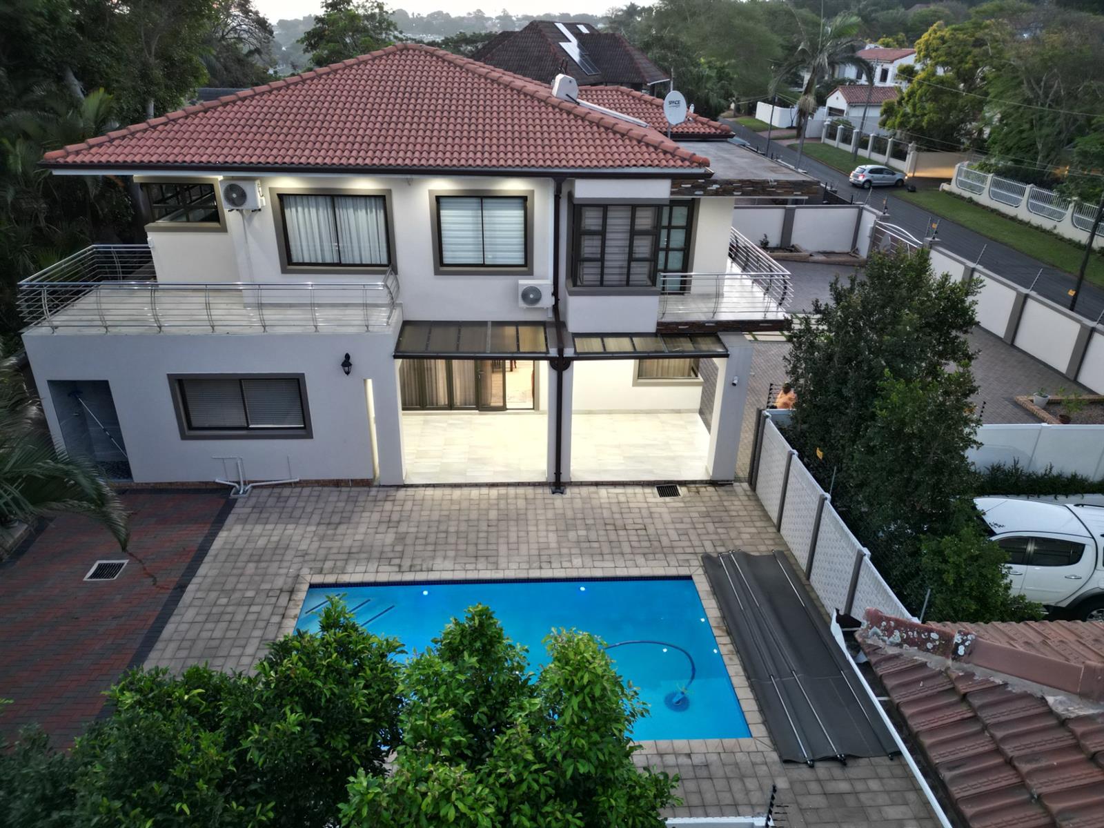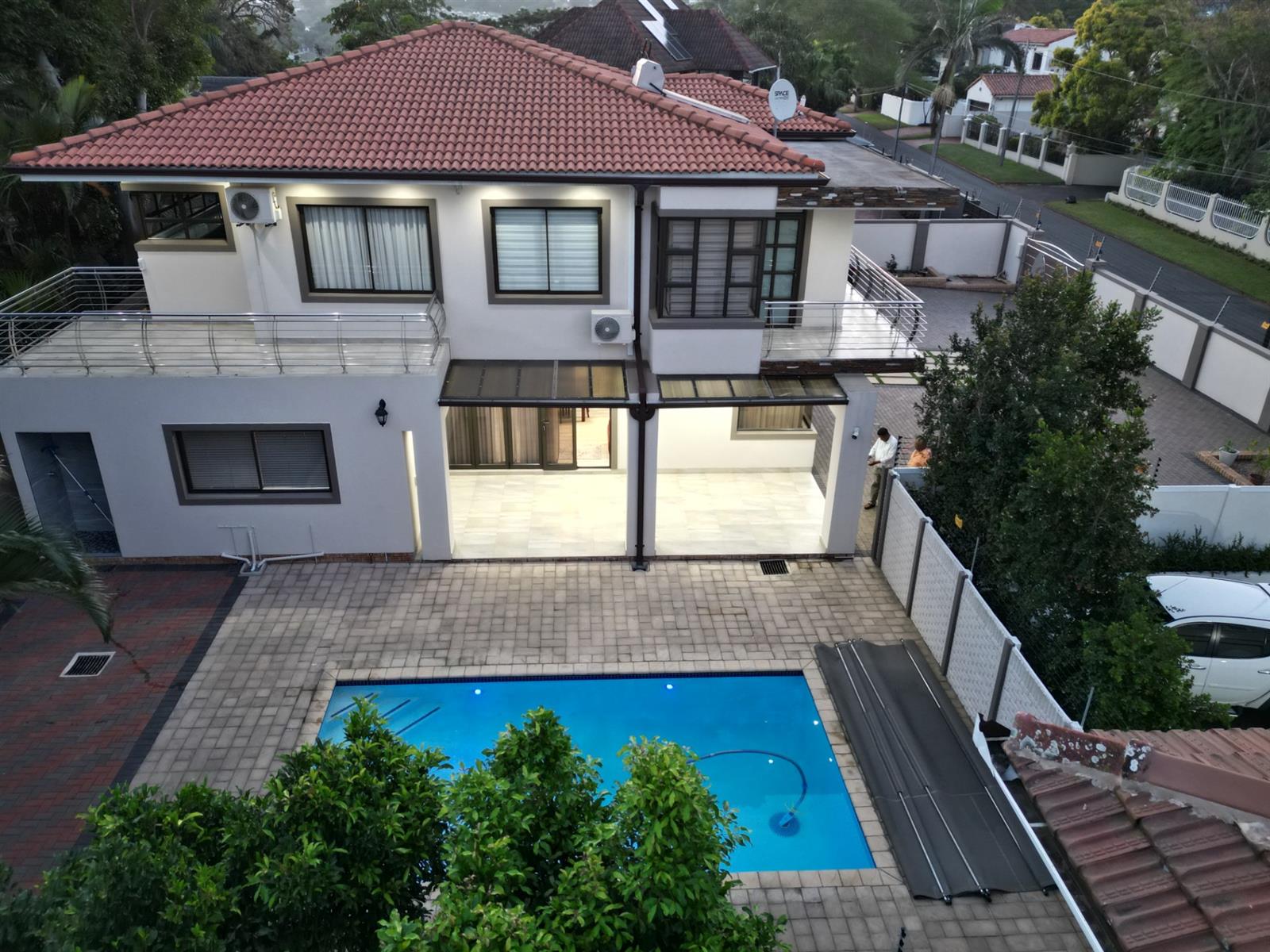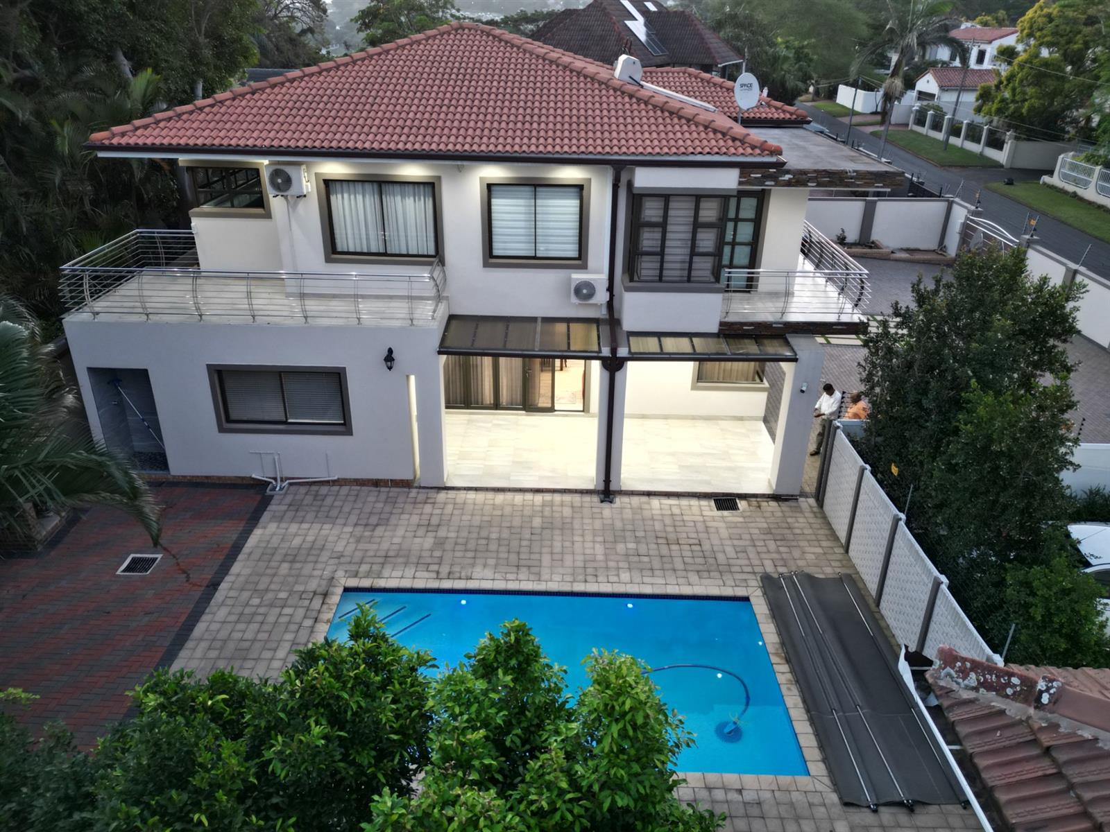 This prestigious property comes fully outfitted with premium appliances such as a refrigerator, washing machine, dishwasher and microwave. Additional features include energy-efficient solar geysers, a water saving jojo tank, air conditioning and stylish bespoke tea/coffee stations. The dining room and lounge flow effortlessly from the kitchen, creating a perfect setting for entertaining or family gatherings. Sliding doors lead to a charming veranda that overlooks the splash pool, making outdoor living a breeze.