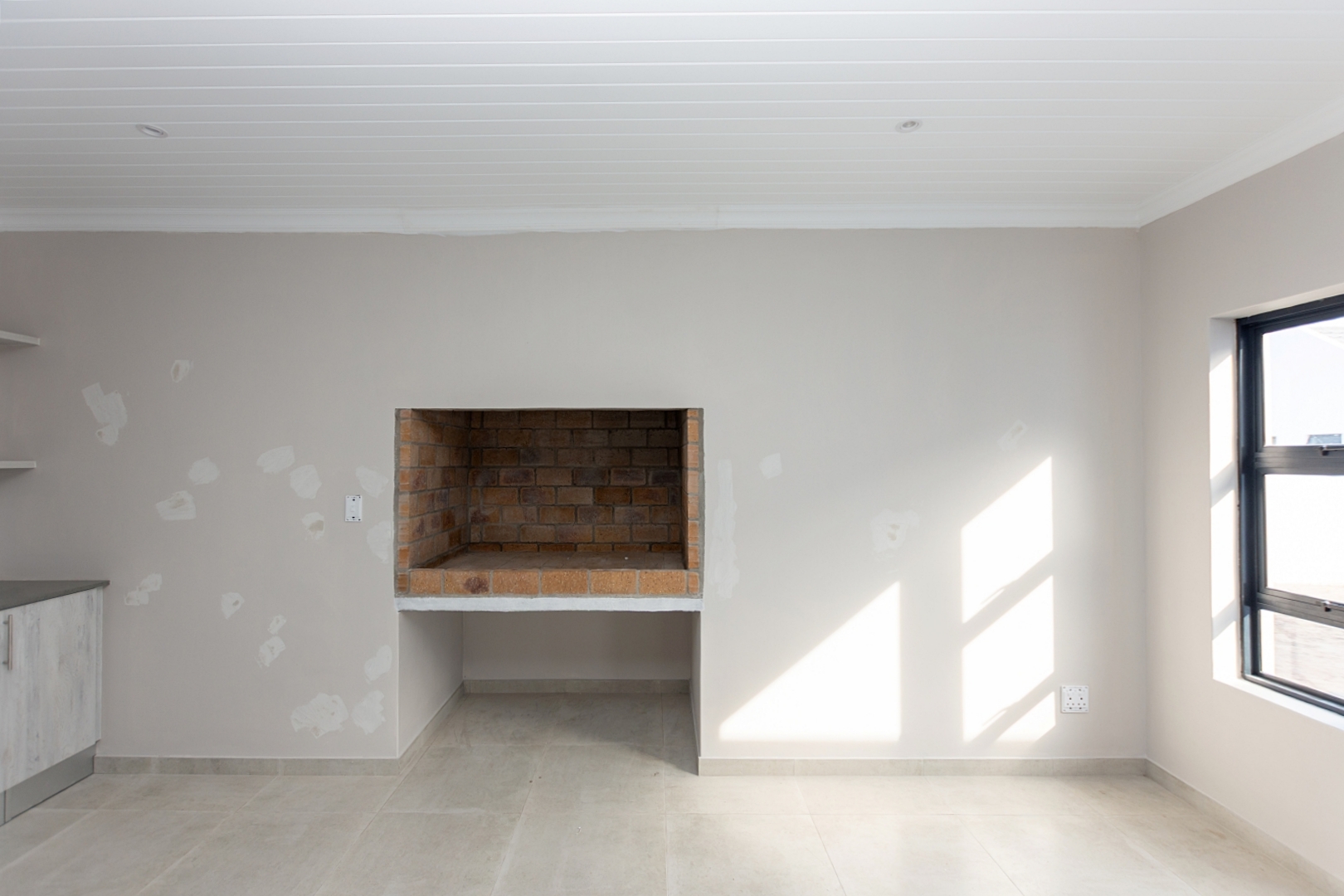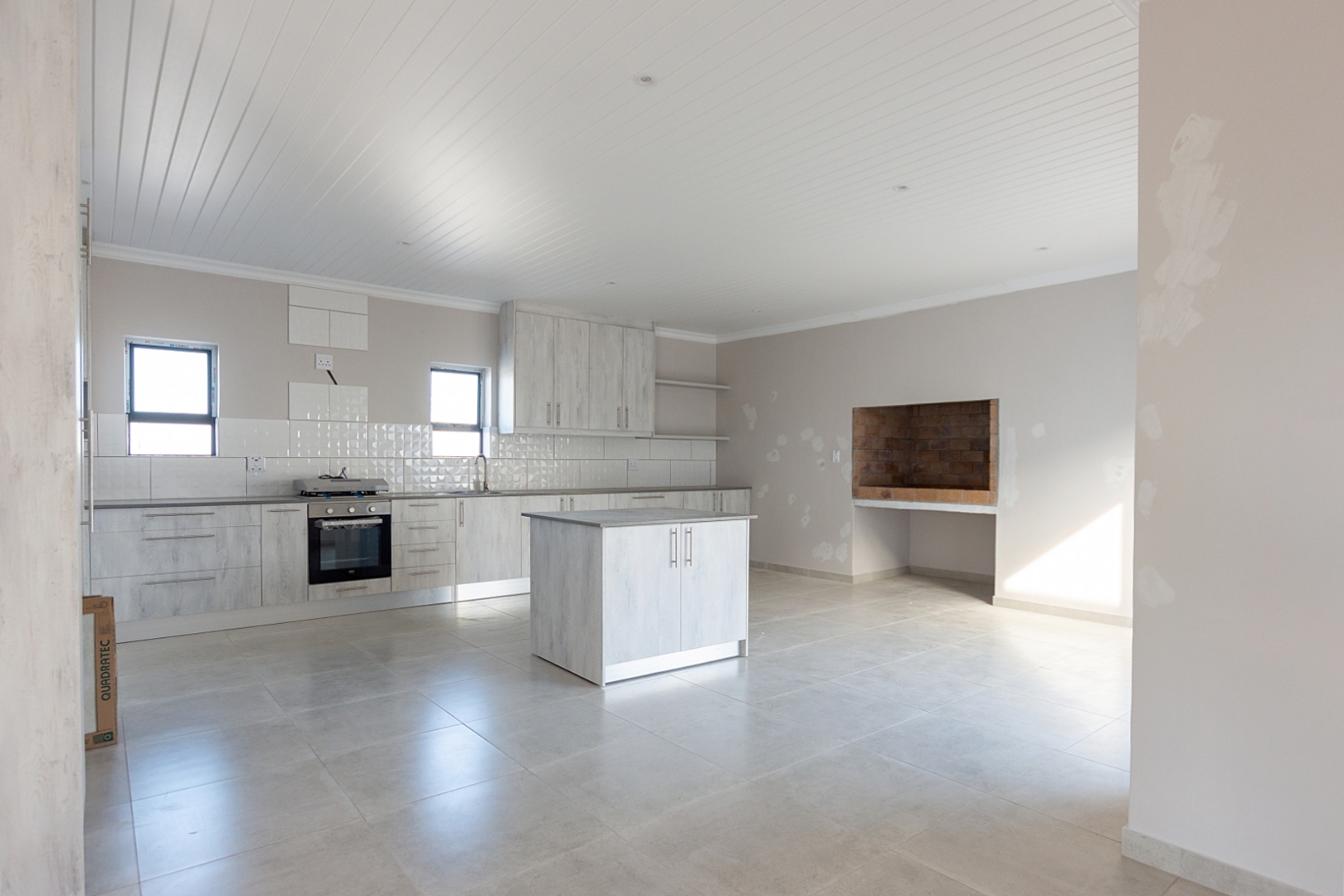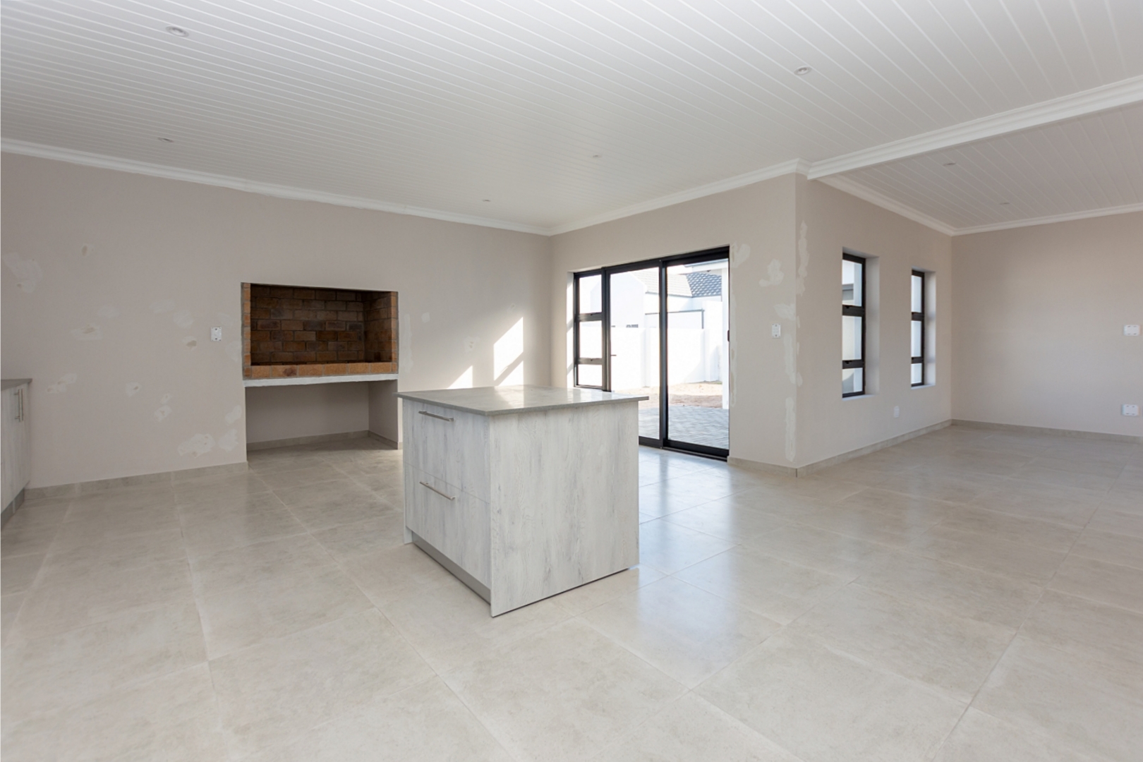 One of the most exciting aspects of this home is the open-plan lounge and kitchen area. It boasts a modern kitchen island and an indoor braai area — ideal for entertaining or relaxing in comfort.