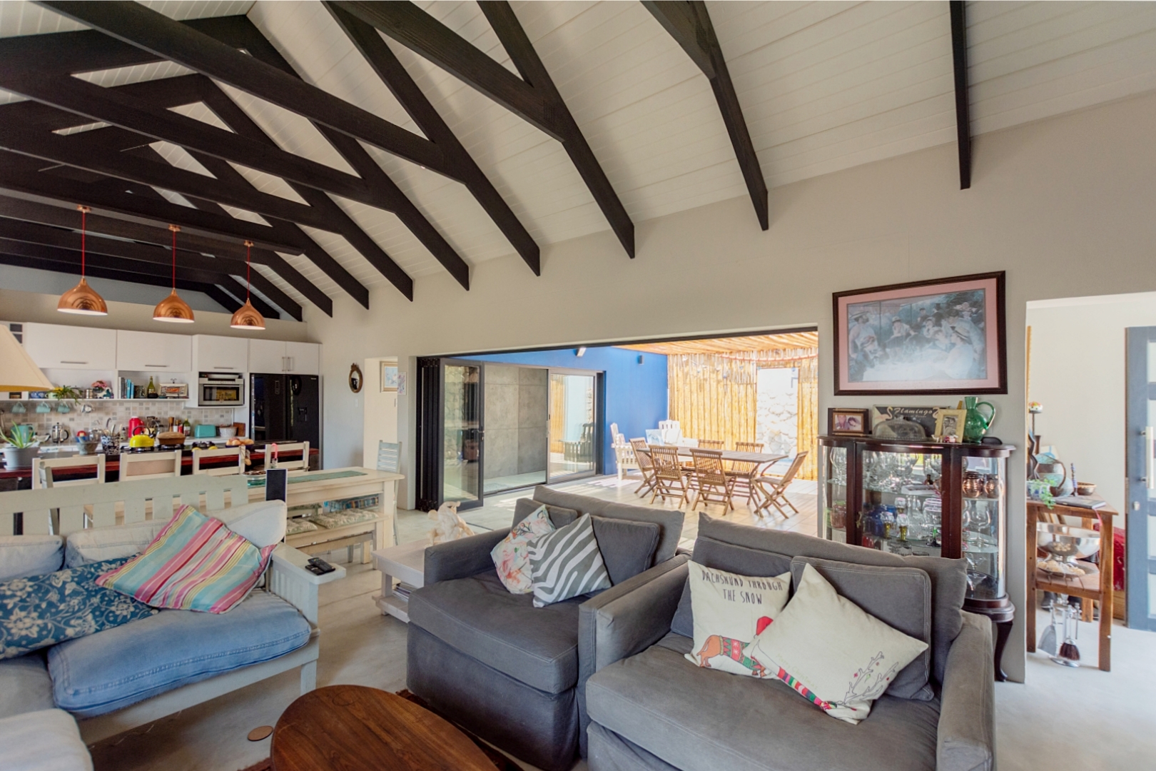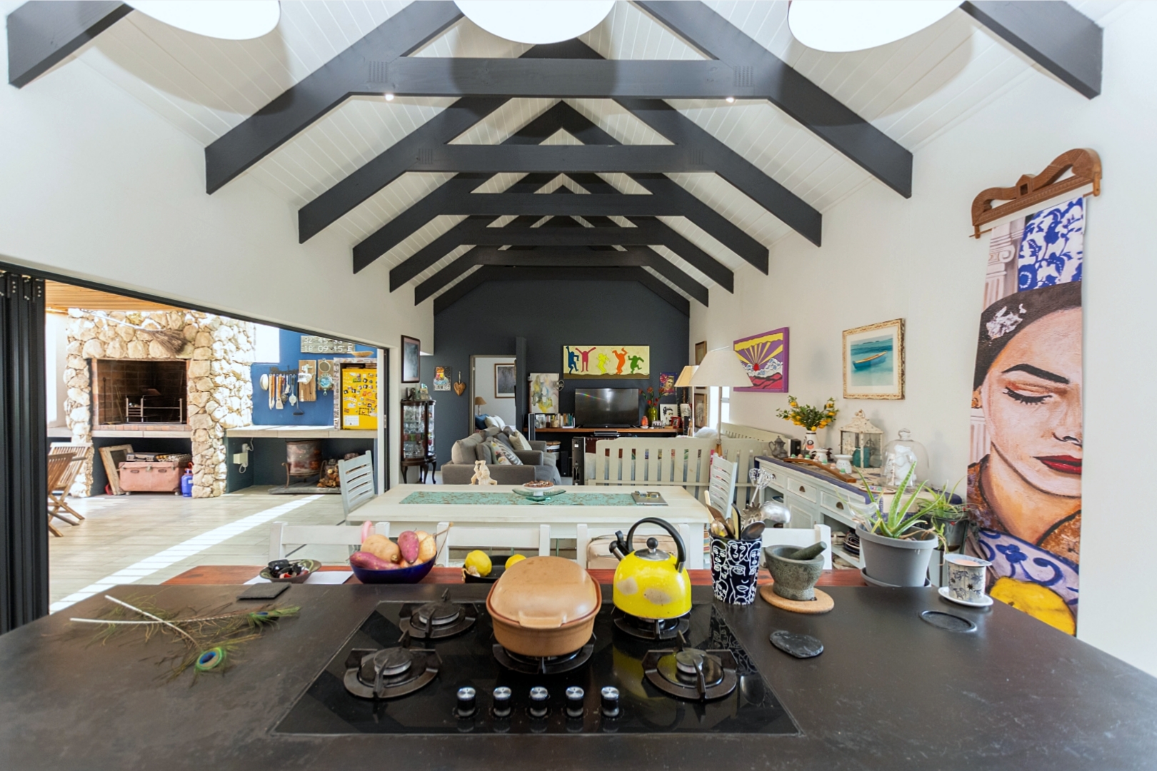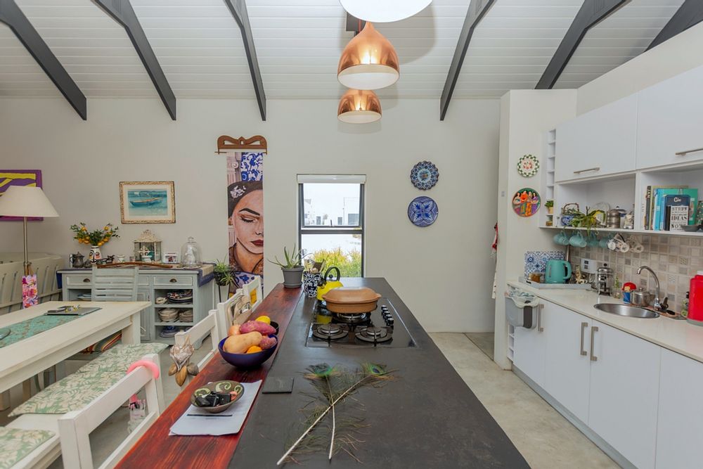 Inside, the home offers open-plan living at its best. The generously sized lounge and dining areas flow seamlessly into a modern, well-appointed kitchen with a separate scullery providing ample cupboard and packing space. The master bedroom overlooks the pool area, creating a serene private retreat.
