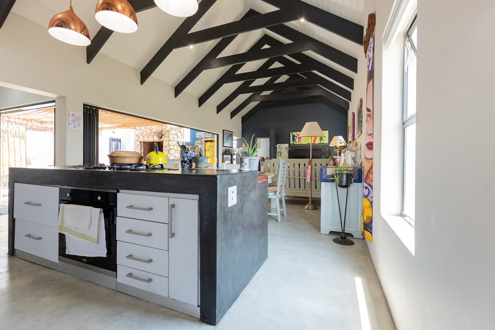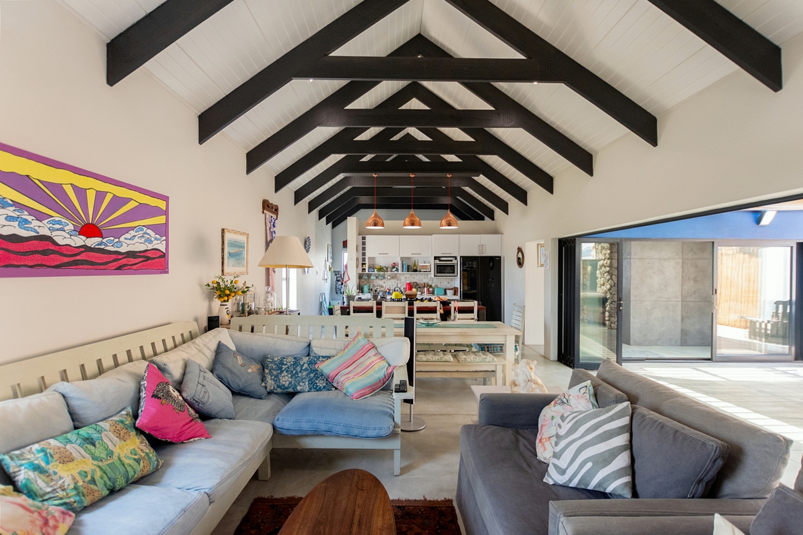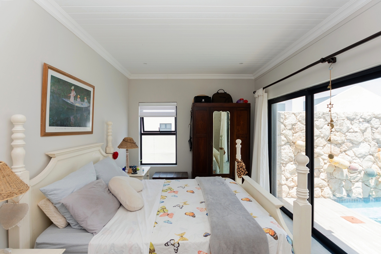 Inside, the home offers open-plan living at its best. The generously sized lounge and dining areas flow seamlessly into a modern, well-appointed kitchen with a separate scullery providing ample cupboard and packing space. The master bedroom overlooks the pool area, creating a serene private retreat.