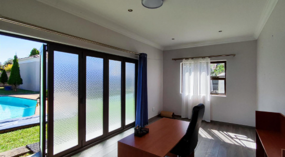 The Main Residence is a spacious family home that features three generously sized bedrooms, with the main bedroom offering a private en-suite bathroom. Two neatly tiled bathrooms provide convenience and comfort. The contemporary kitchen is fitted with a gas stove and ample cabinetry, perfect for home chefs. An open-plan living and dining area flows seamlessly into the outdoor entertainment space, while the inviting lounge opens directly onto a sparkling swimming pool. A dedicated study with its own private bathroom offers the ideal setup for remote work or can double as a guest suite.
