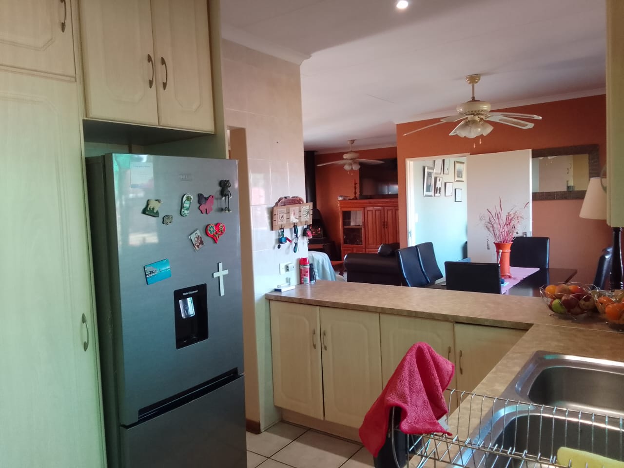 Open-Plan Entertainment: The heart of the home is the spacious, open-plan kitchen, dining room, and lounge area, perfect for entertaining. Ceiling fans in the living areas ensure comfort year-round, and an indoor wood fireplace adds a cozy ambiance during cooler months.