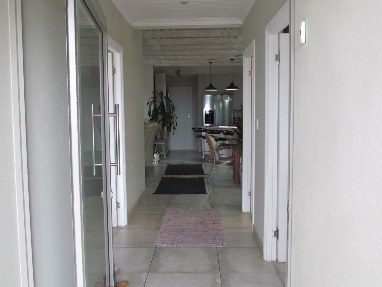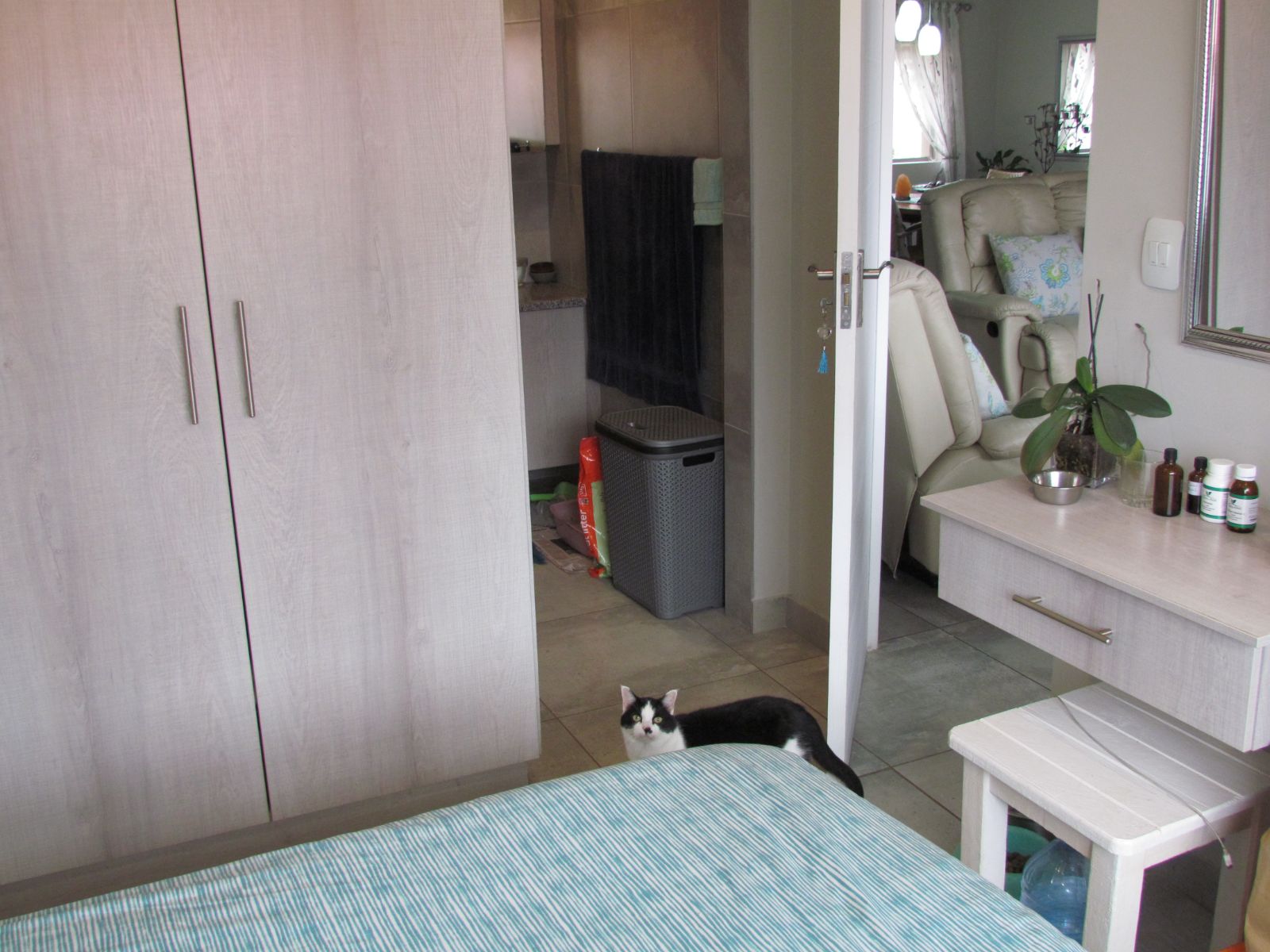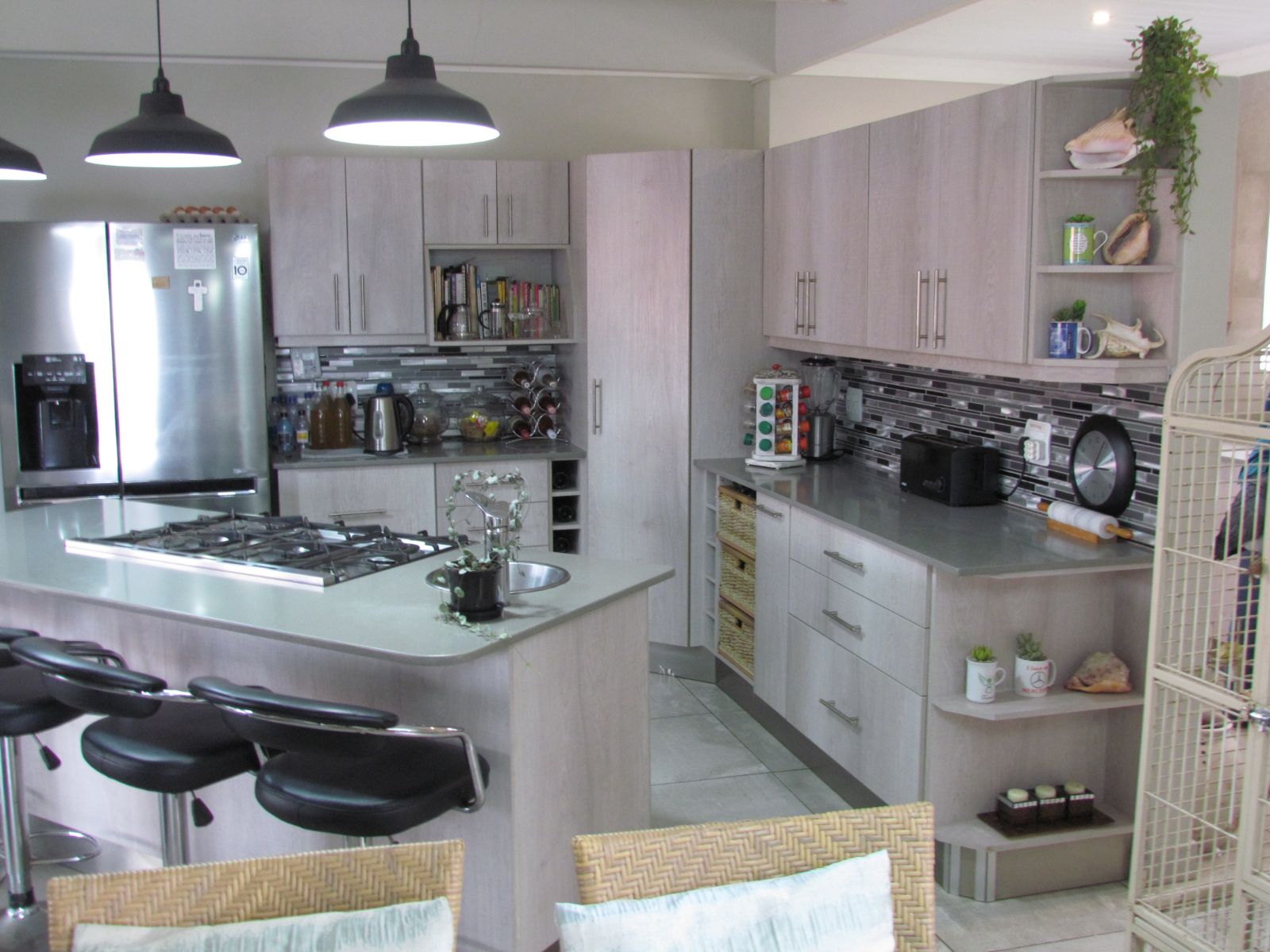 The well-equipped kitchen is a chef's delight, featuring abundant cupboard space, a modern gas hob, and a Smeg oven. Adjacent to the kitchen, a separate scullery provides even more storage, easily accommodating a pantry.