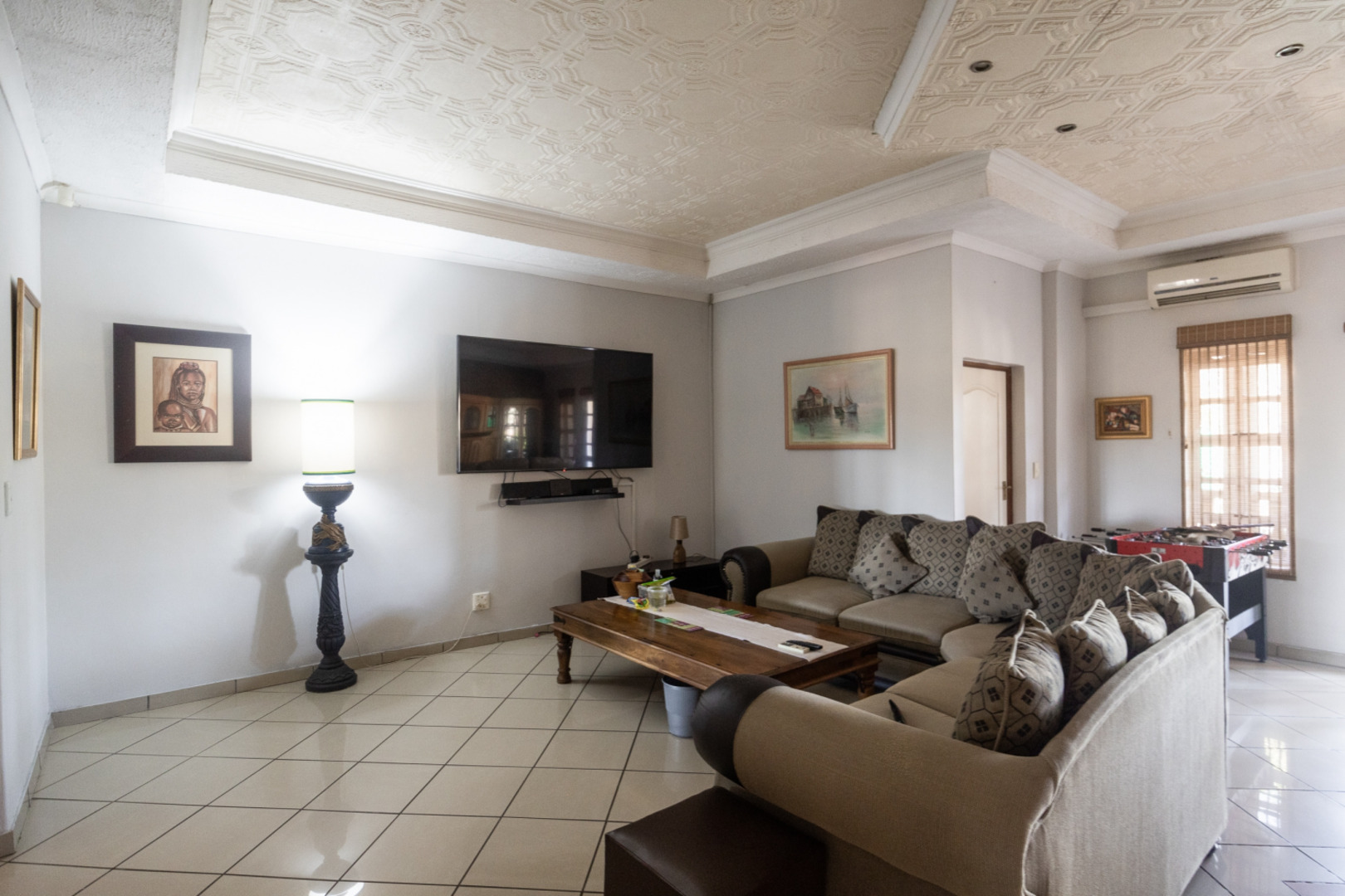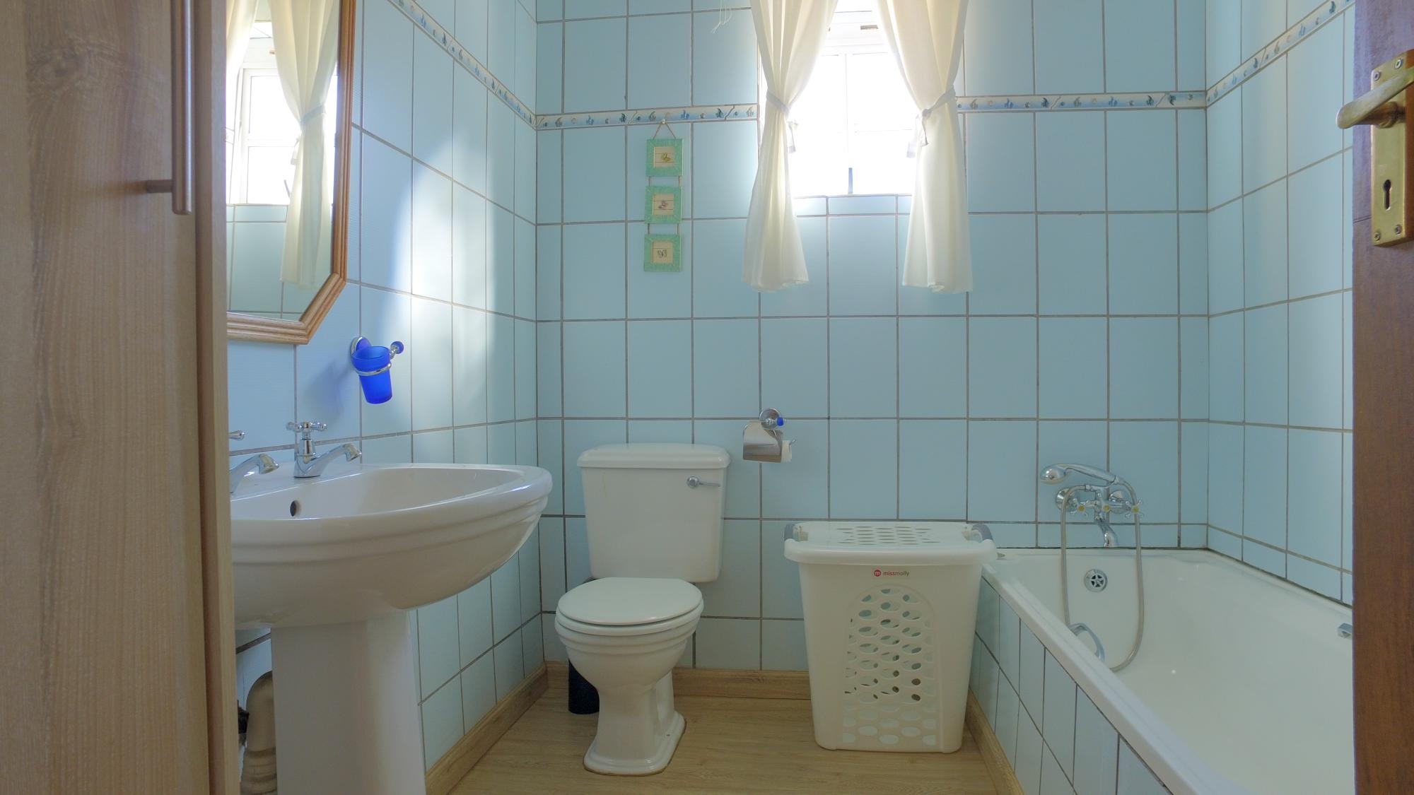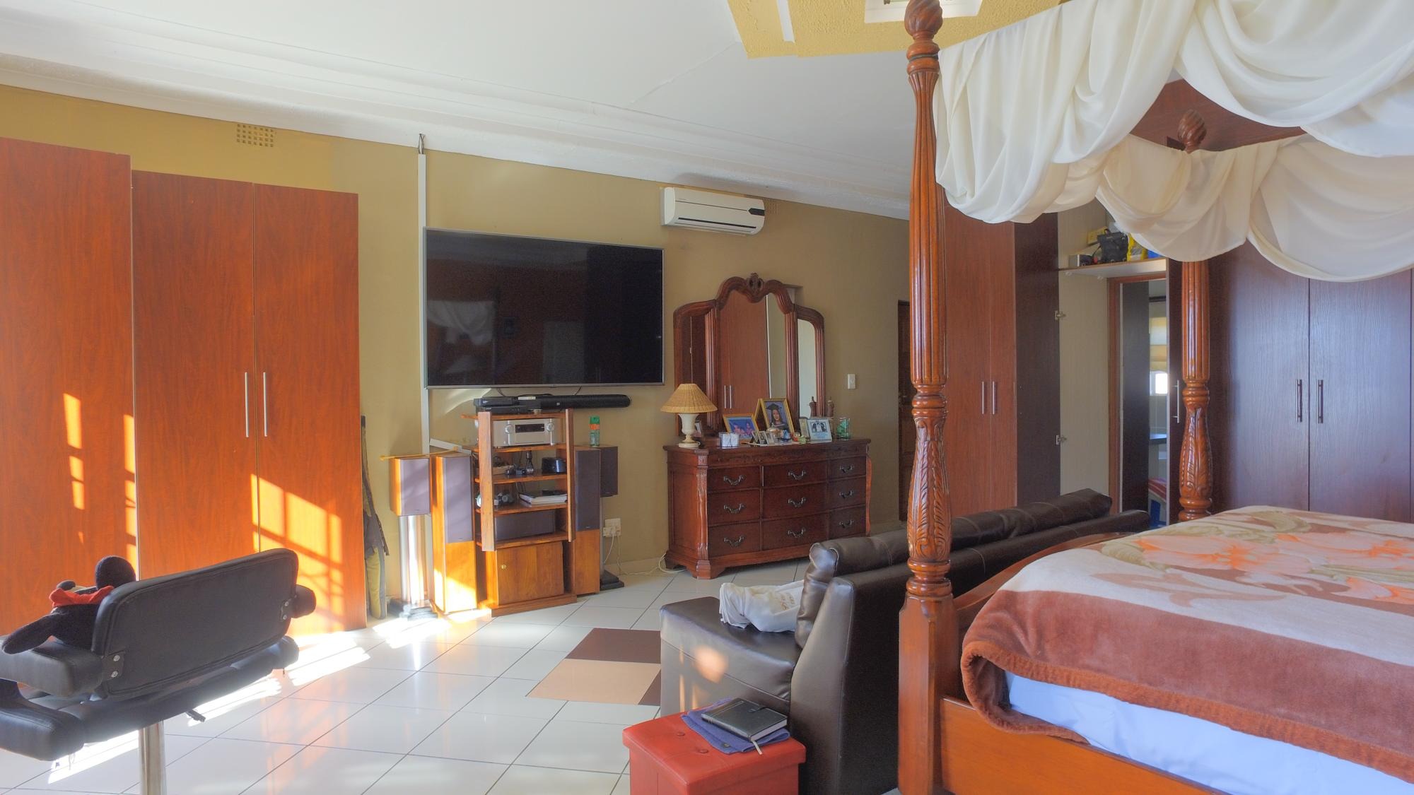 The master suite is a true retreat, featuring ample cupboard space, an en-suite bathroom, and air conditioning for year-round comfort. The second bedroom also enjoys an en-suite bathroom, while the remaining two bedrooms share a well-appointed bathroom. A unique addition to this level is a spacious room previously utilized as a cinema, accessible from both the main bedroom and an exterior staircase.