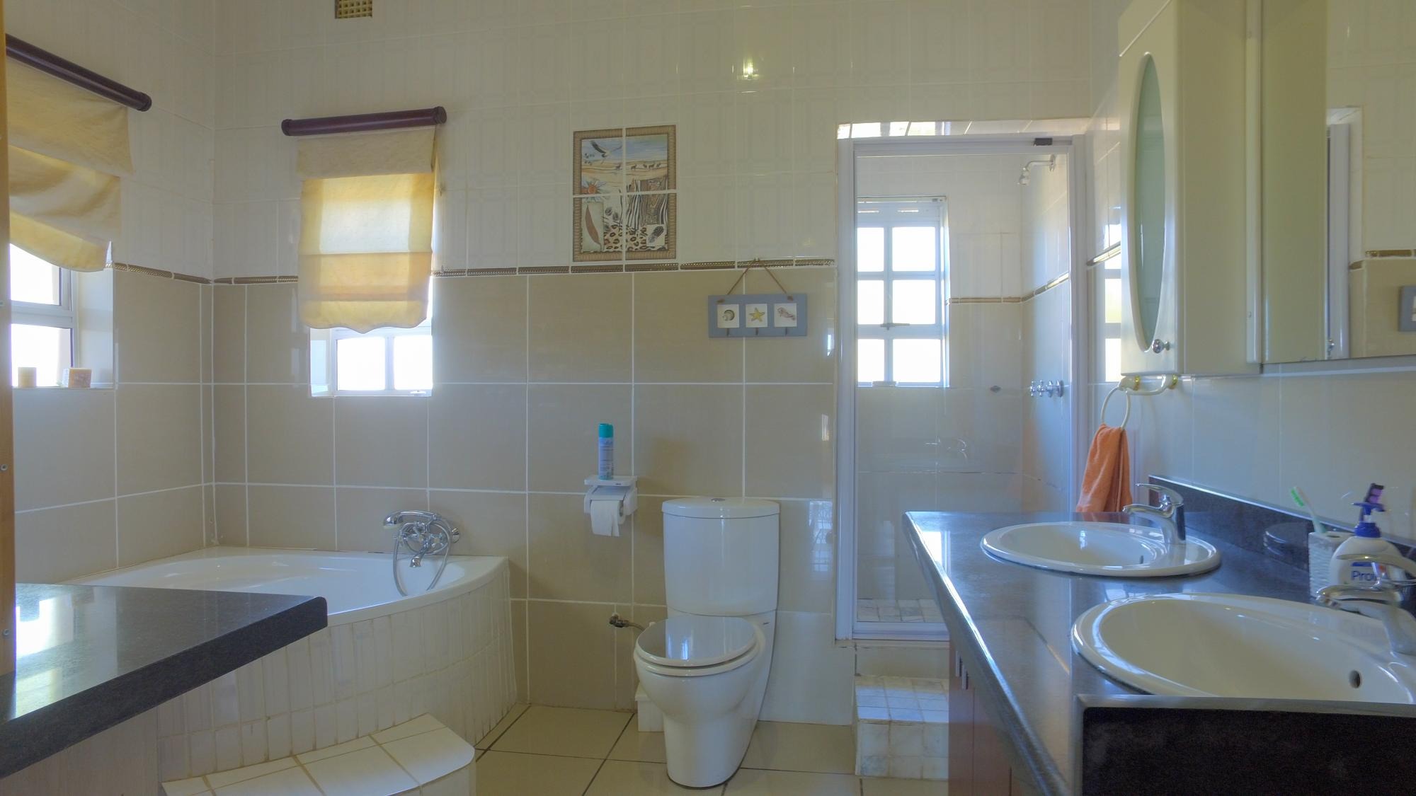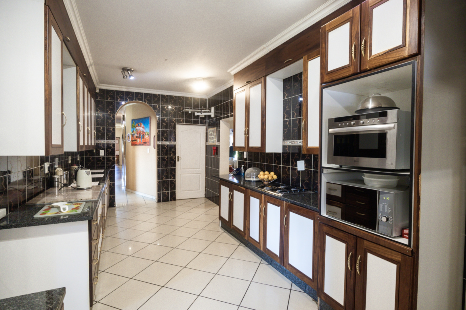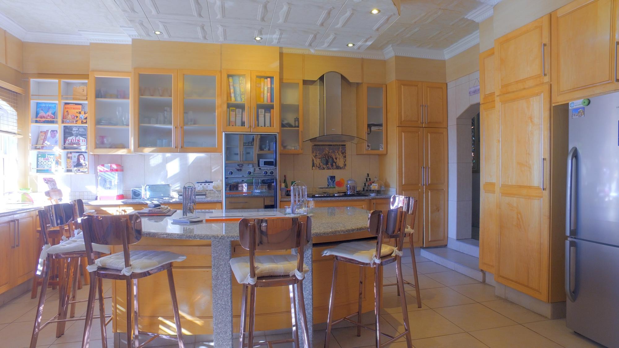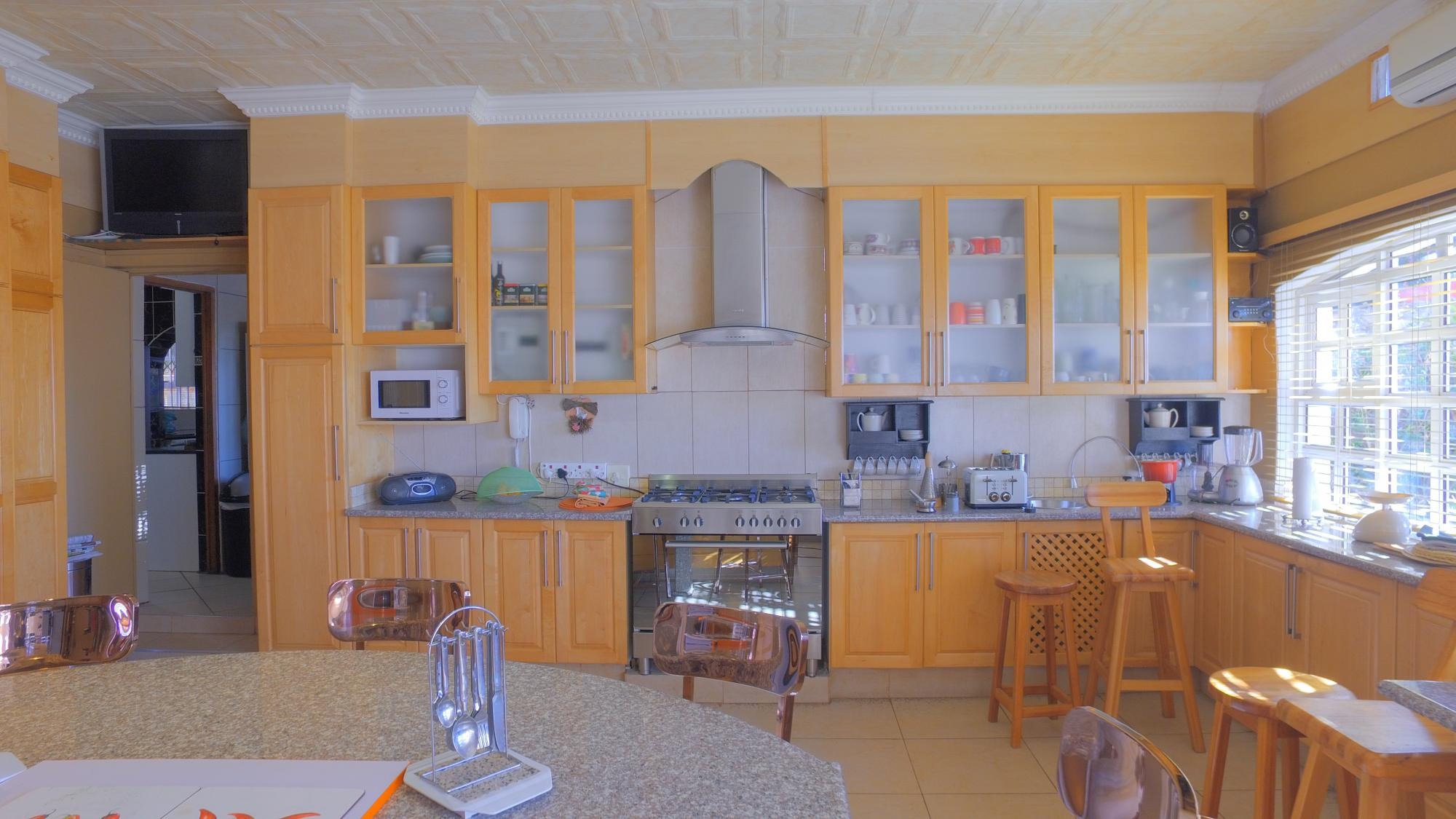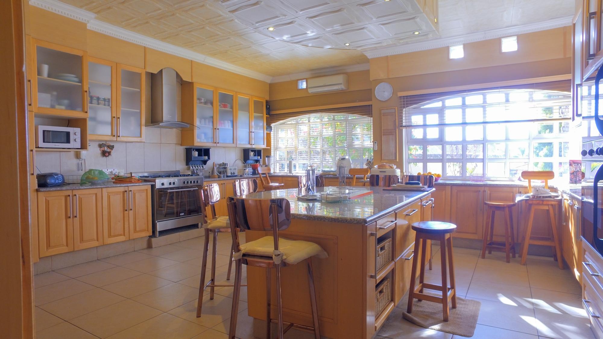 The property features not one but two modern kitchens, each designed to impress. The first kitchen boasts sleek dark granite countertops, ample cupboard space, and a separate scullery and laundry area, making it as functional as it is stylish. The second kitchen, bathed in natural light from large bay windows, is a chef’s delight. It includes a center island with a gas stove, abundant cupboard space, and an inviting atmosphere for family get-togethers.