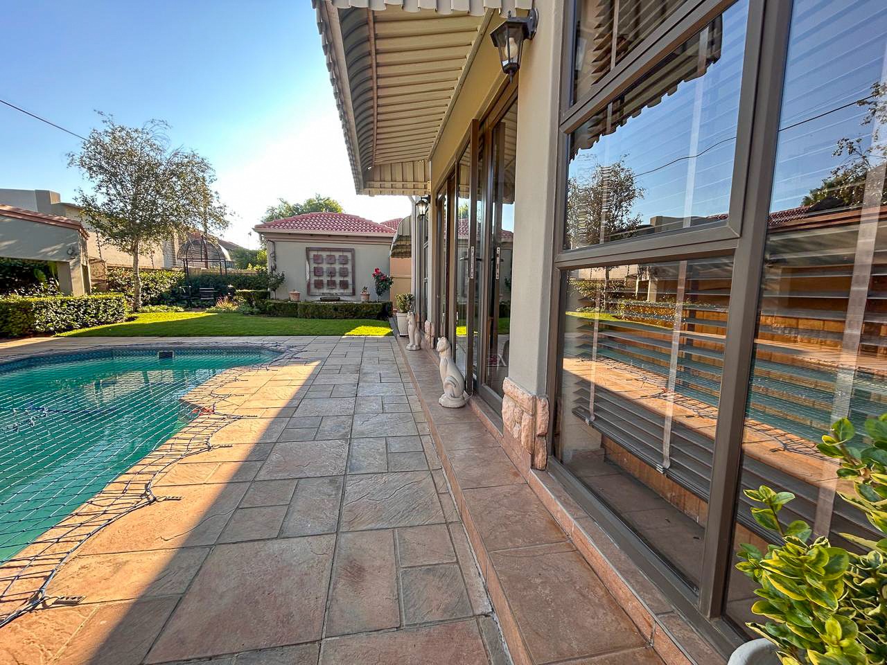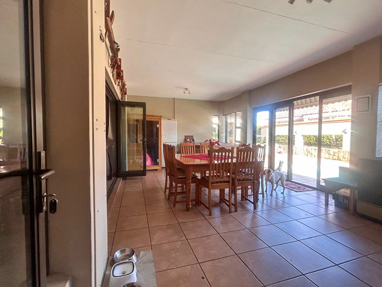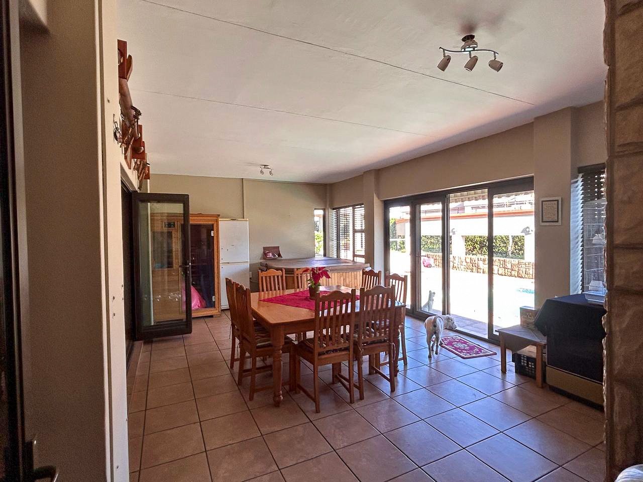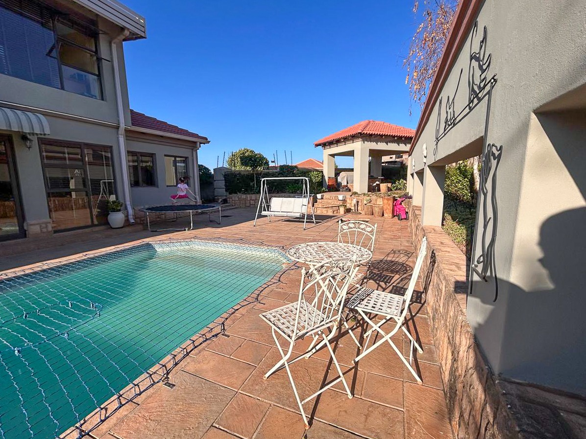 Step into a world of space and style, where sun-filled, open-plan living and dining areas create an inviting atmosphere, ideal for both intimate gatherings and grand-scale entertaining. A built-in bar adds a touch of luxury, while the sprawling covered patio—complete with a built-in braai and jacuzzi—effortlessly extends onto the pristine pool area, offering the perfect setting for alfresco dining and relaxation.