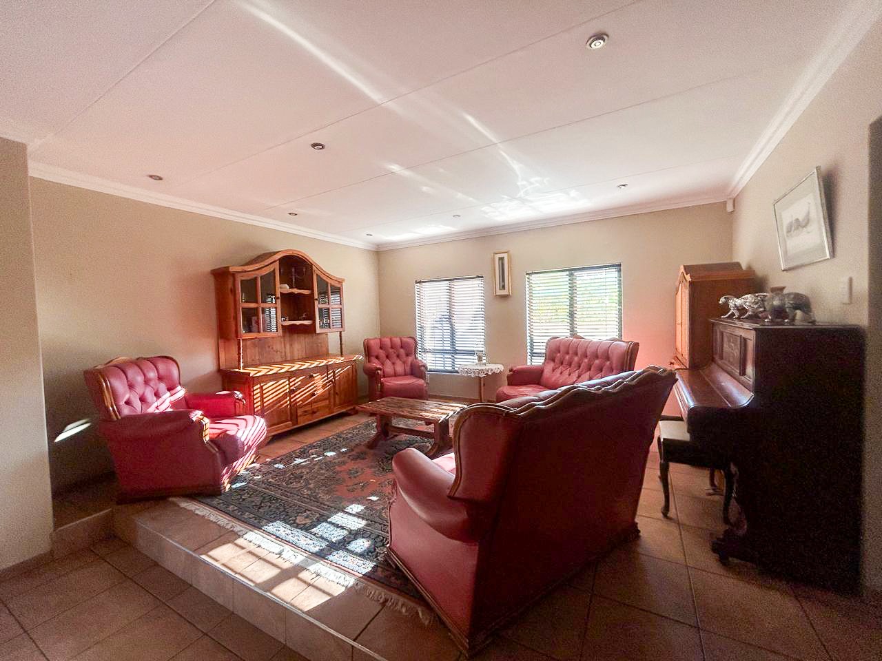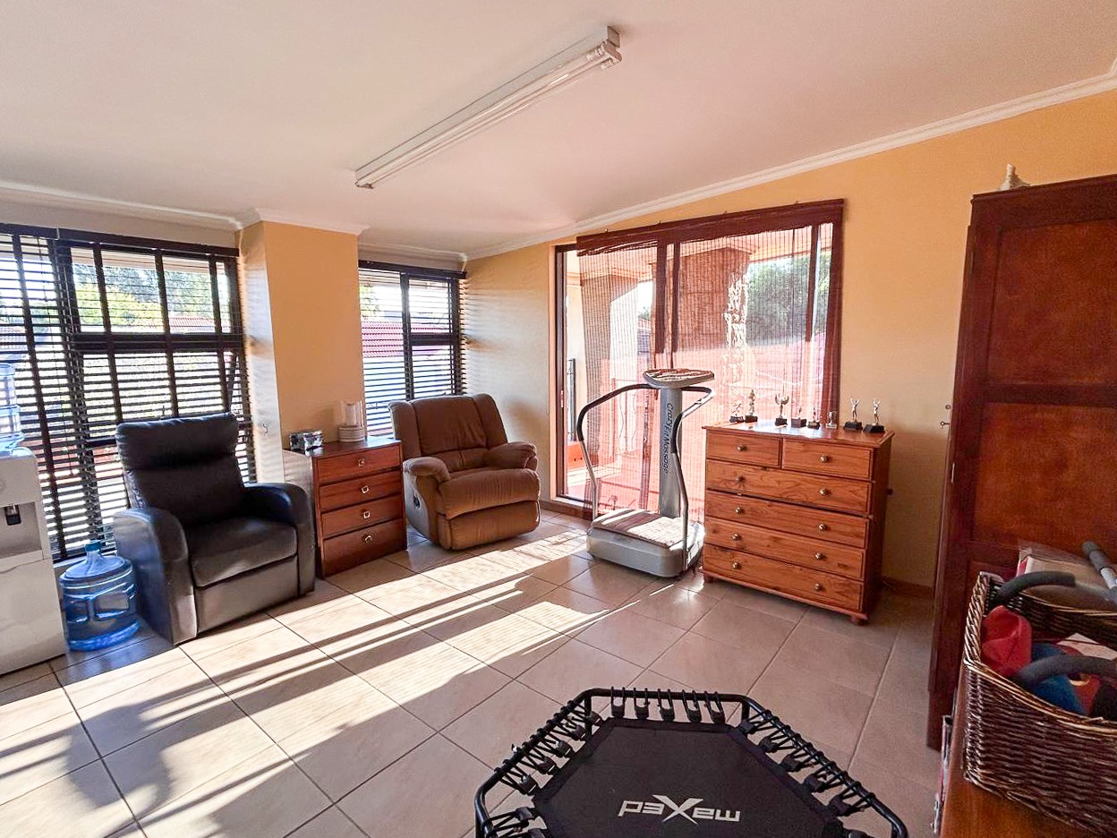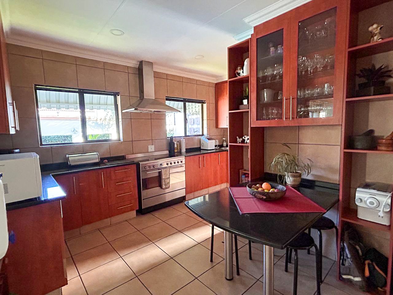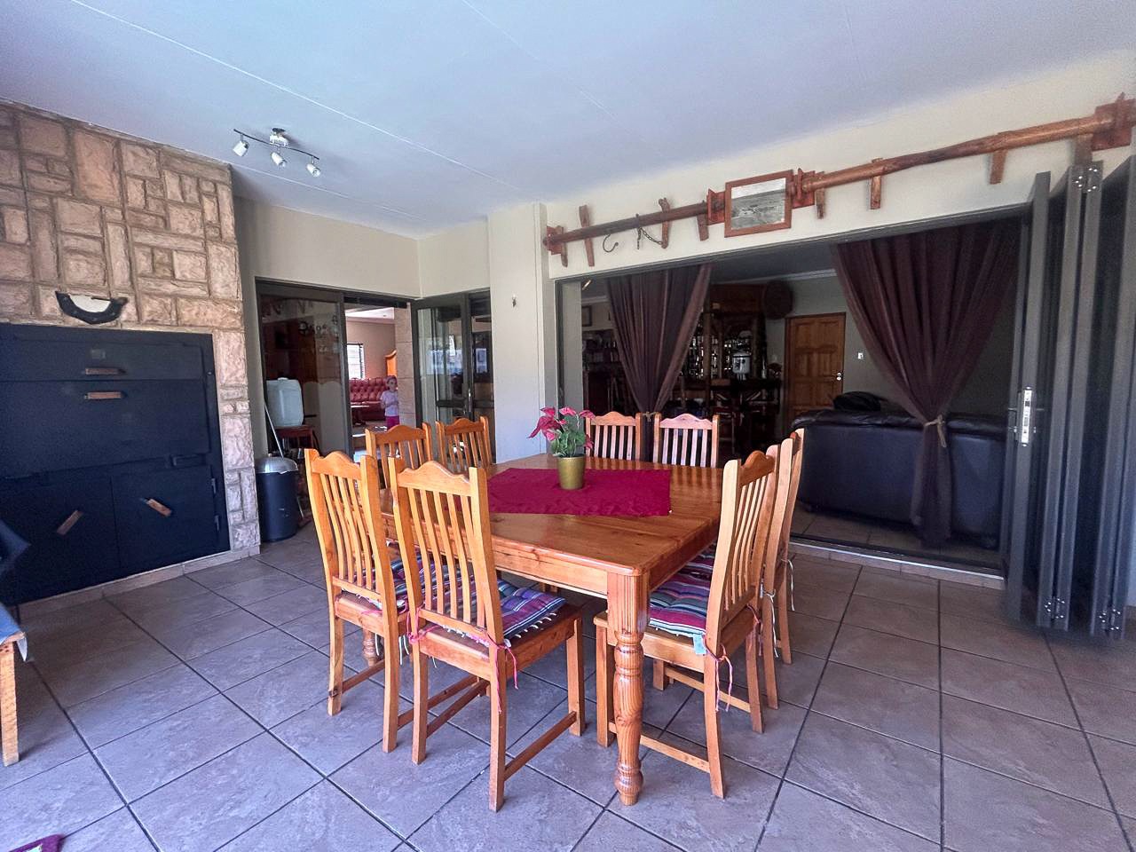 Step into a world of space and style, where sun-filled, open-plan living and dining areas create an inviting atmosphere, ideal for both intimate gatherings and grand-scale entertaining. A built-in bar adds a touch of luxury, while the sprawling covered patio—complete with a built-in braai and jacuzzi—effortlessly extends onto the pristine pool area, offering the perfect setting for alfresco dining and relaxation.