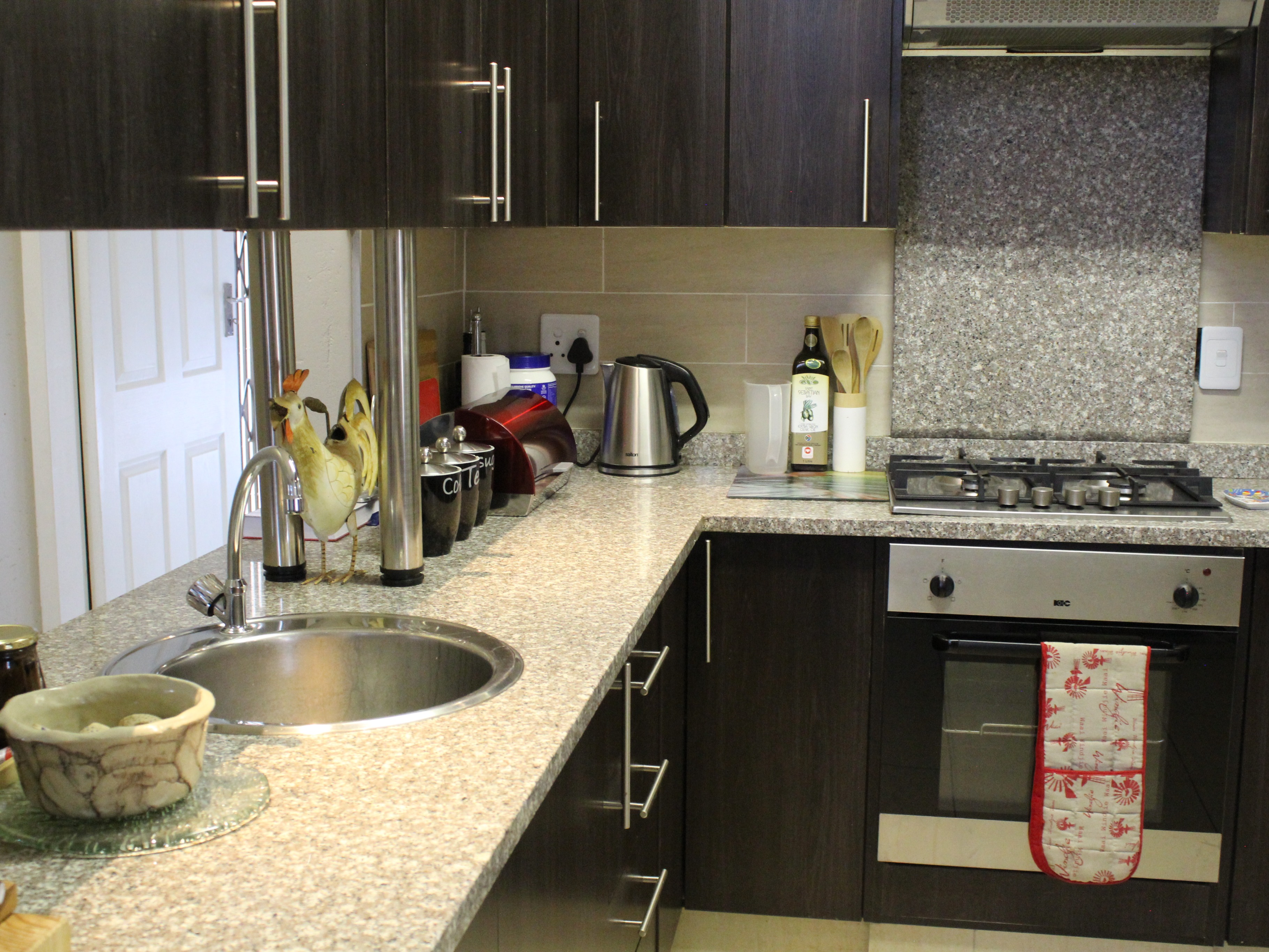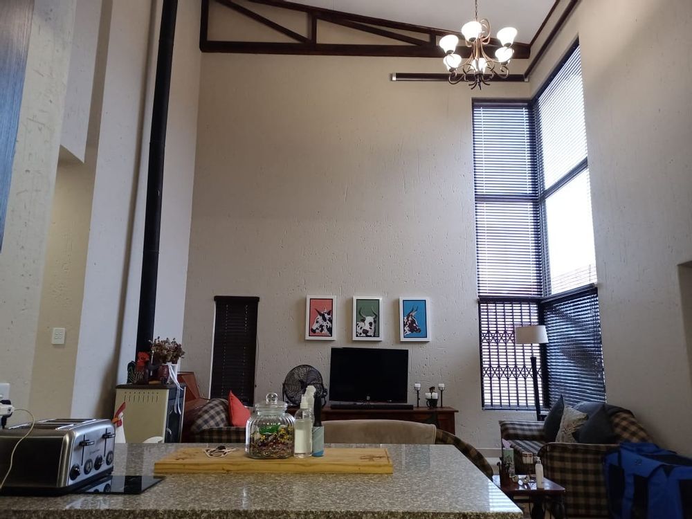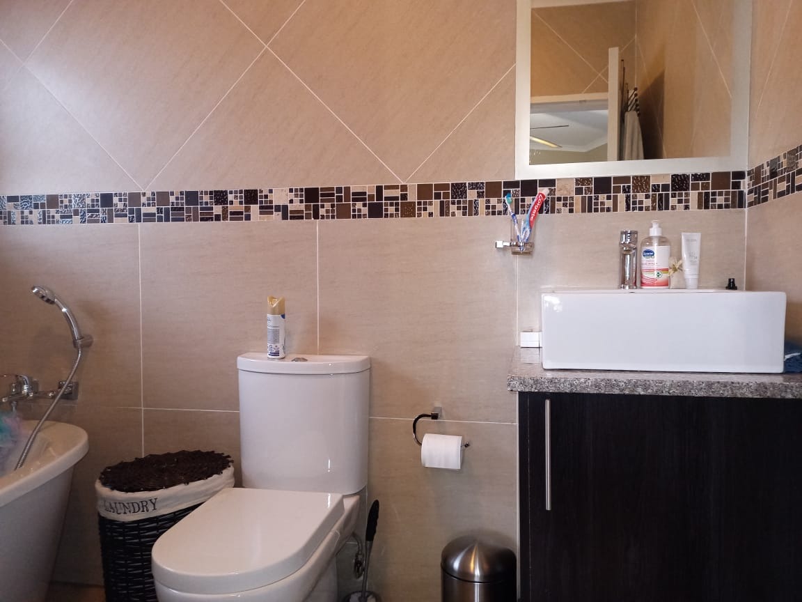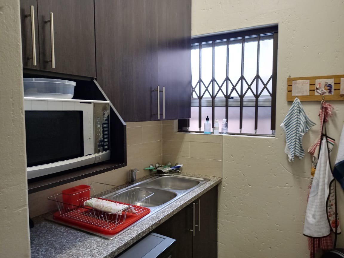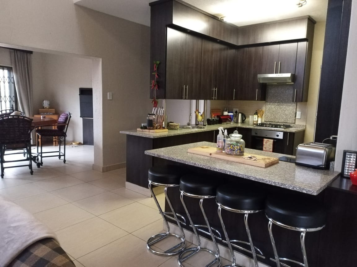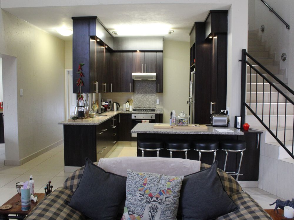 This modern double-storey home has so much to offer, including open plan living areas downstairs with tastefully finished open-plan kitchen with granite tops, oven, hob and extractor fan and separate scullery and laundry. A built-in braai with separate working space is ideally placed in the living area, with doors leading to the garden.