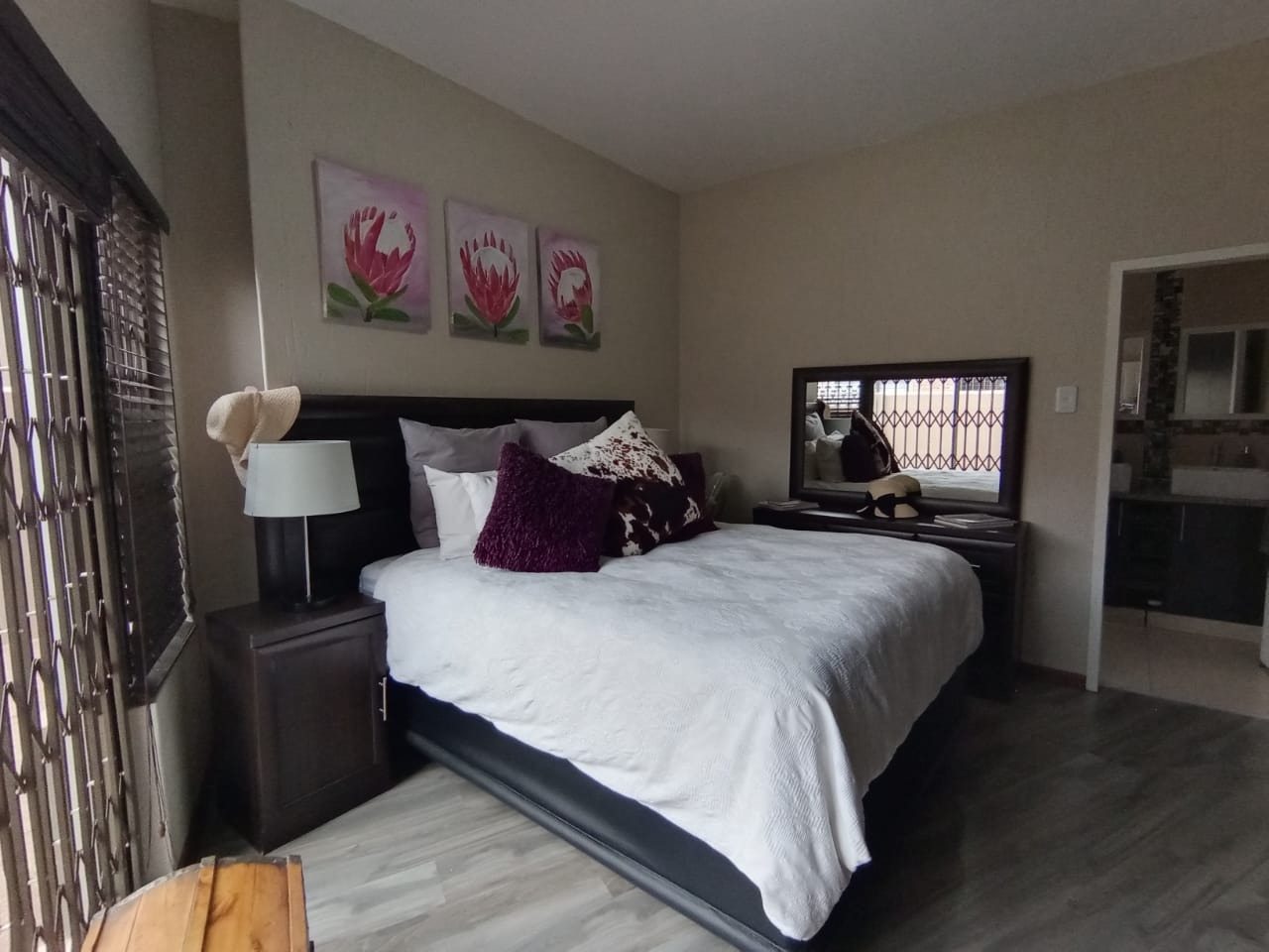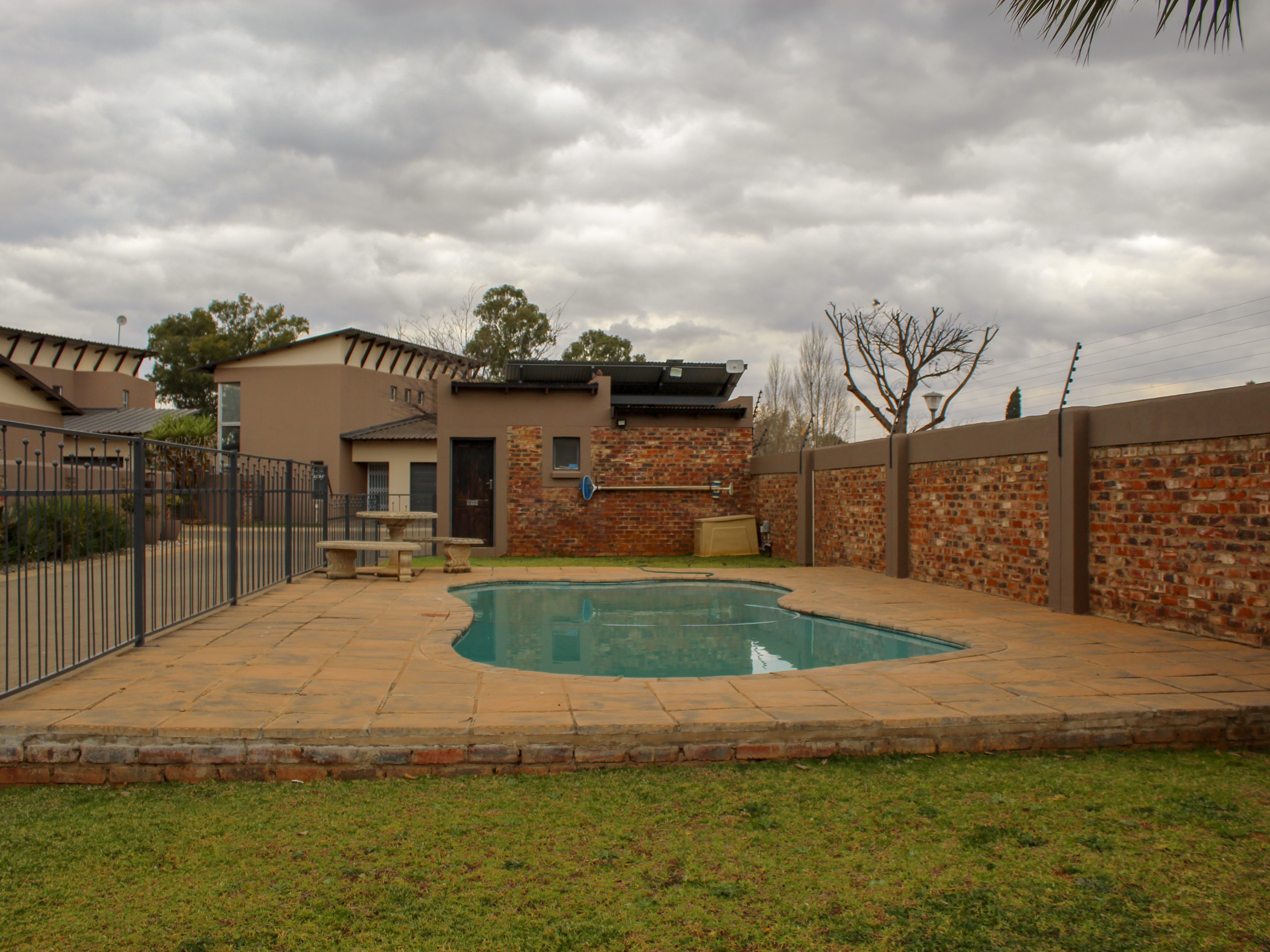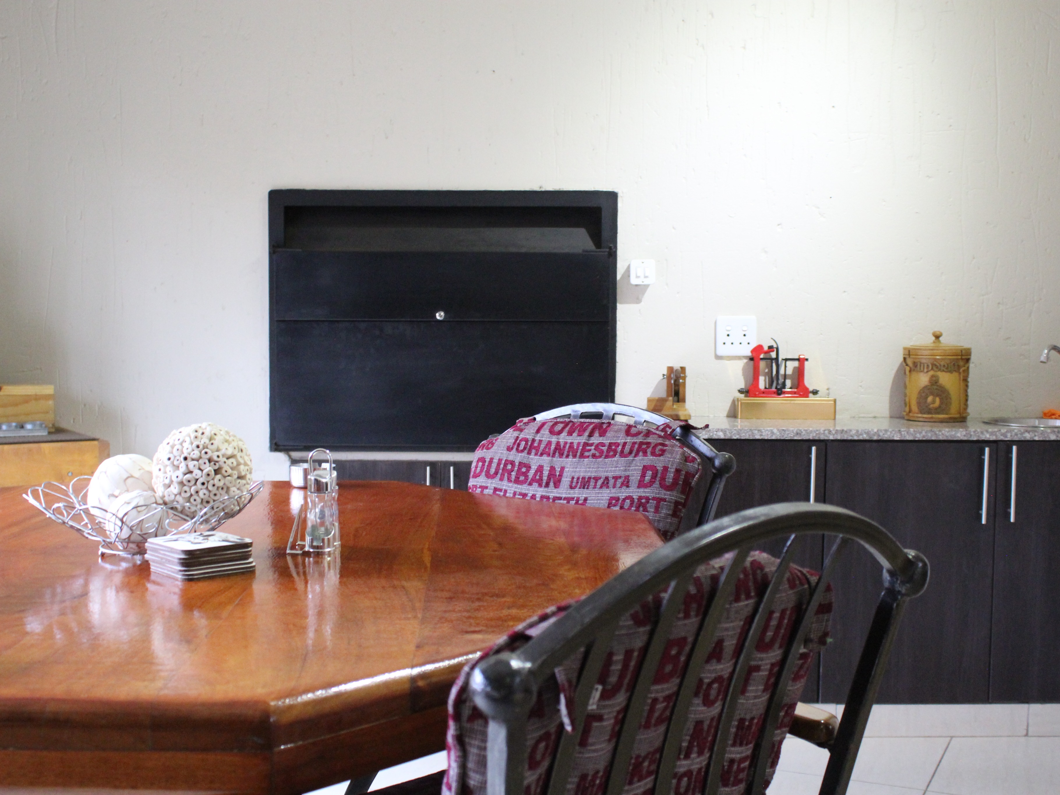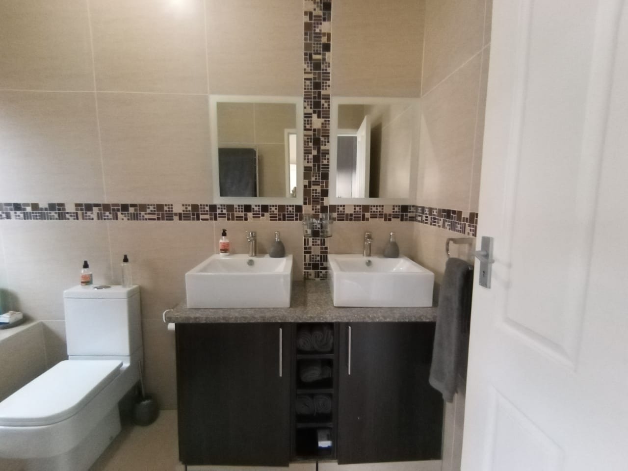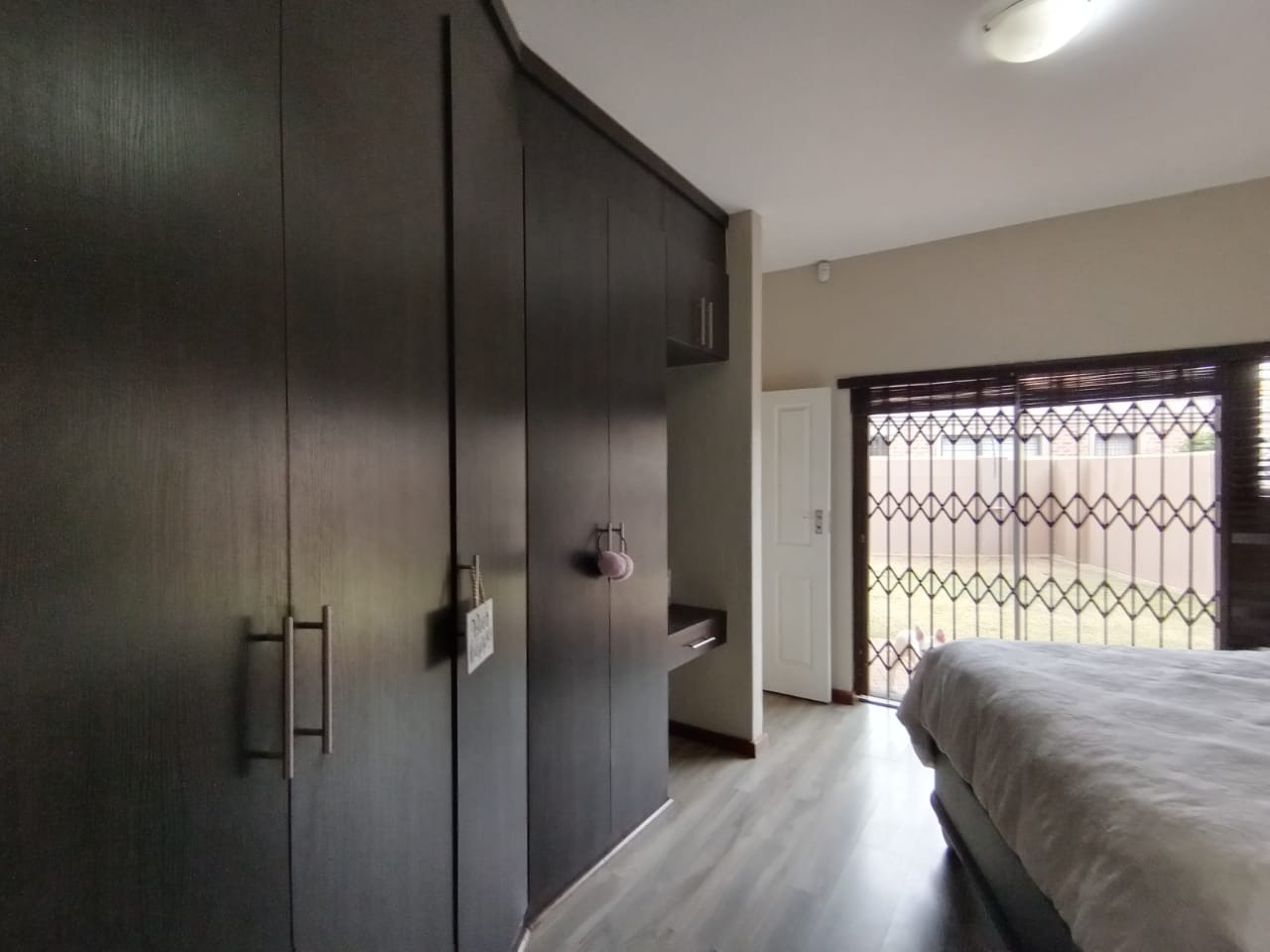 This modern double-storey home has so much to offer, including open plan living areas downstairs with tastefully finished open-plan kitchen with granite tops, oven, hob and extractor fan and separate scullery and laundry. A built-in braai with separate working space is ideally placed in the living area, with doors leading to the garden.