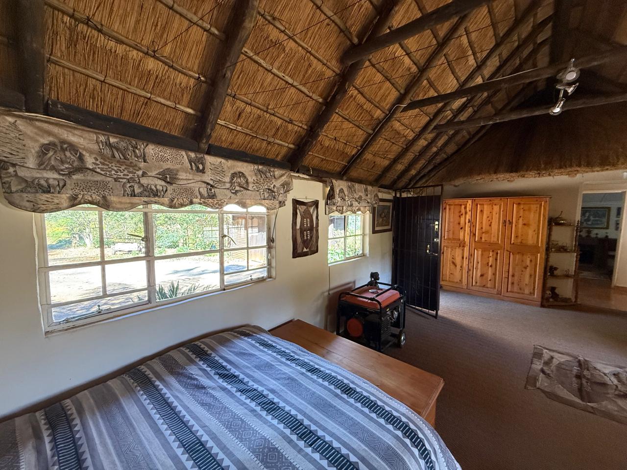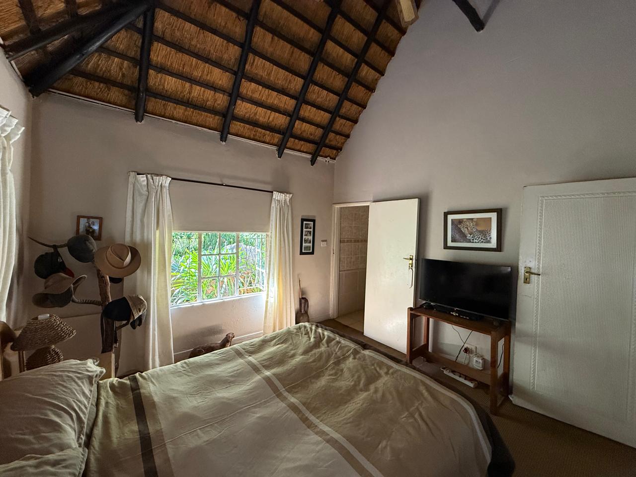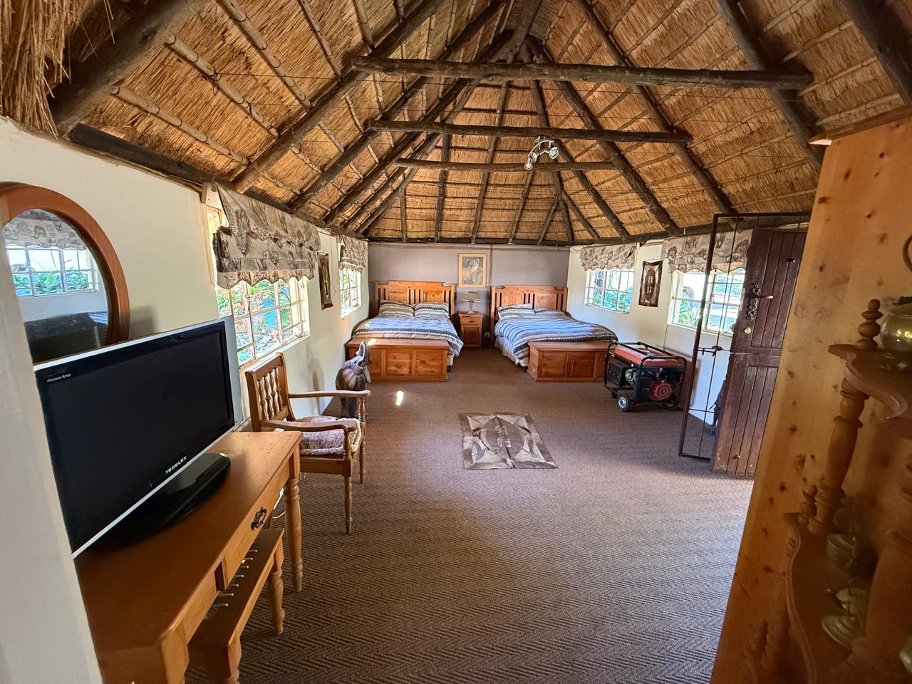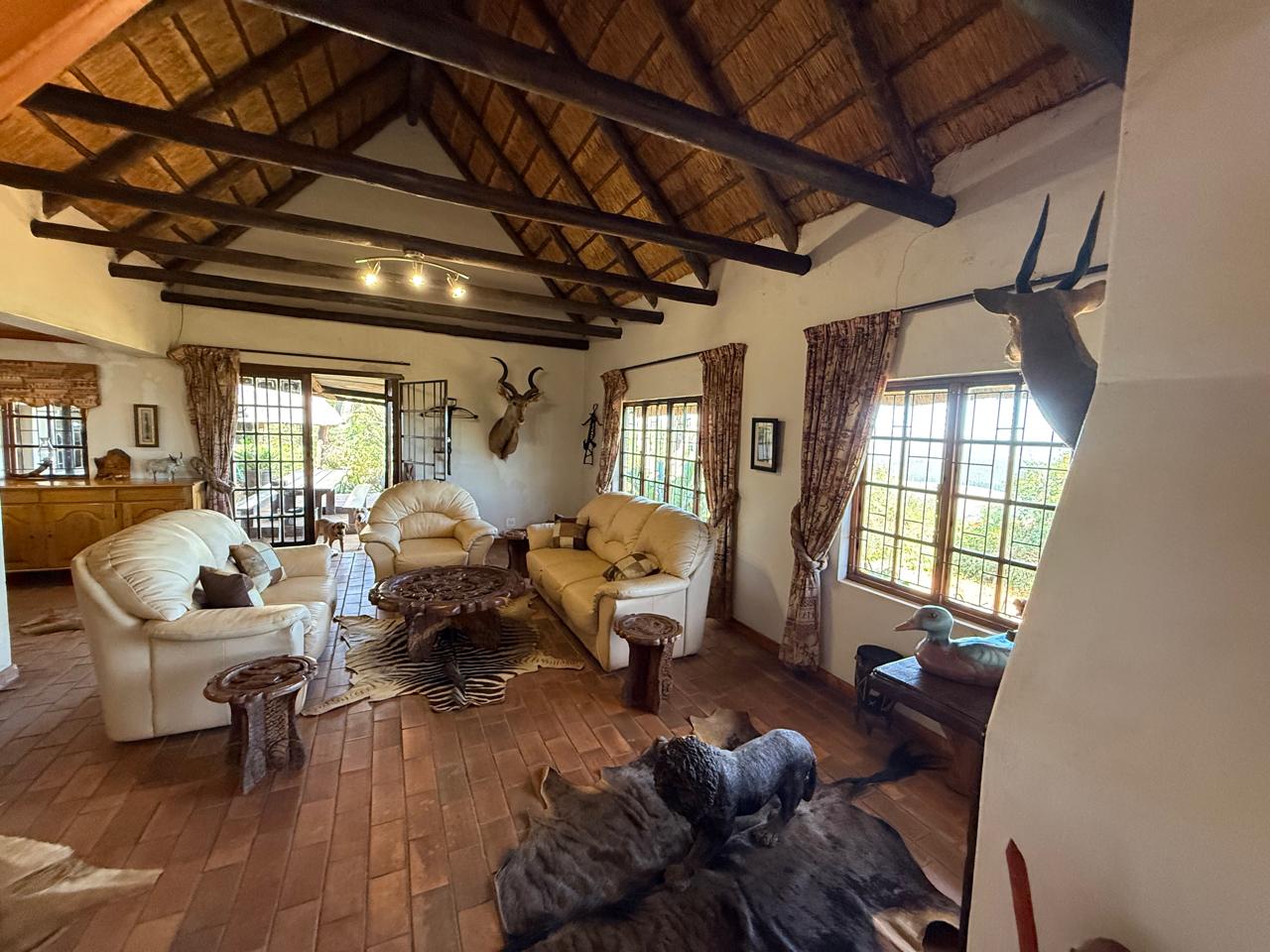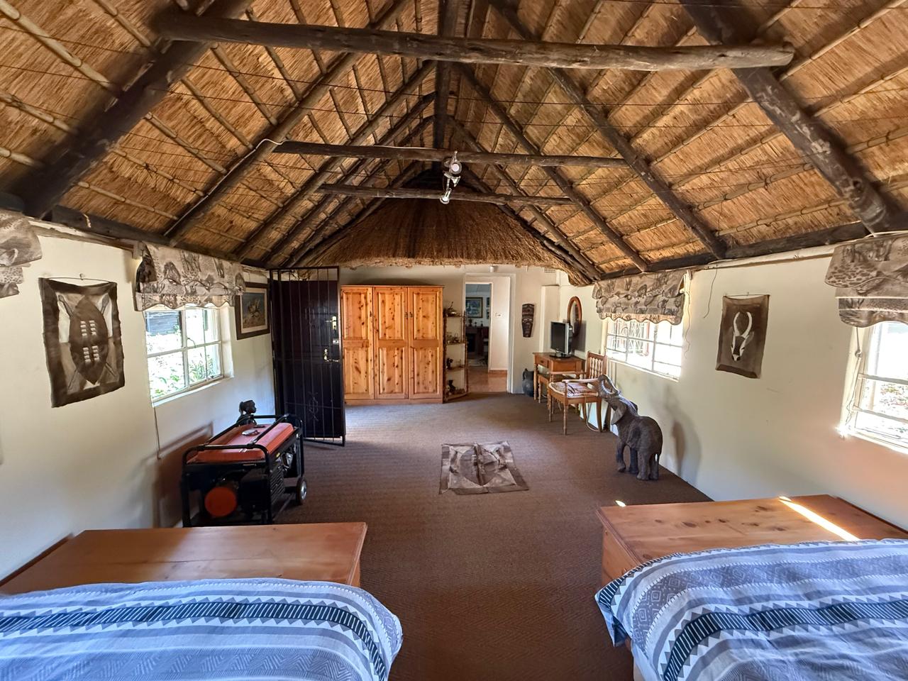Open-Plan Living & Dining - High ceilings under a characterful gum pole and thatch roof create a warm, inviting atmosphere