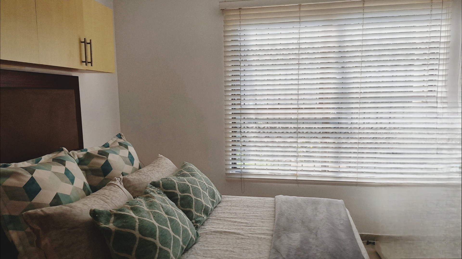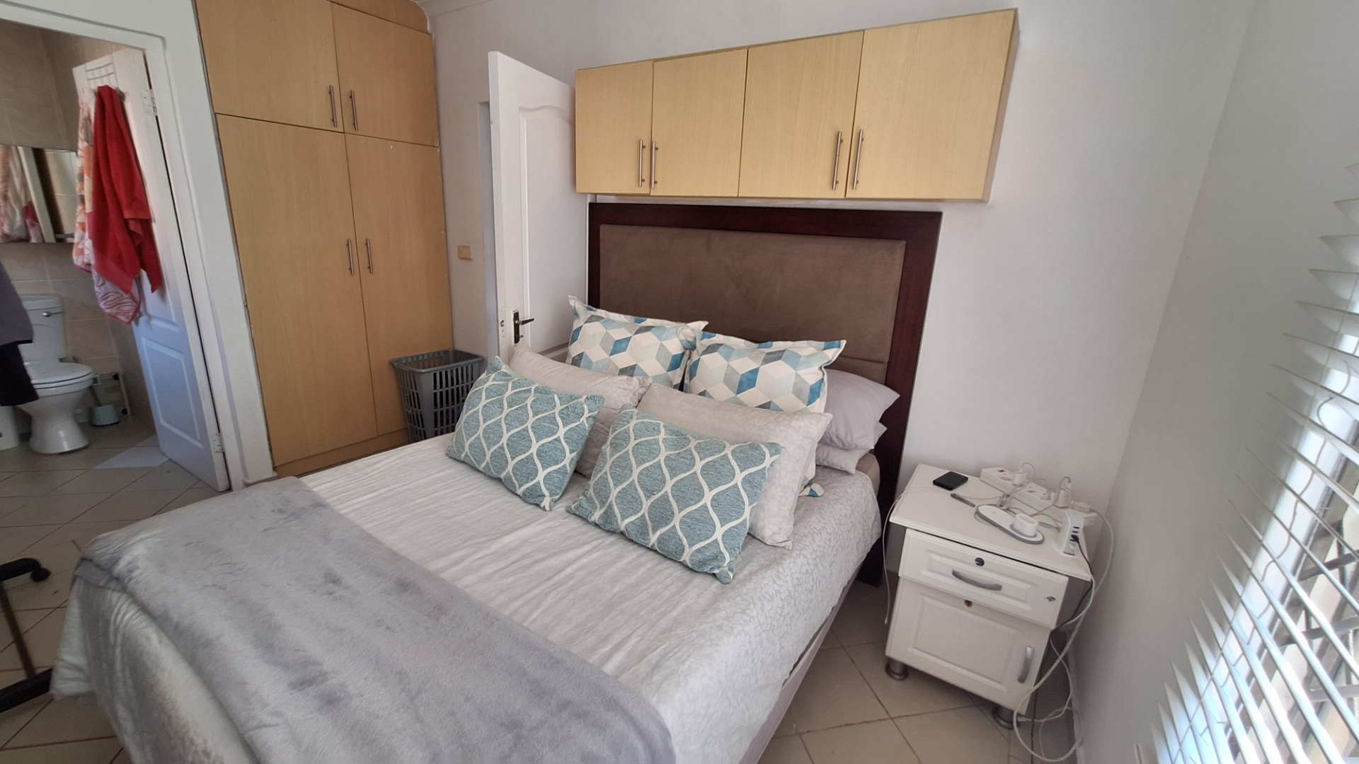 The bedroom is a serene retreat with an en-suite bathroom and built-in cupboards, offering comfort and convenience.