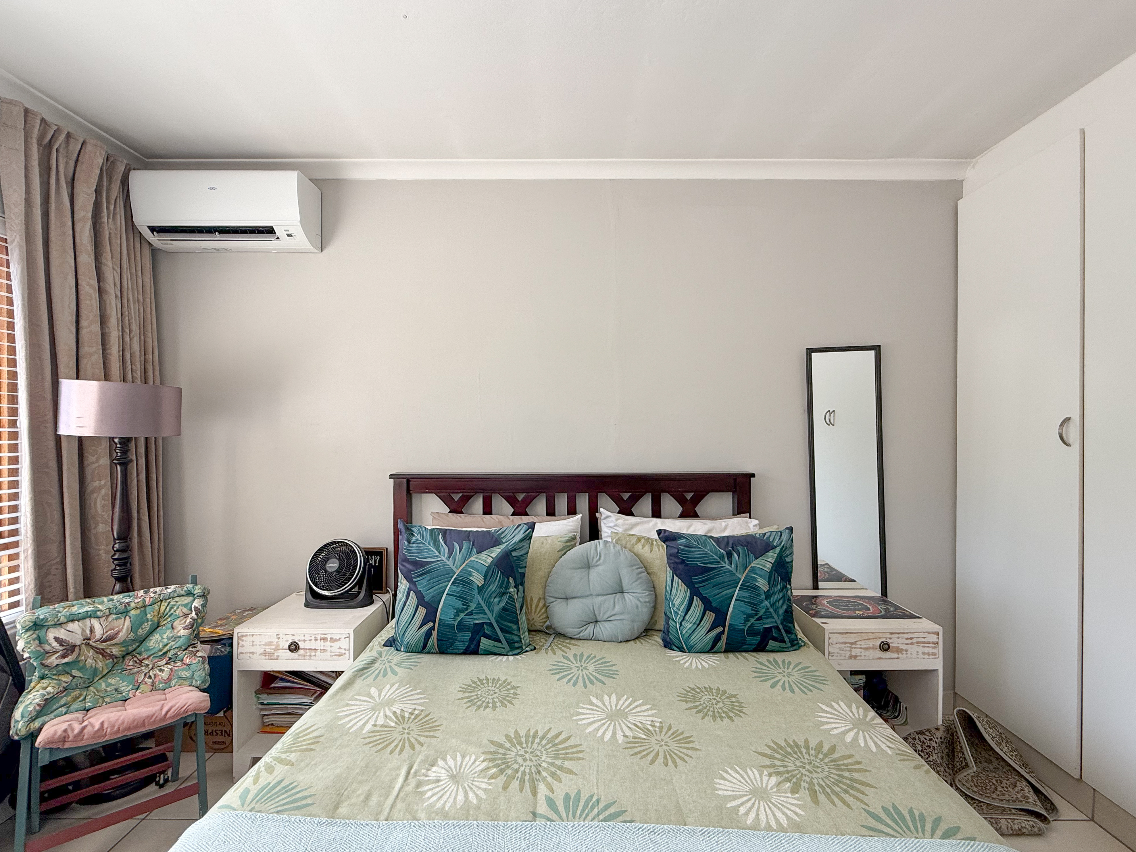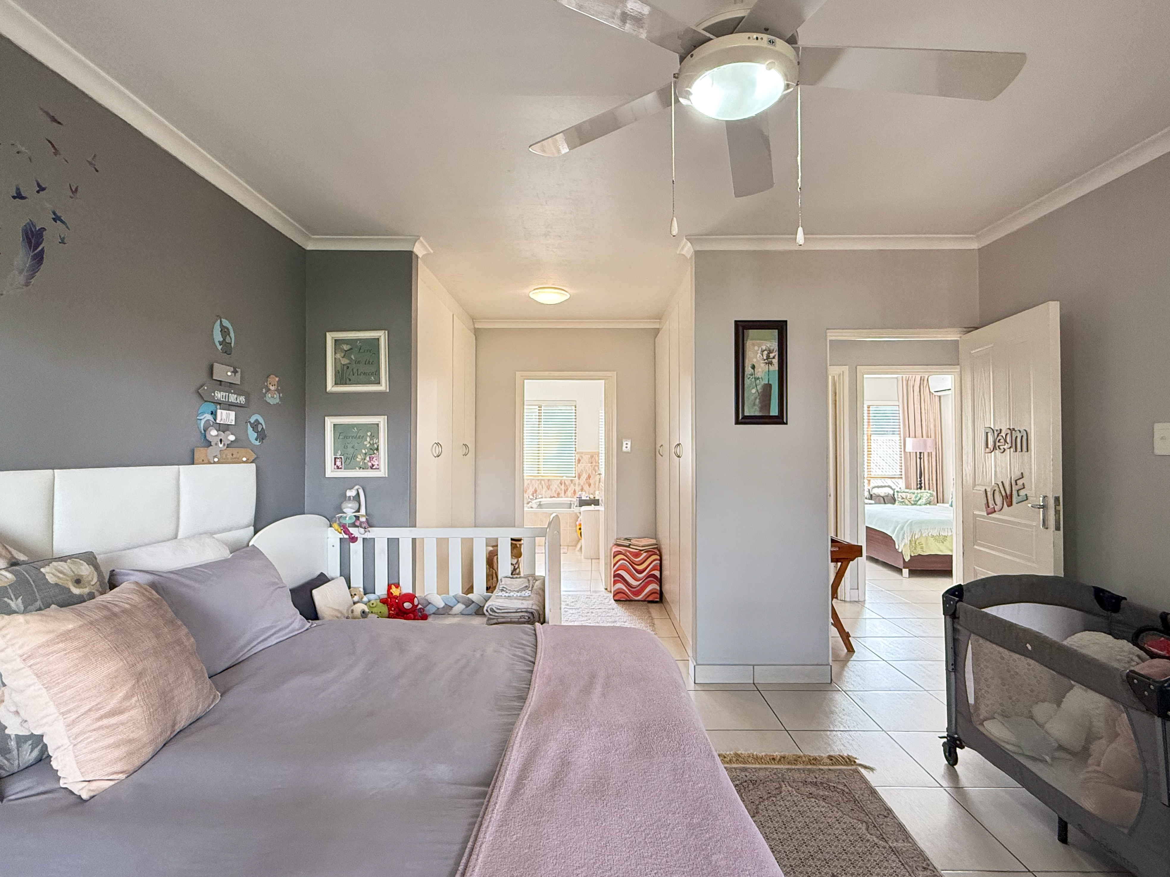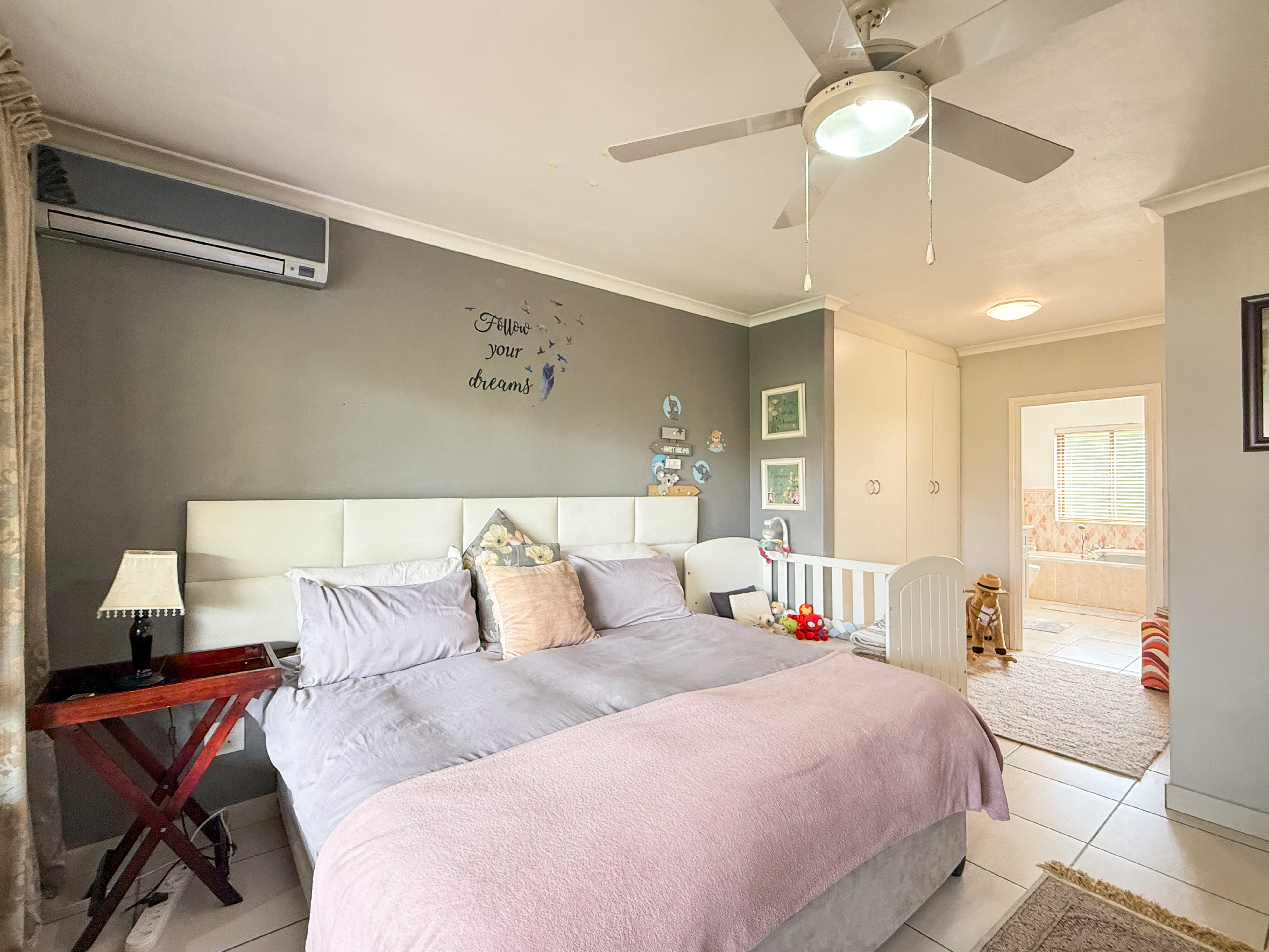 The main suite boasts a walk-in closet and chic en-suite bathroom, while the two additional bedrooms are generously sized and share a modern second bathroom. All bedrooms are fitted with air conditioning for year-round comfort.