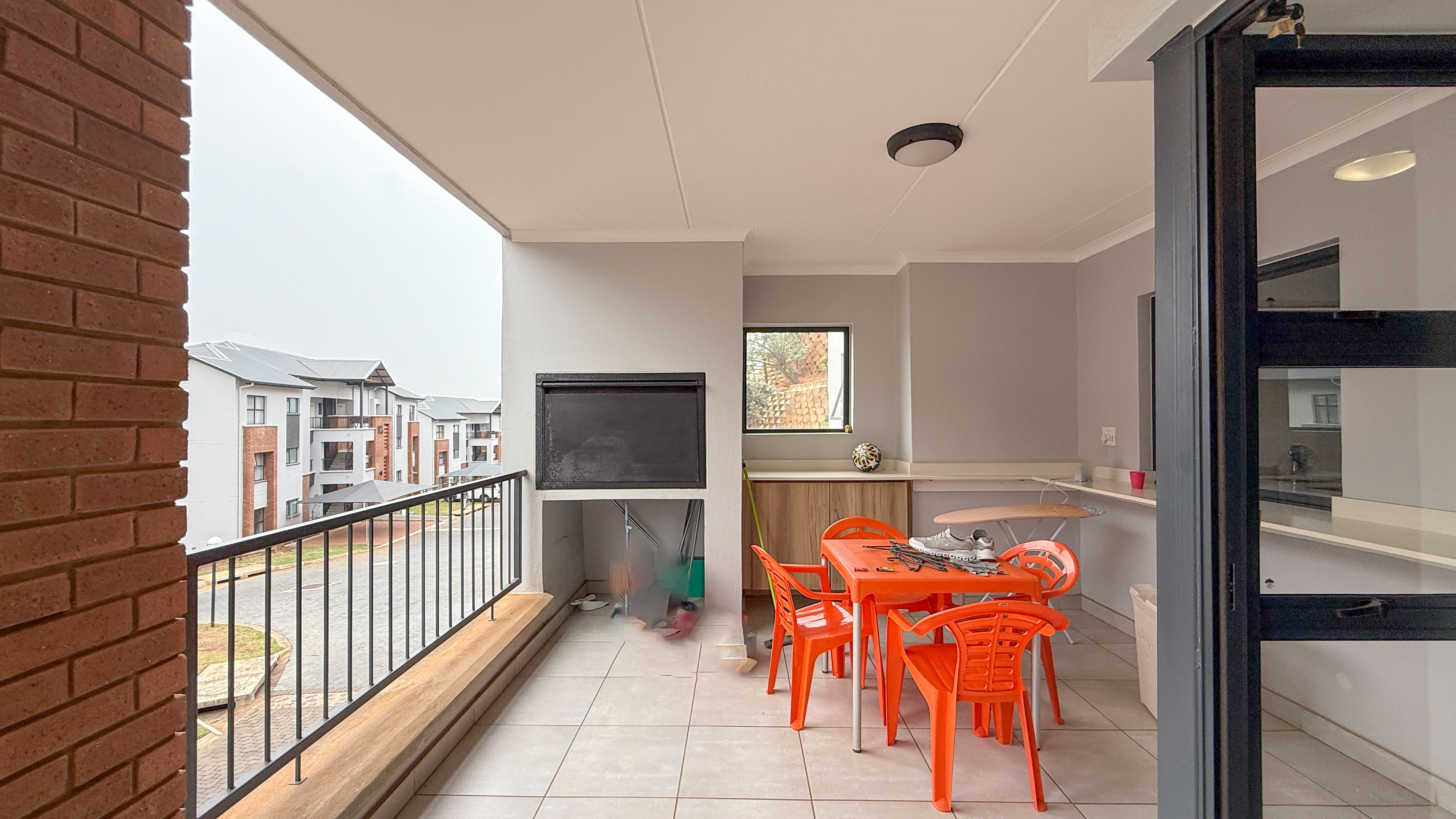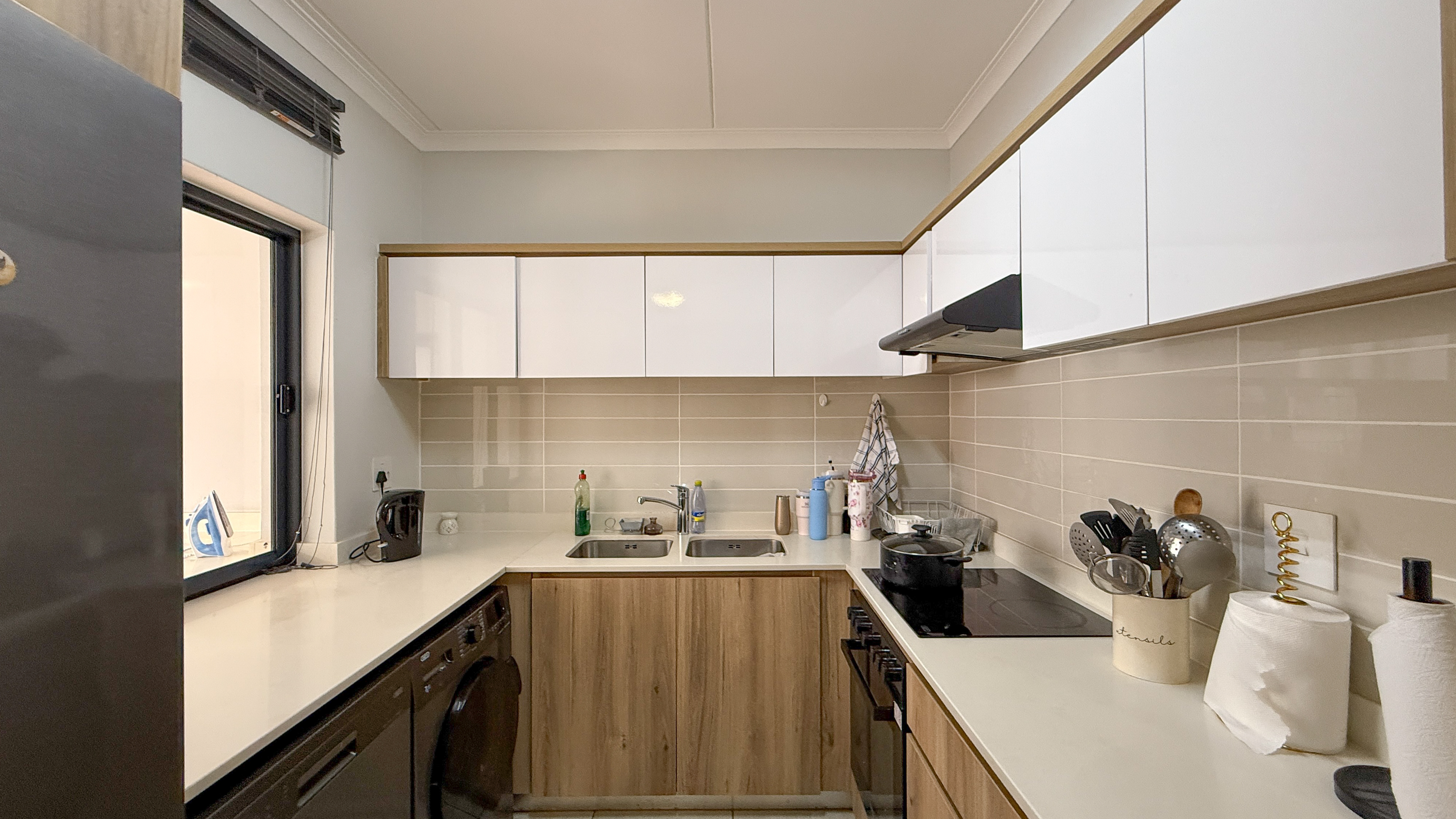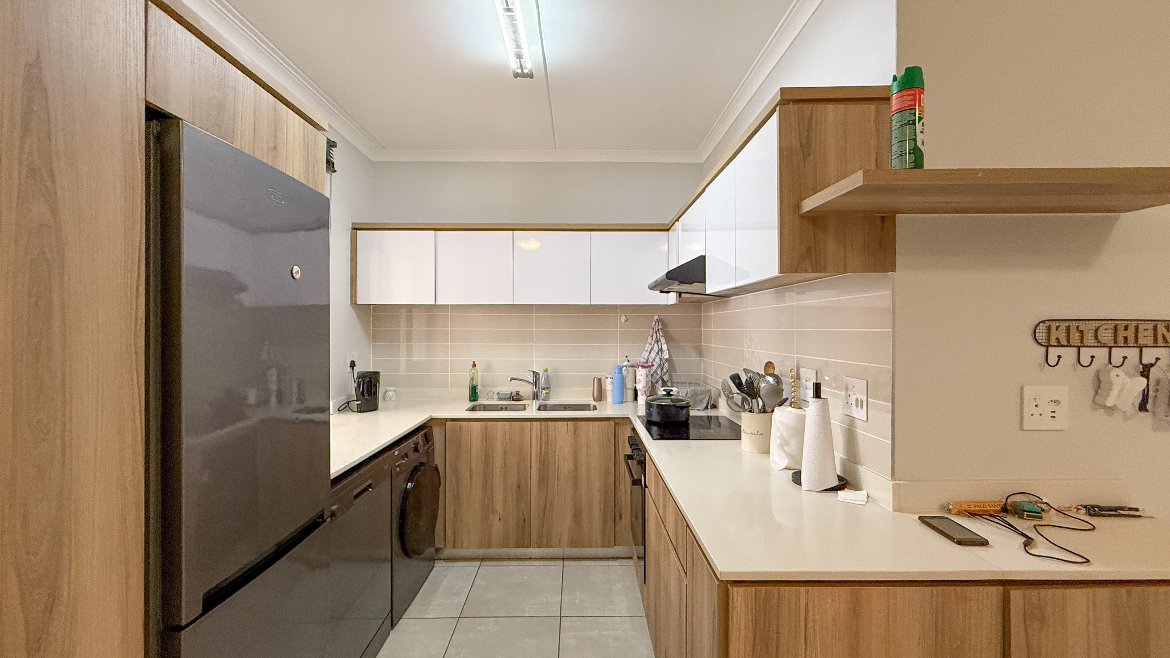 Step into this stylish apartment, welcomed by an open-plan living area and modern kitchen featuring Caesarstone countertops and all appliances included (fridge, dishwasher, and washer/dryer combo). The living space flows seamlessly onto a spacious balcony with a built-in braai — perfect for entertaining.