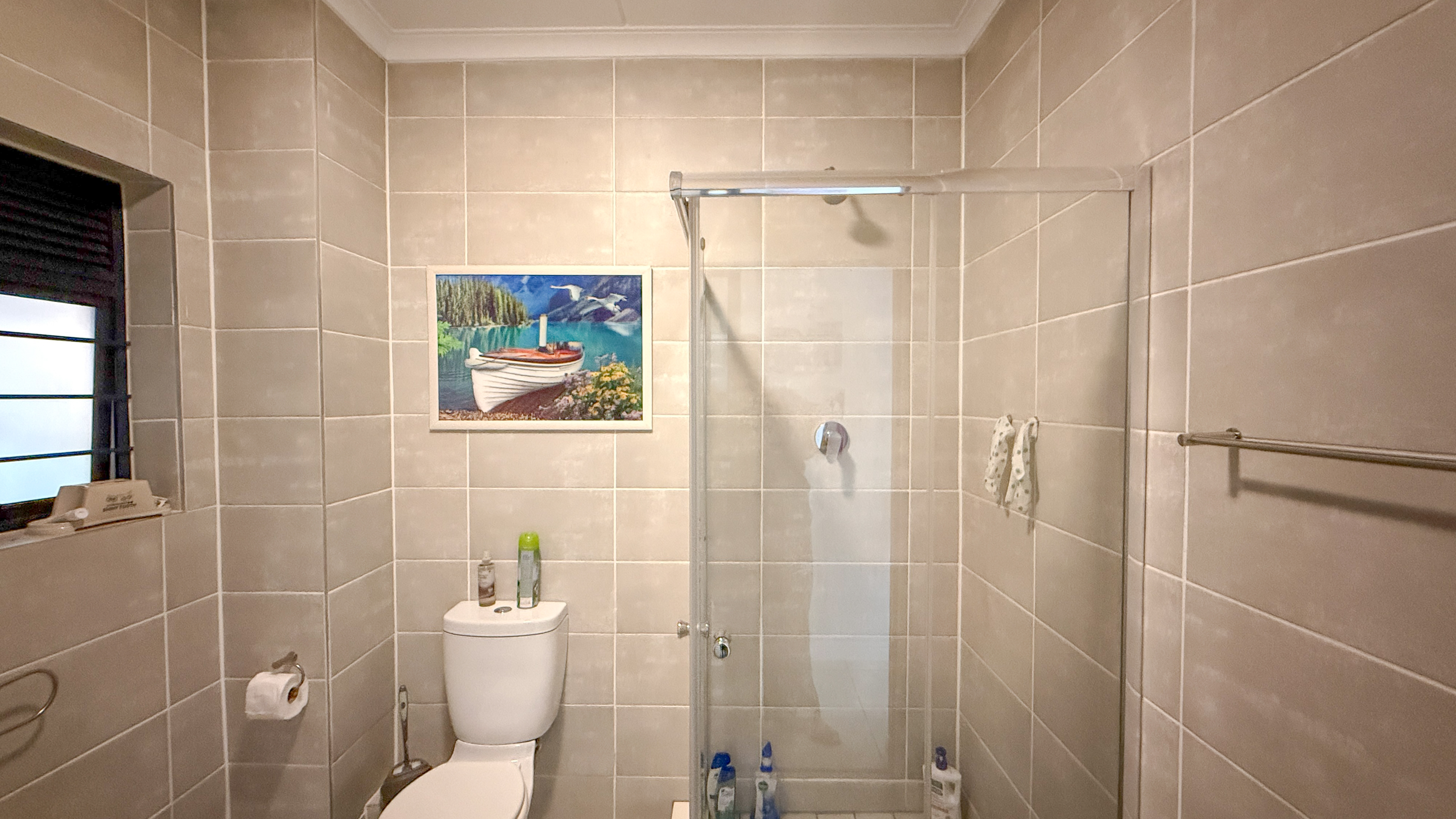 Main bedroom en-suite, with sliding doors opening onto the balcony (shower, basin, and toilet).