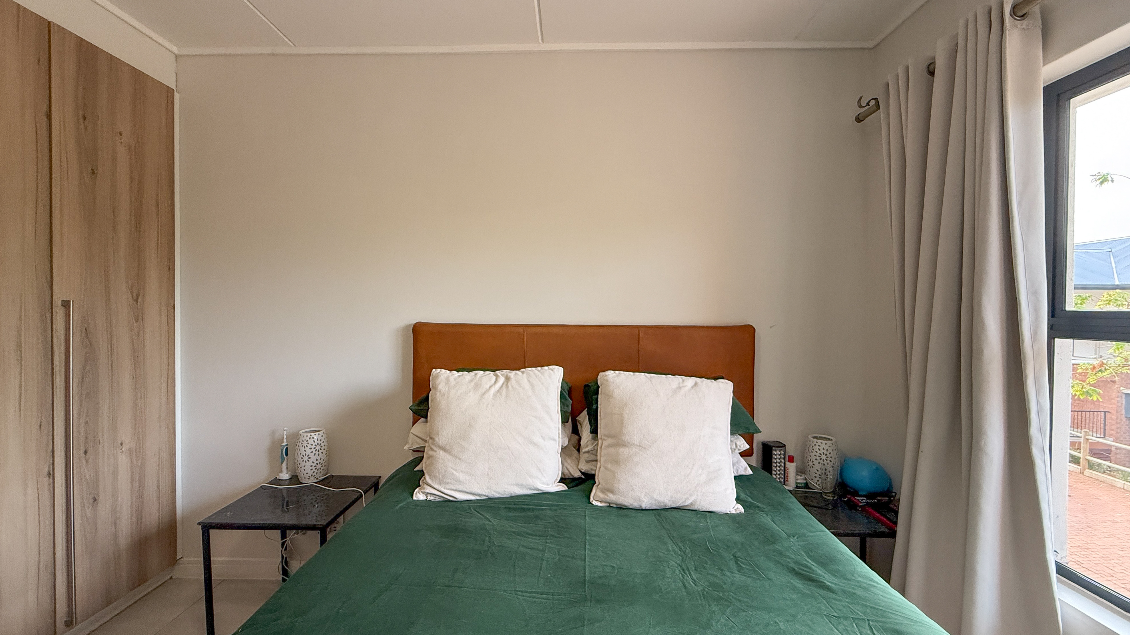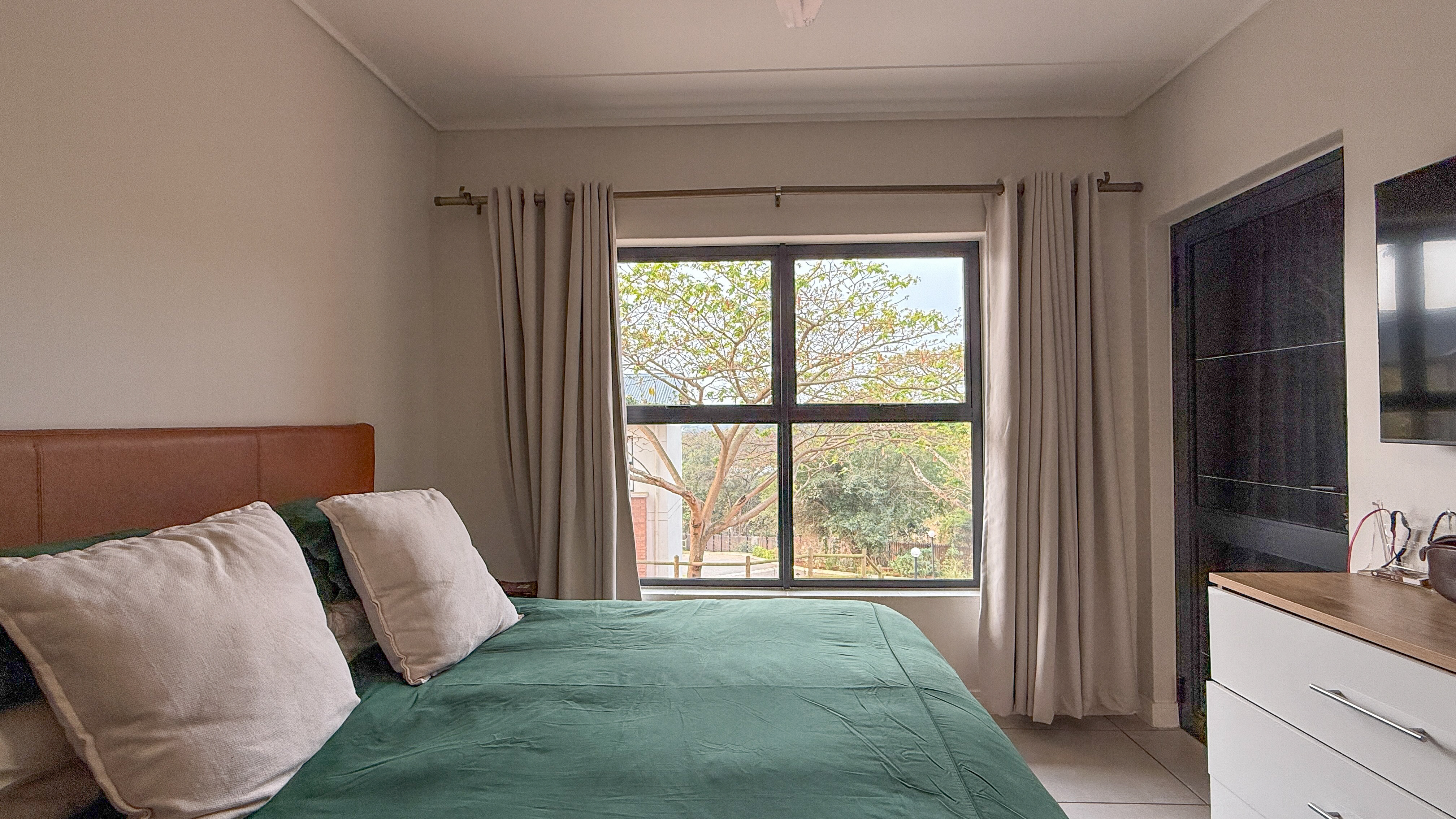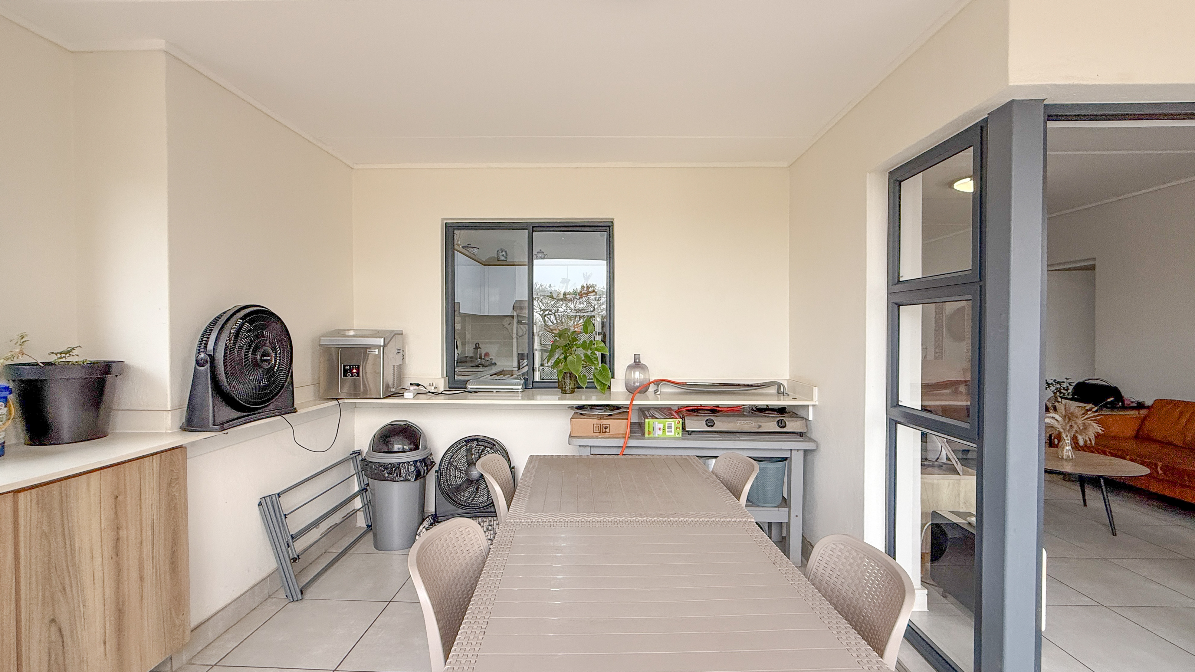 Step into this stylish apartment, welcomed by an open-plan living area and modern kitchen featuring Caesarstone countertops and all appliances included (fridge, dishwasher, and washer/dryer combo). The living space flows seamlessly onto a spacious balcony with a built-in braai — perfect for entertaining.
