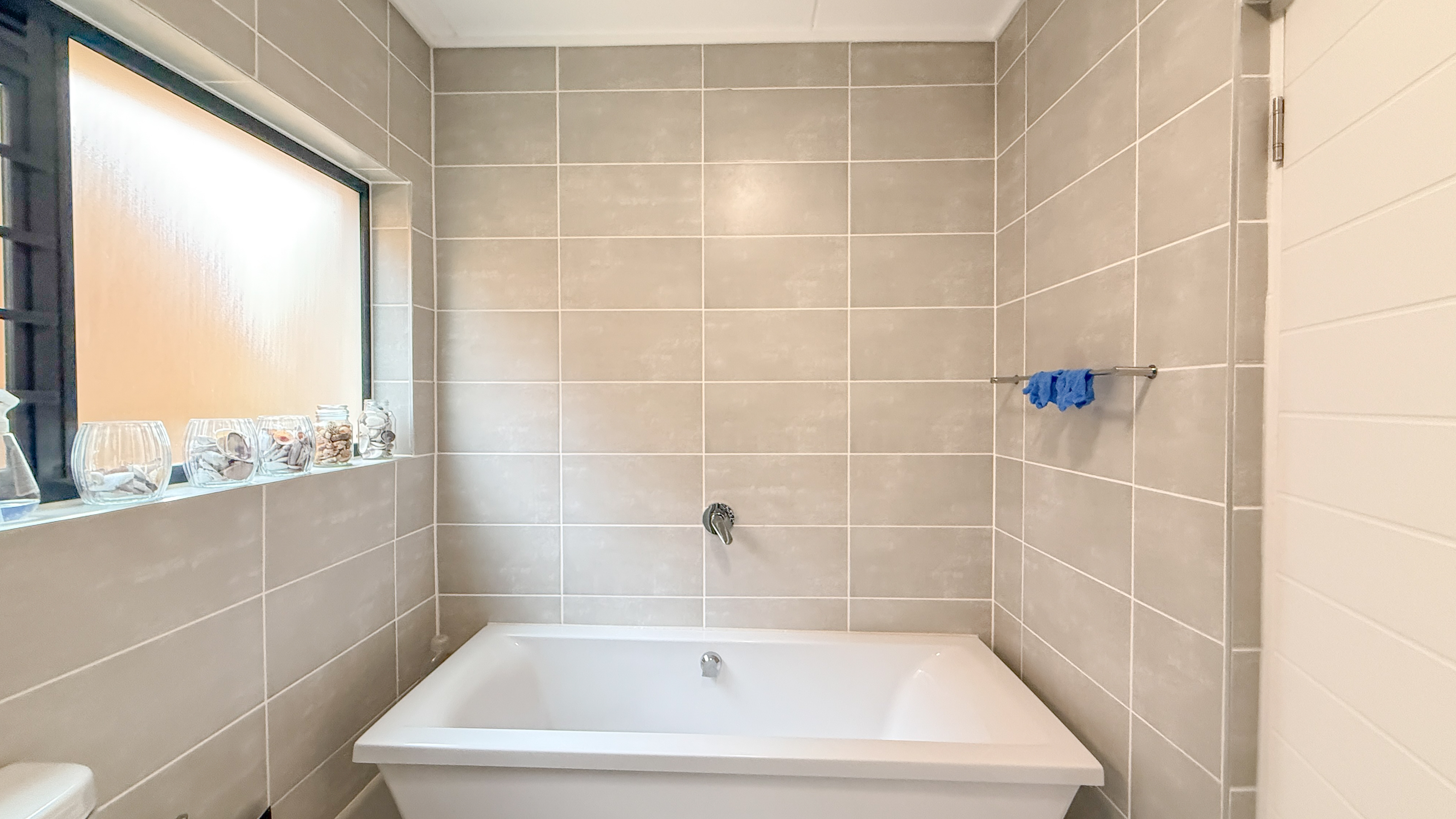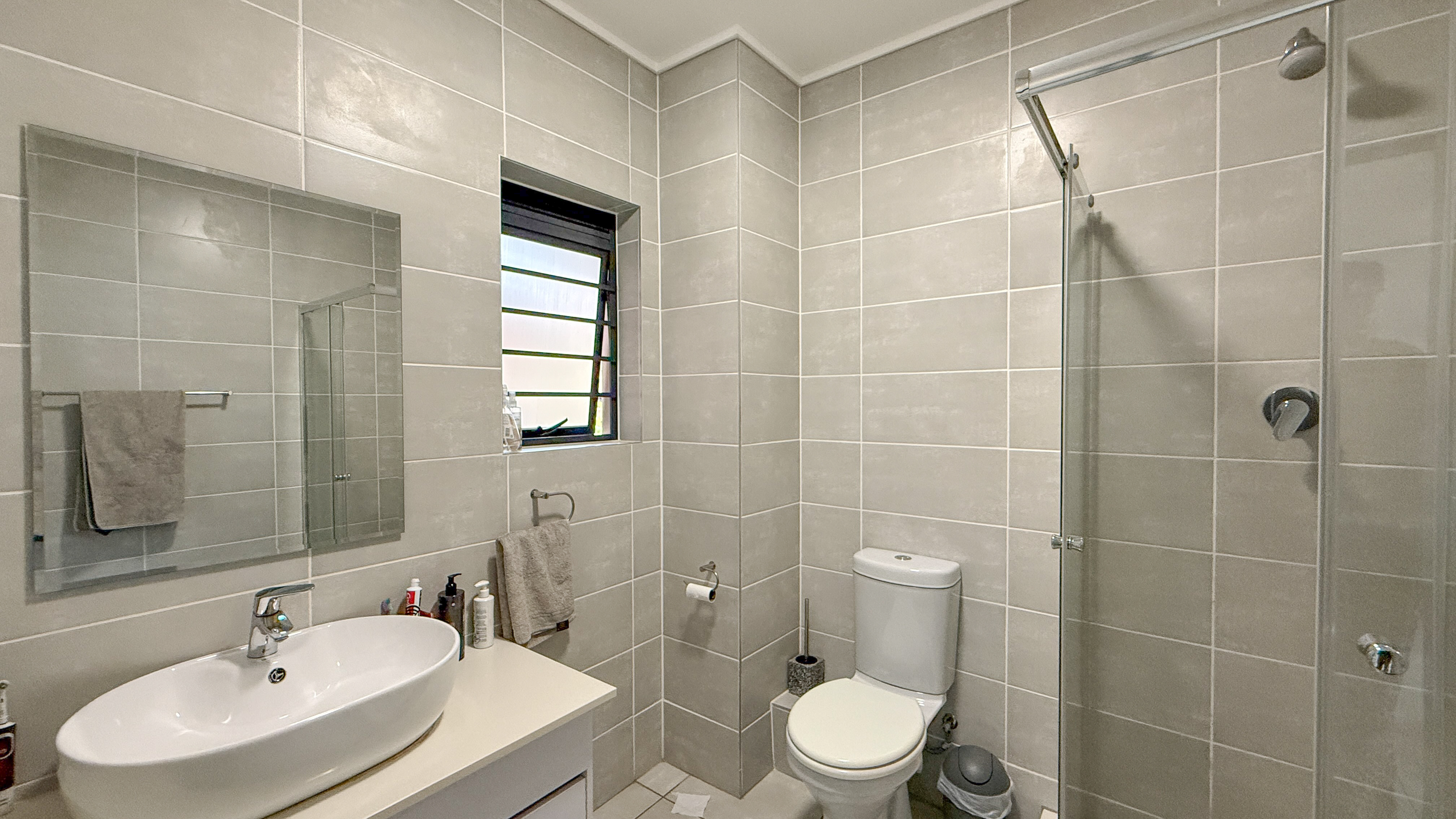 Main bedroom en-suite, with sliding doors opening onto the balcony (shower, basin, and toilet).
