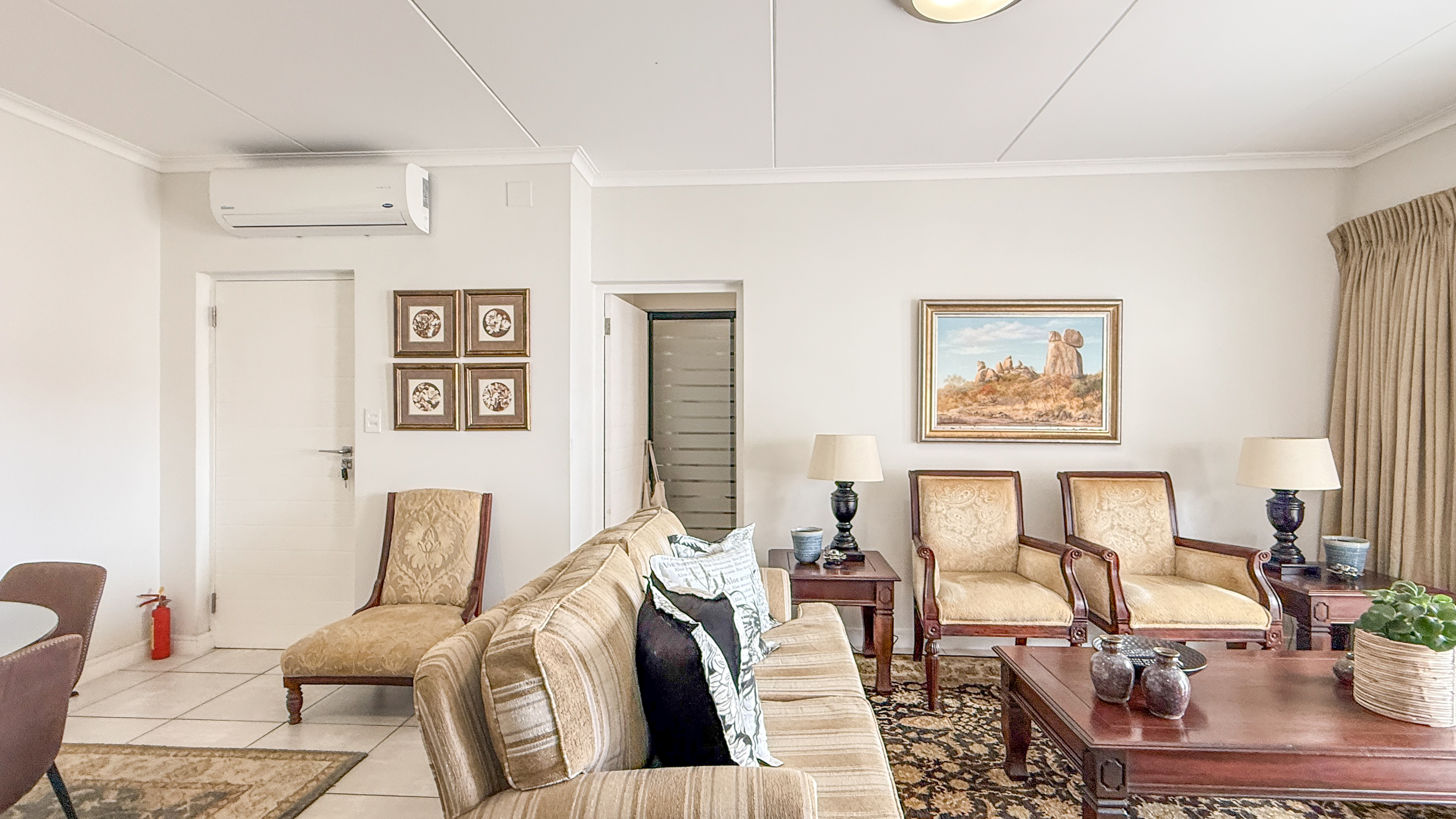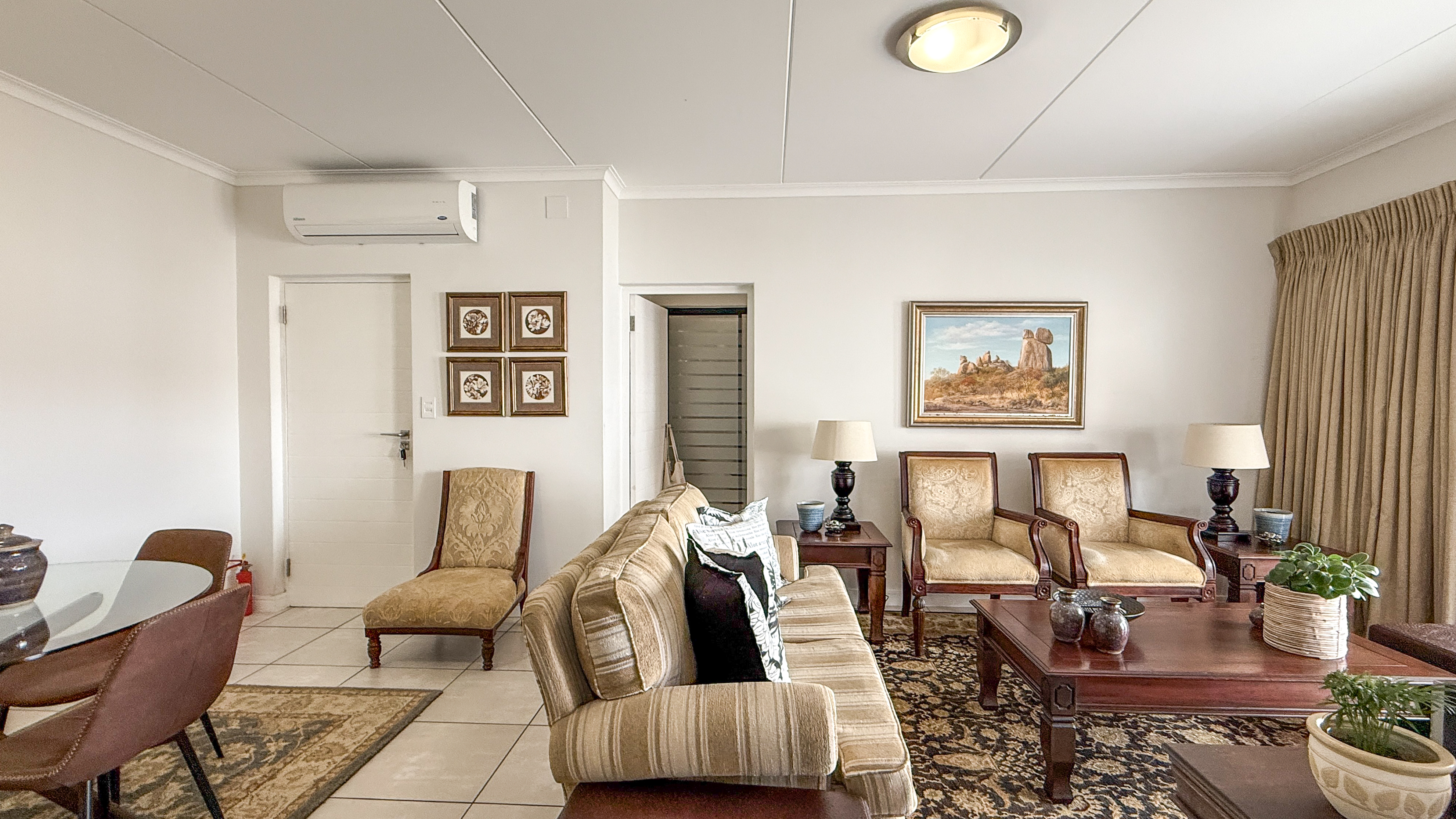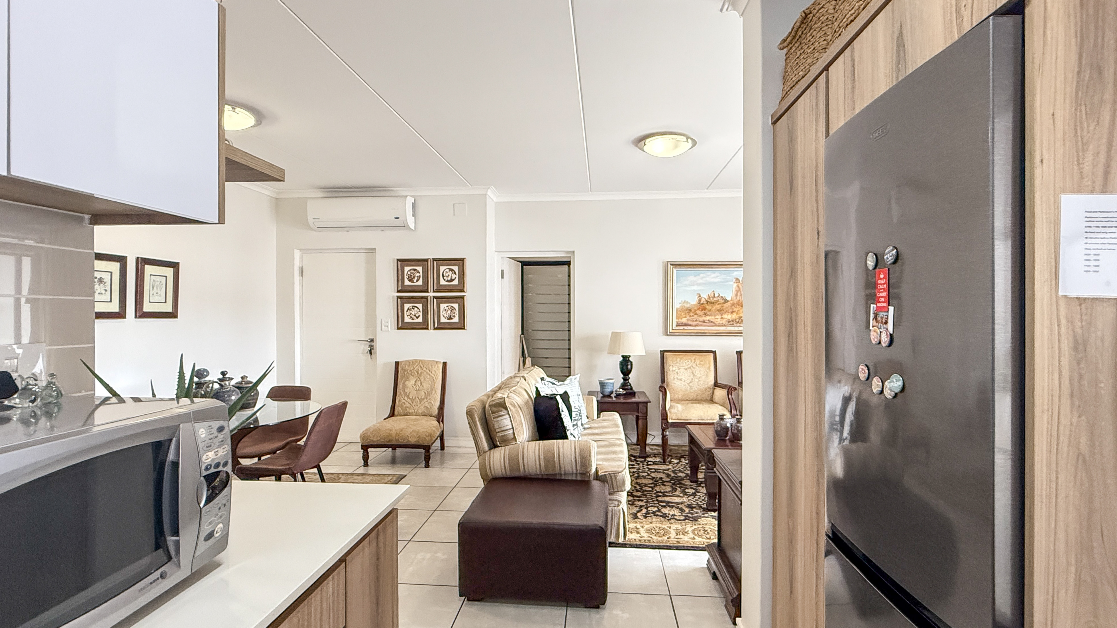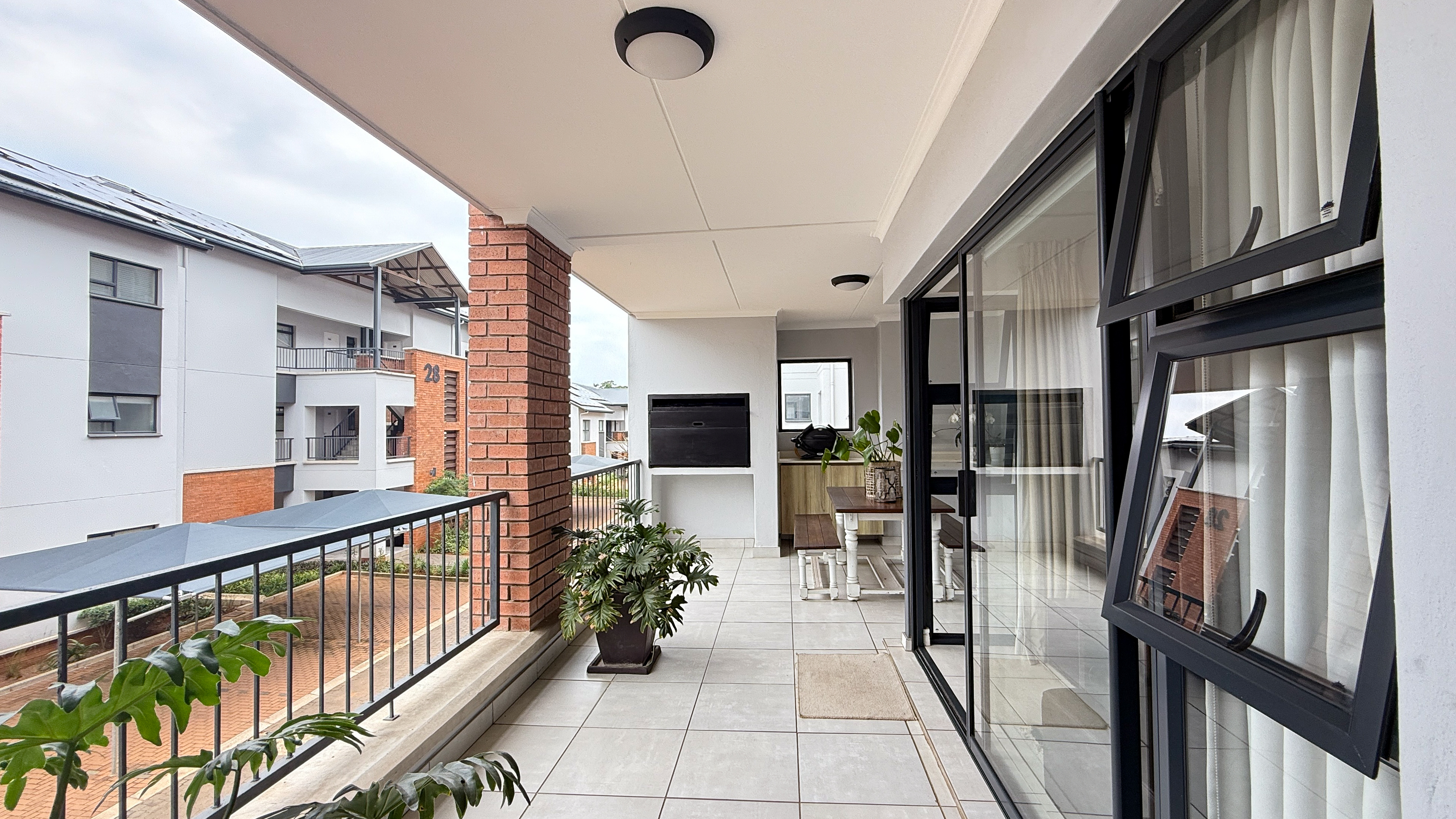 Step into this stylish apartment, welcomed by an open-plan living area and modern kitchen featuring Caesarstone countertops and all appliances included (fridge, dishwasher, and washer/dryer combo). The living space flows seamlessly onto a spacious balcony with a built-in braai — perfect for entertaining. This apartment offers privacy and tranquility due to where it is located.
