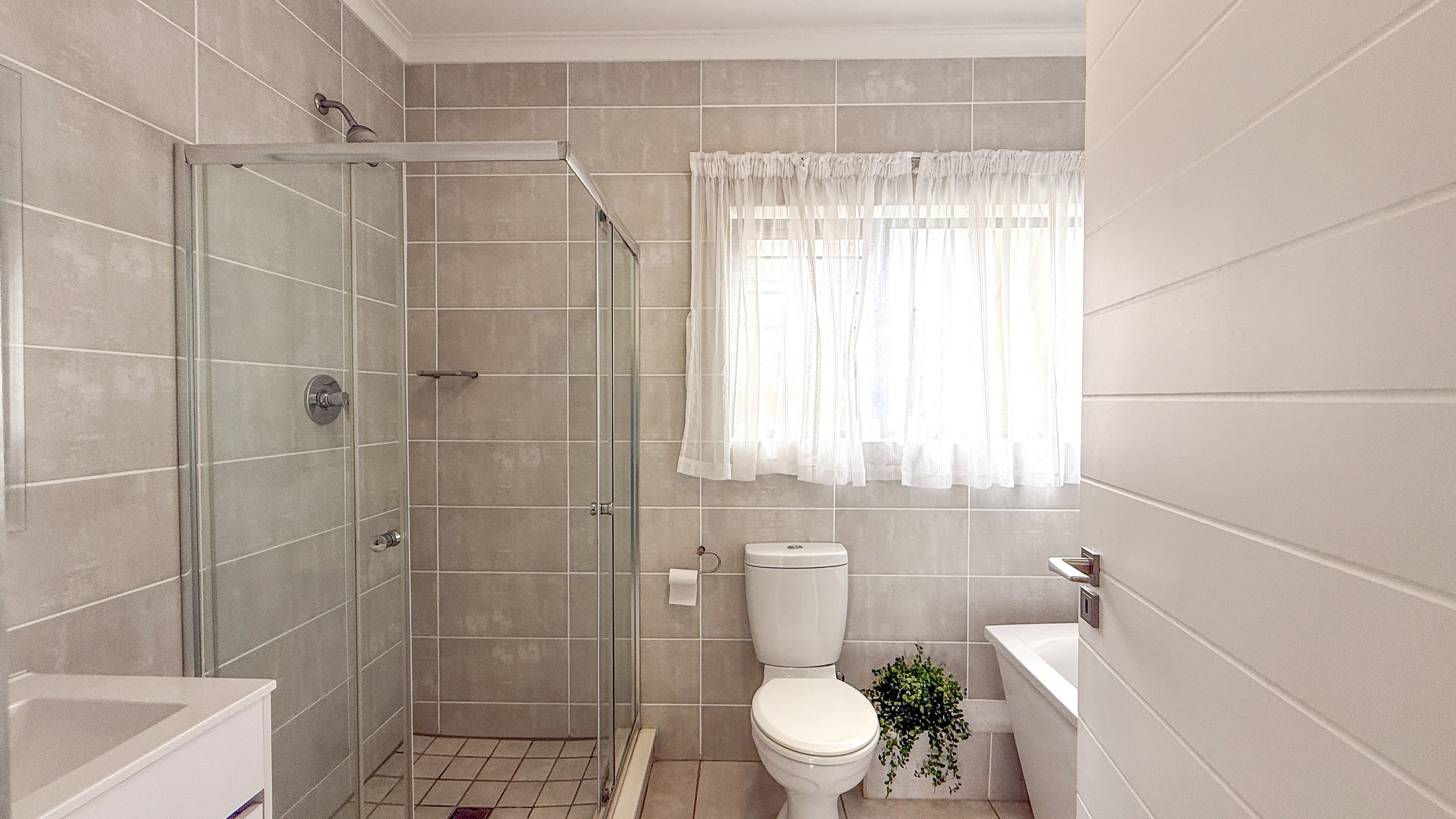 Main bedroom en-suite, with sliding doors opening onto the balcony (shower, basin, and toilet).
