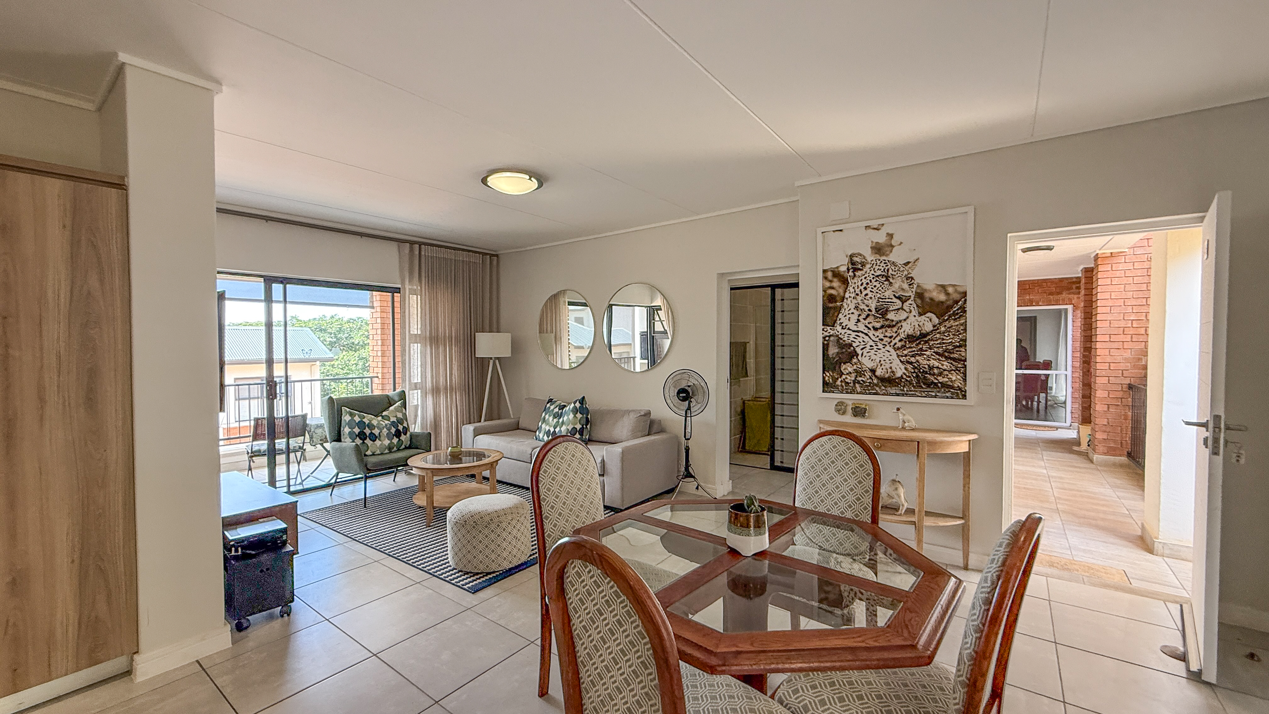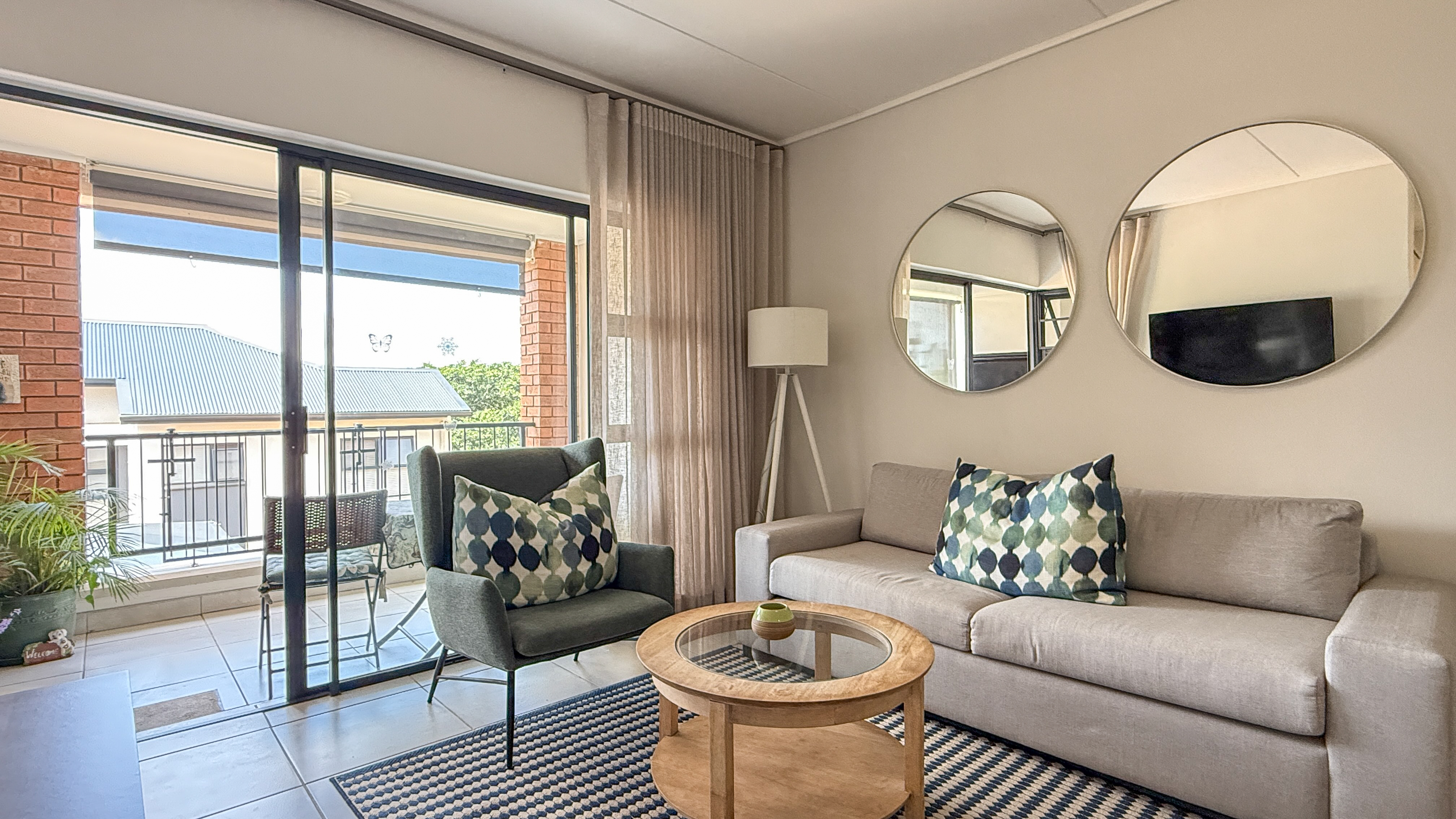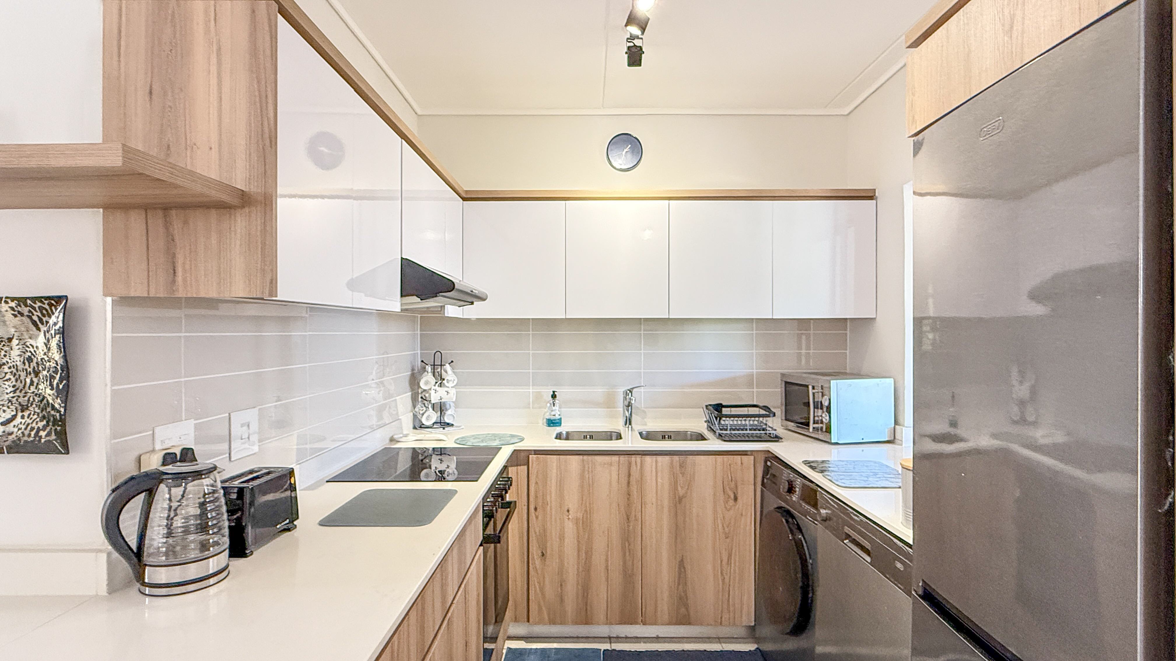 Step into this stylish and contemporary apartment, welcomed by an open-plan living area and modern kitchen featuring Caesarstone countertops and quality appliances, including a fridge, dishwasher, and washer/dryer combo. The living space flows seamlessly onto a spacious balcony with a built-in braai — perfect for entertaining or relaxing.