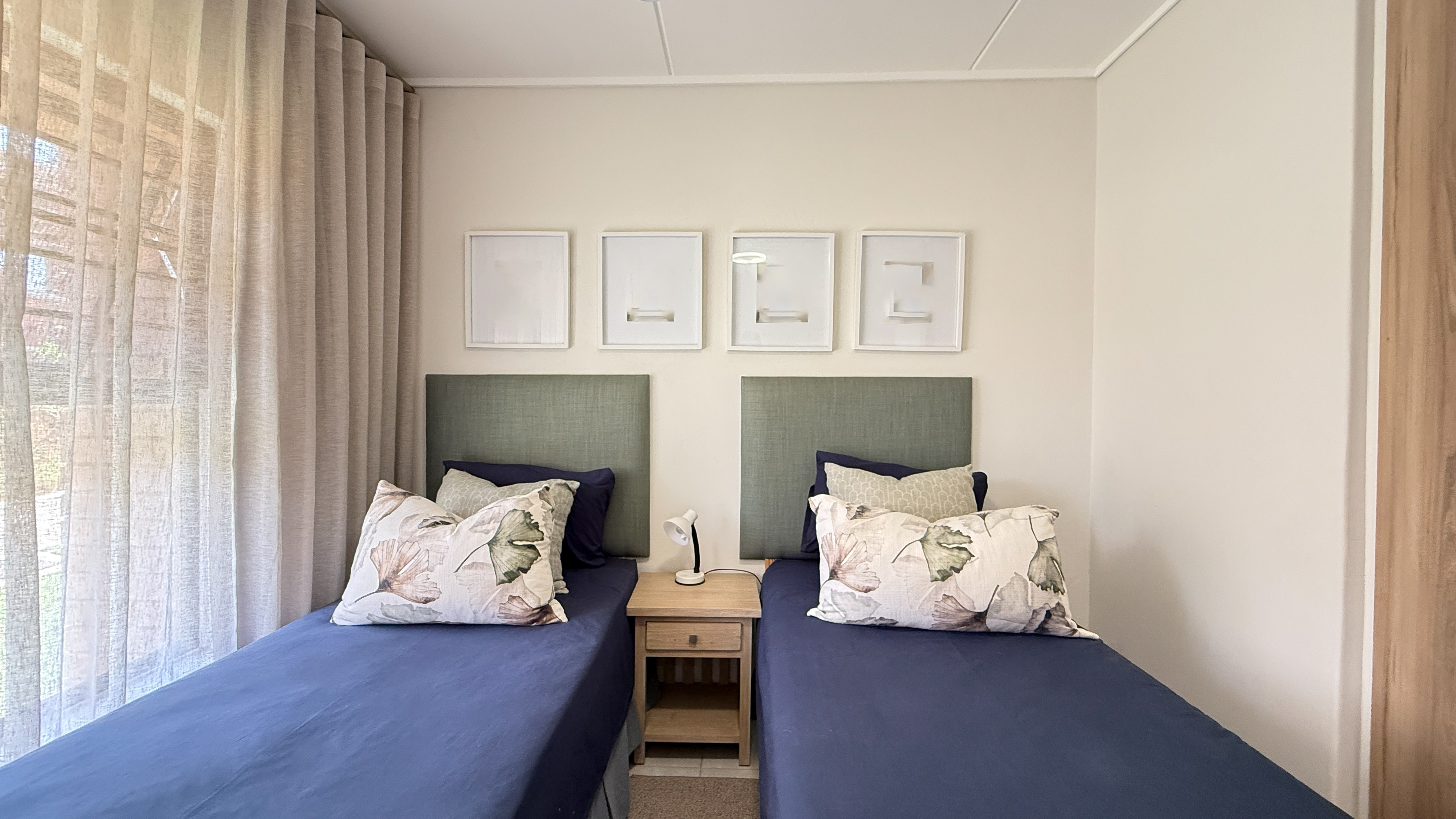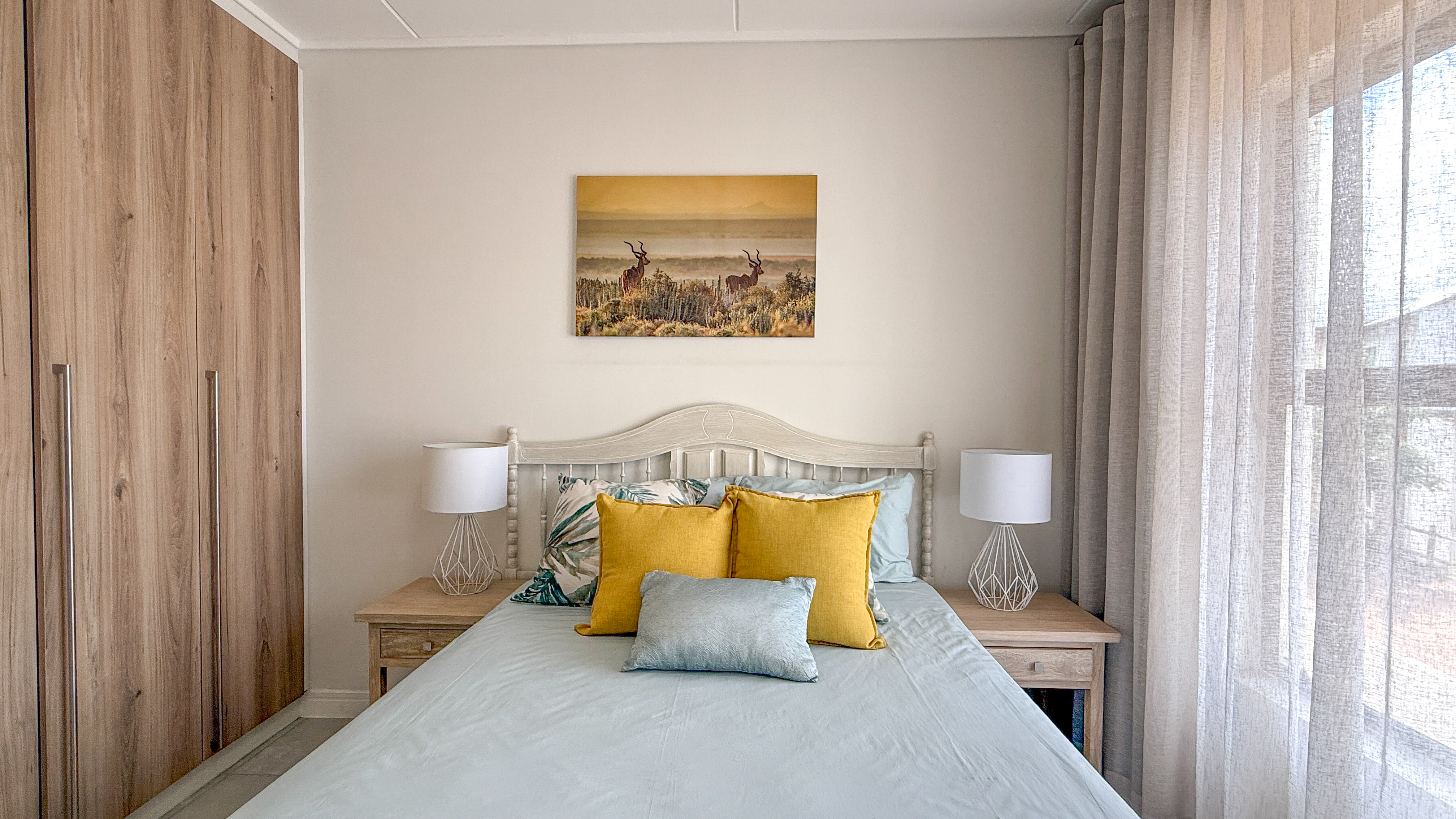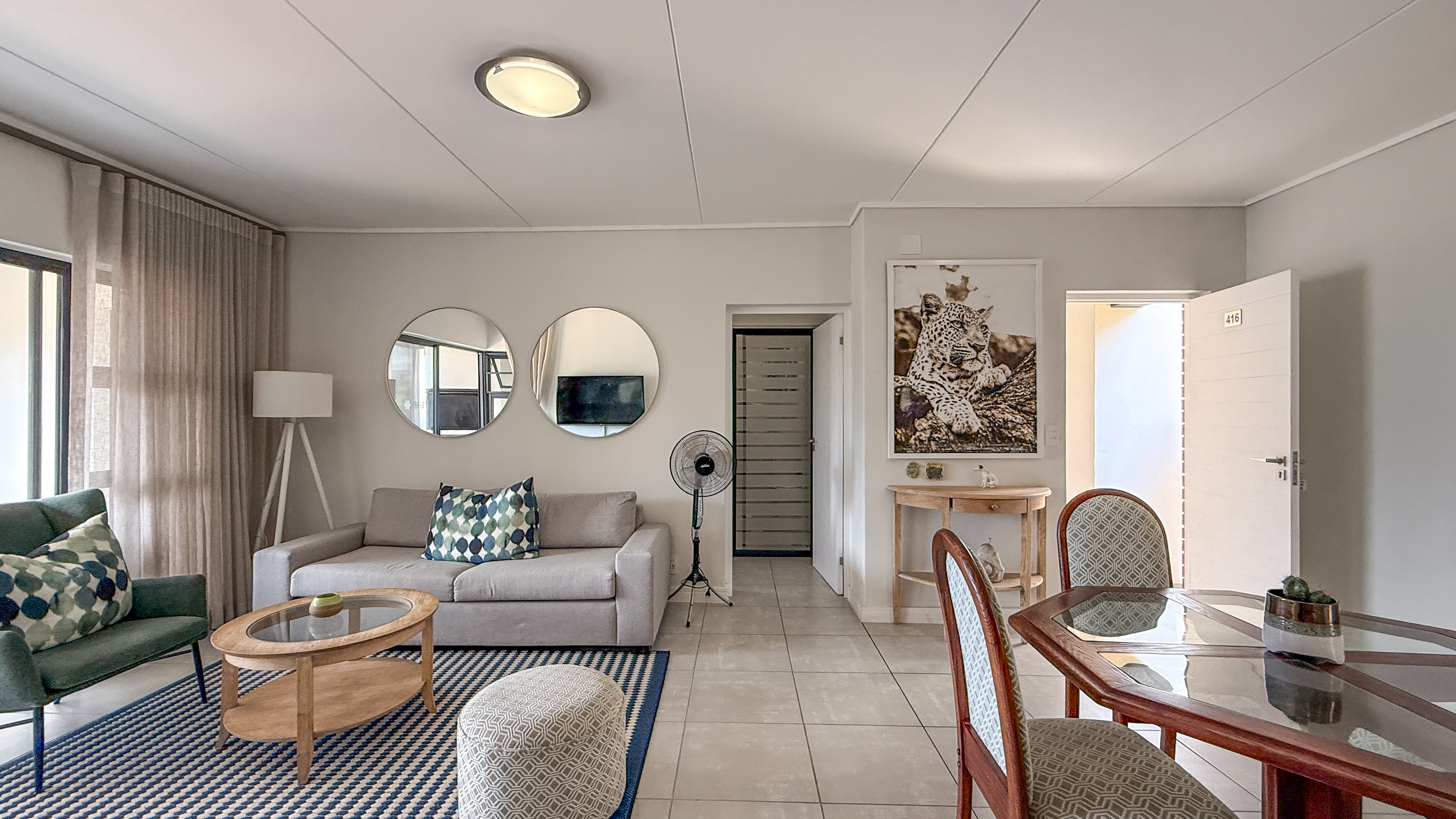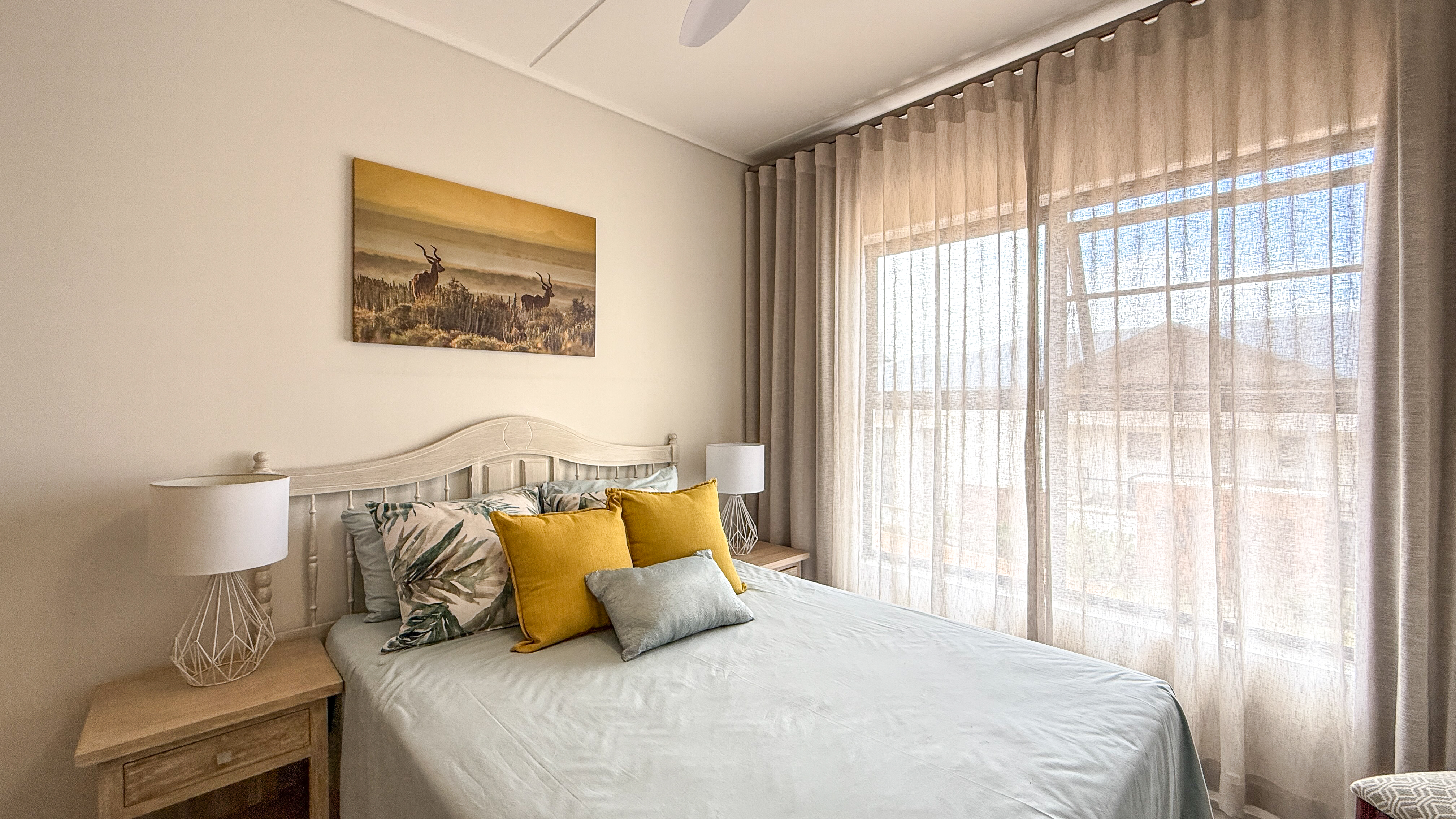 Step into this stylish and contemporary apartment, welcomed by an open-plan living area and modern kitchen featuring Caesarstone countertops and quality appliances, including a fridge, dishwasher, and washer/dryer combo. The living space flows seamlessly onto a spacious balcony with a built-in braai — perfect for entertaining or relaxing.