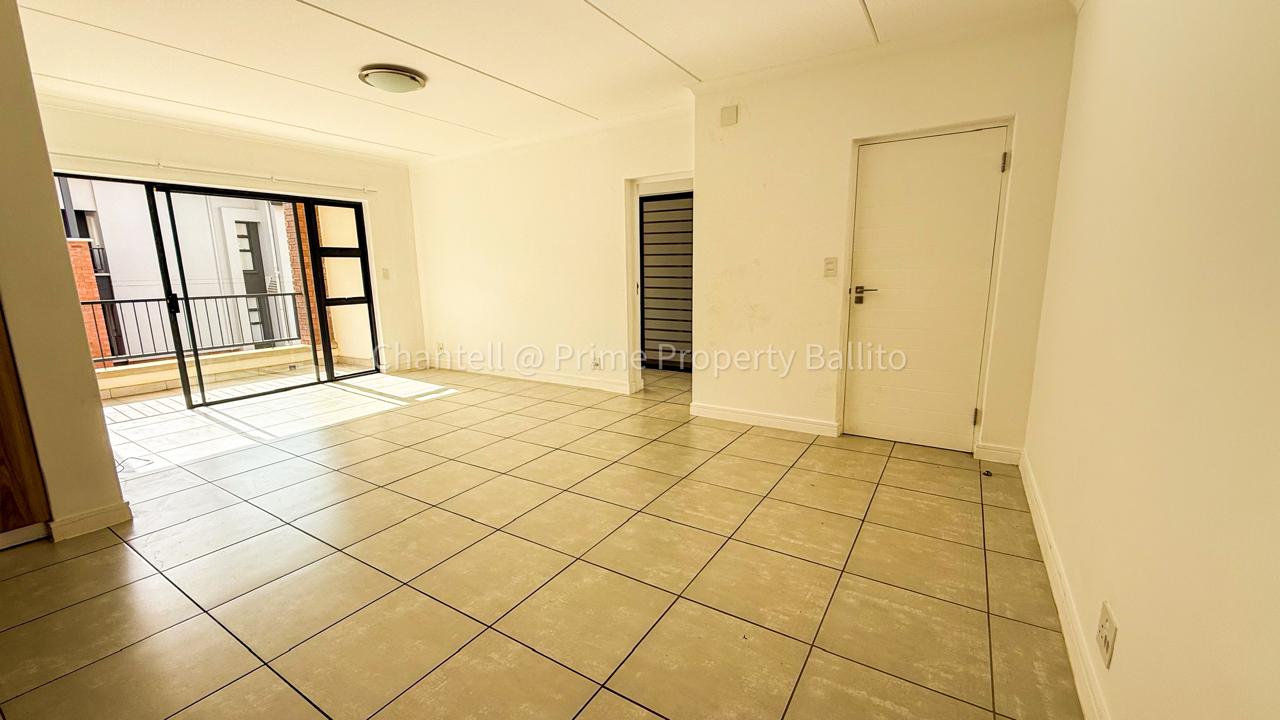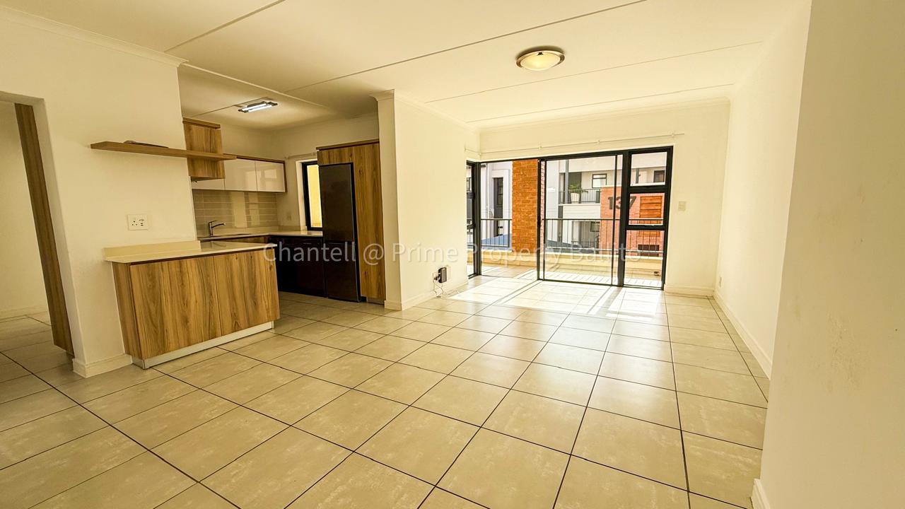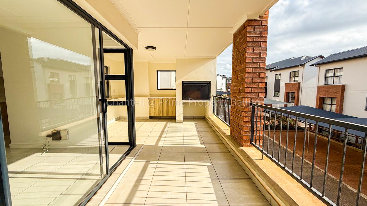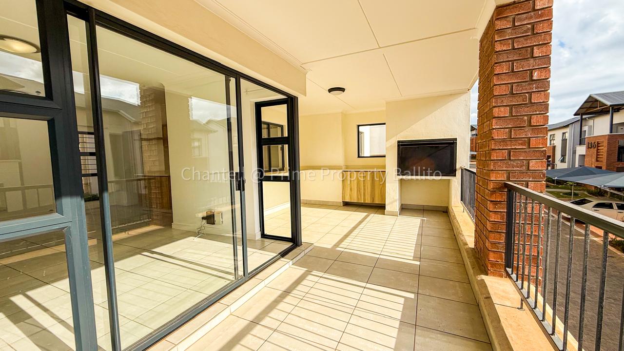 The open concept living space flows into a modern kitchen fitted with an electric oven, hob, extractor, and essential appliances including a fridge, washing machine, and dishwasher. The lounge opens onto a generous balcony with a built-in braai—ideal for relaxed evenings or weekend entertaining.