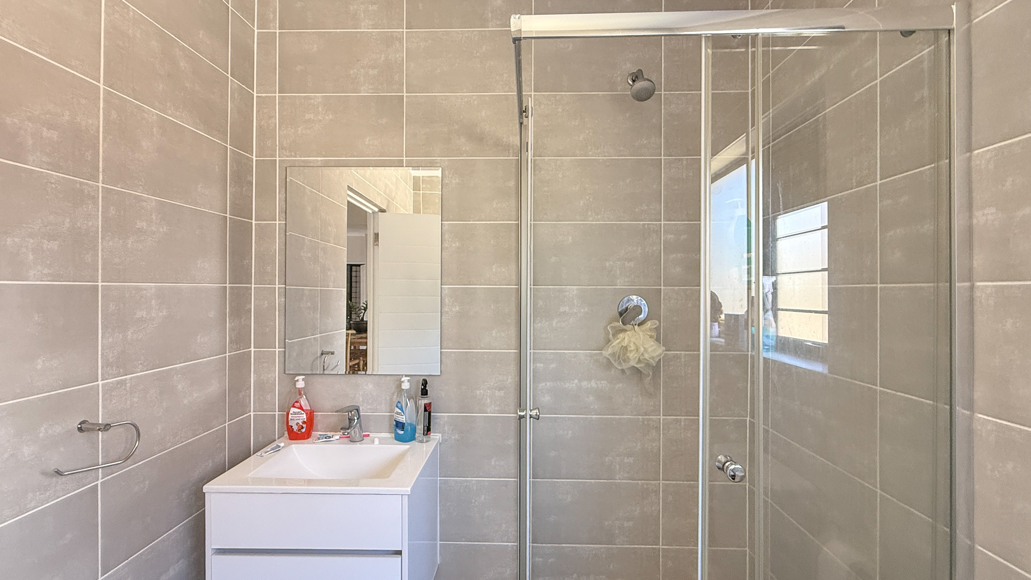 Main bedroom en-suite, with sliding doors opening onto the balcony (shower, basin, and toilet).