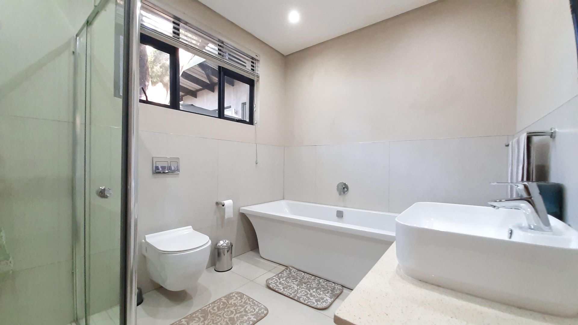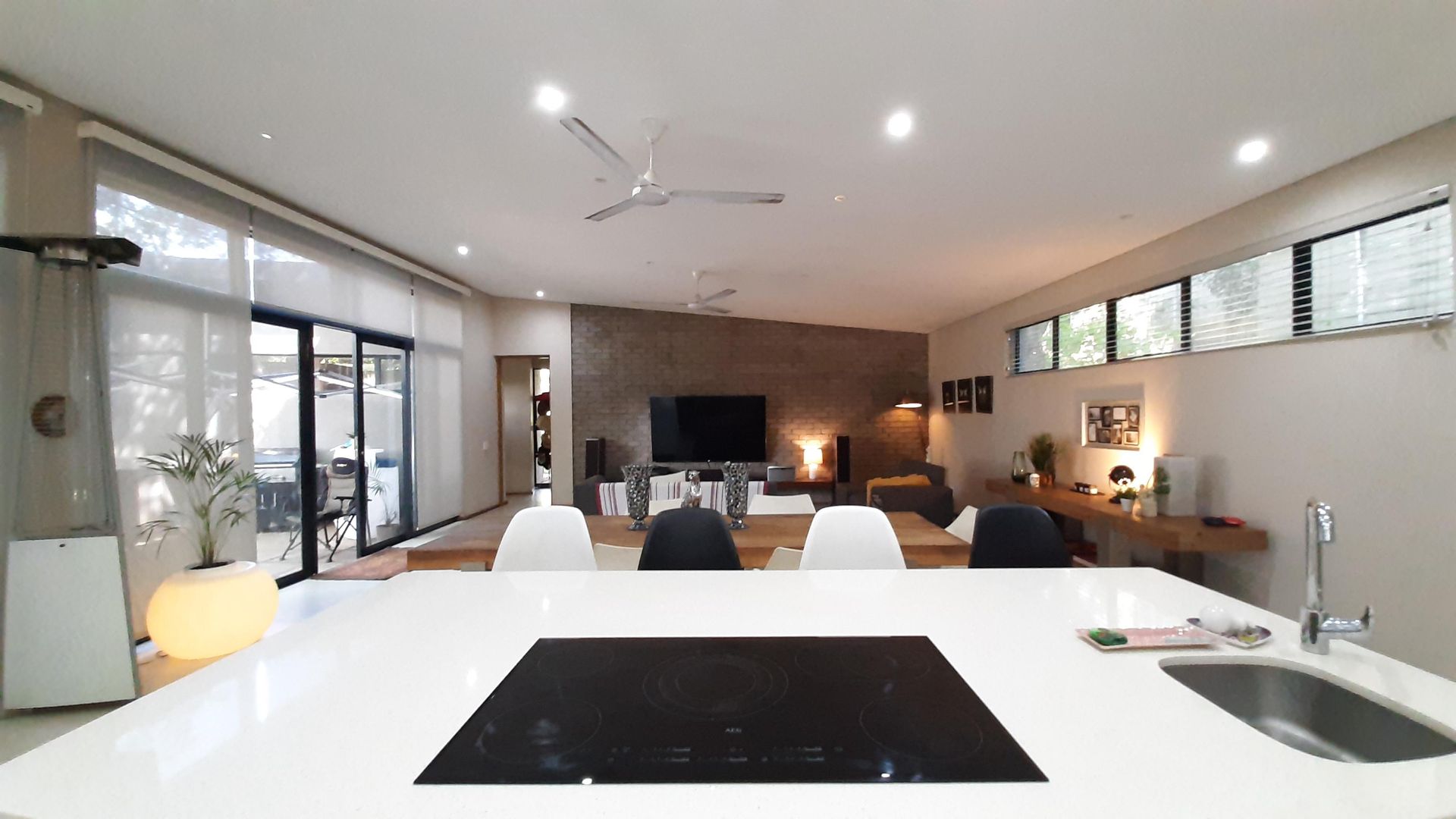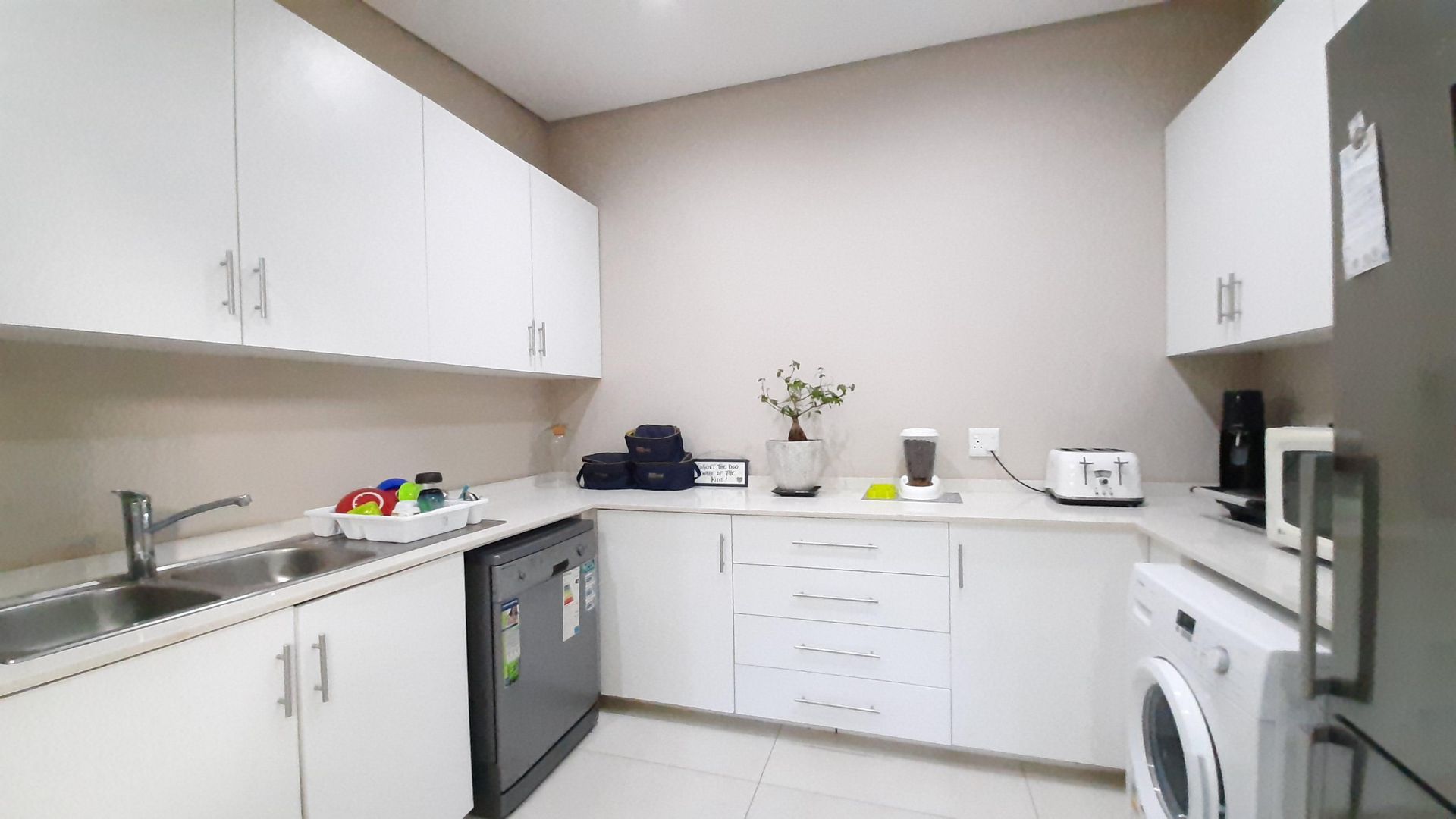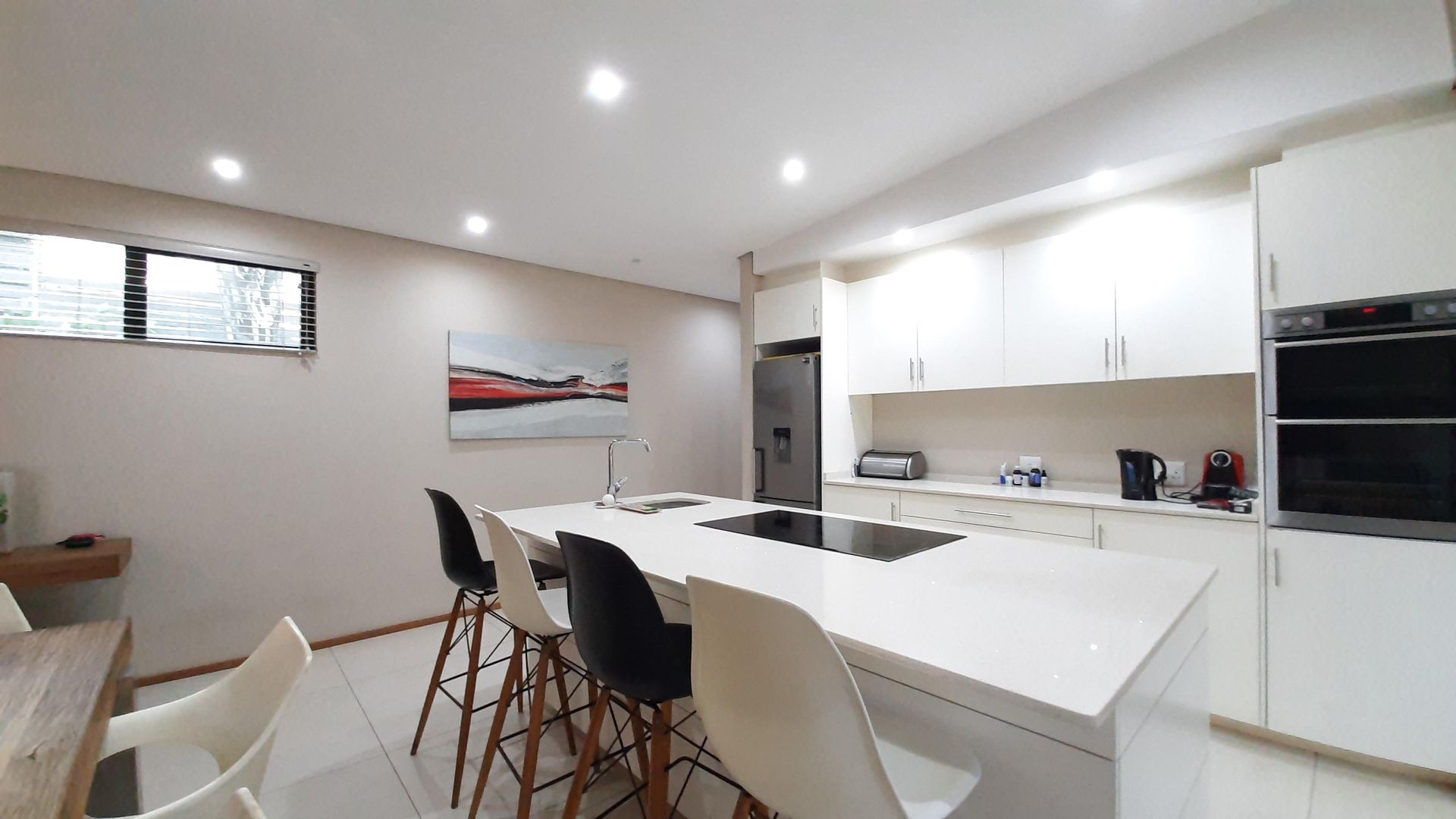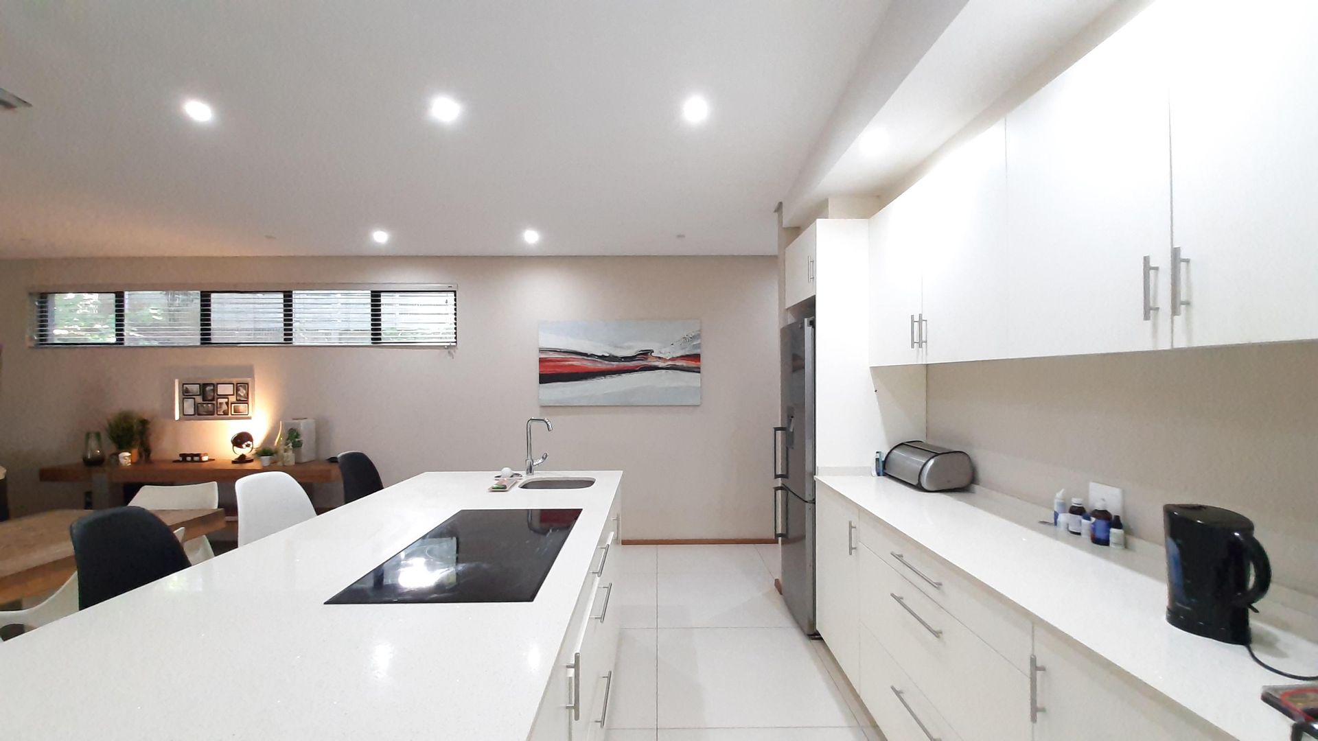With its spacious open-plan design, the house boasts a comfortable living area that flows seamlessly into a modern kitchen, with Caesarstone countertops, a kitchen island, ample cabinetry and a separate scullery. In this light-filled culinary hub, you can indulge your love for cooking while your loved ones keep you company from the adjoining open-concept dining and living areas.