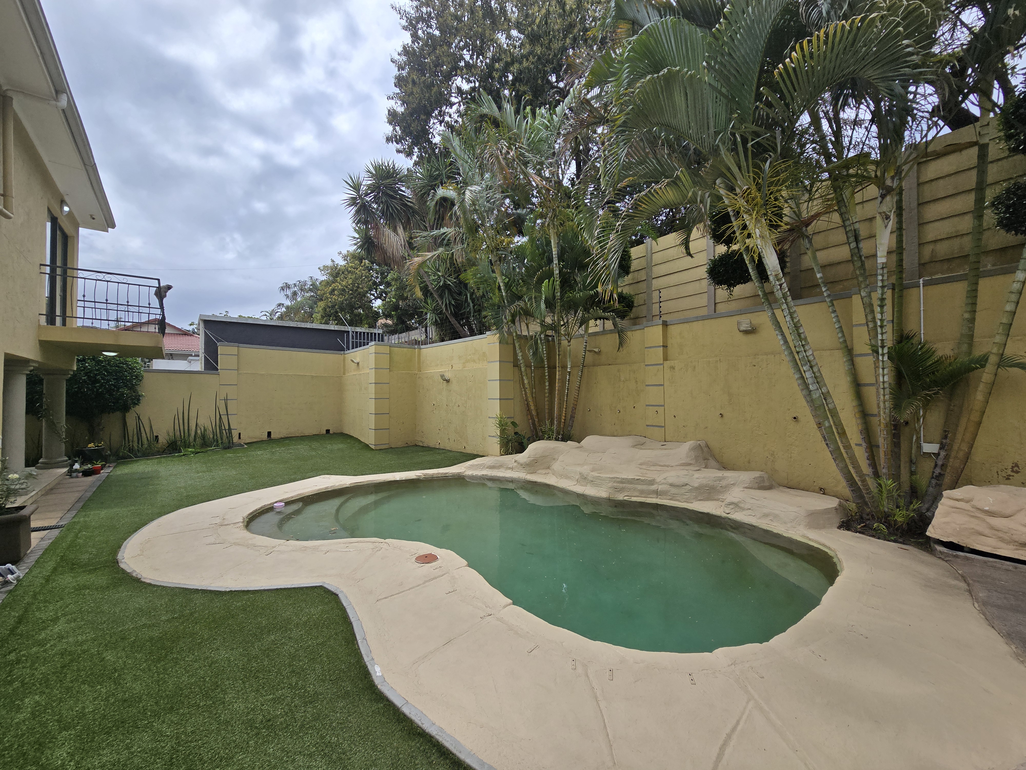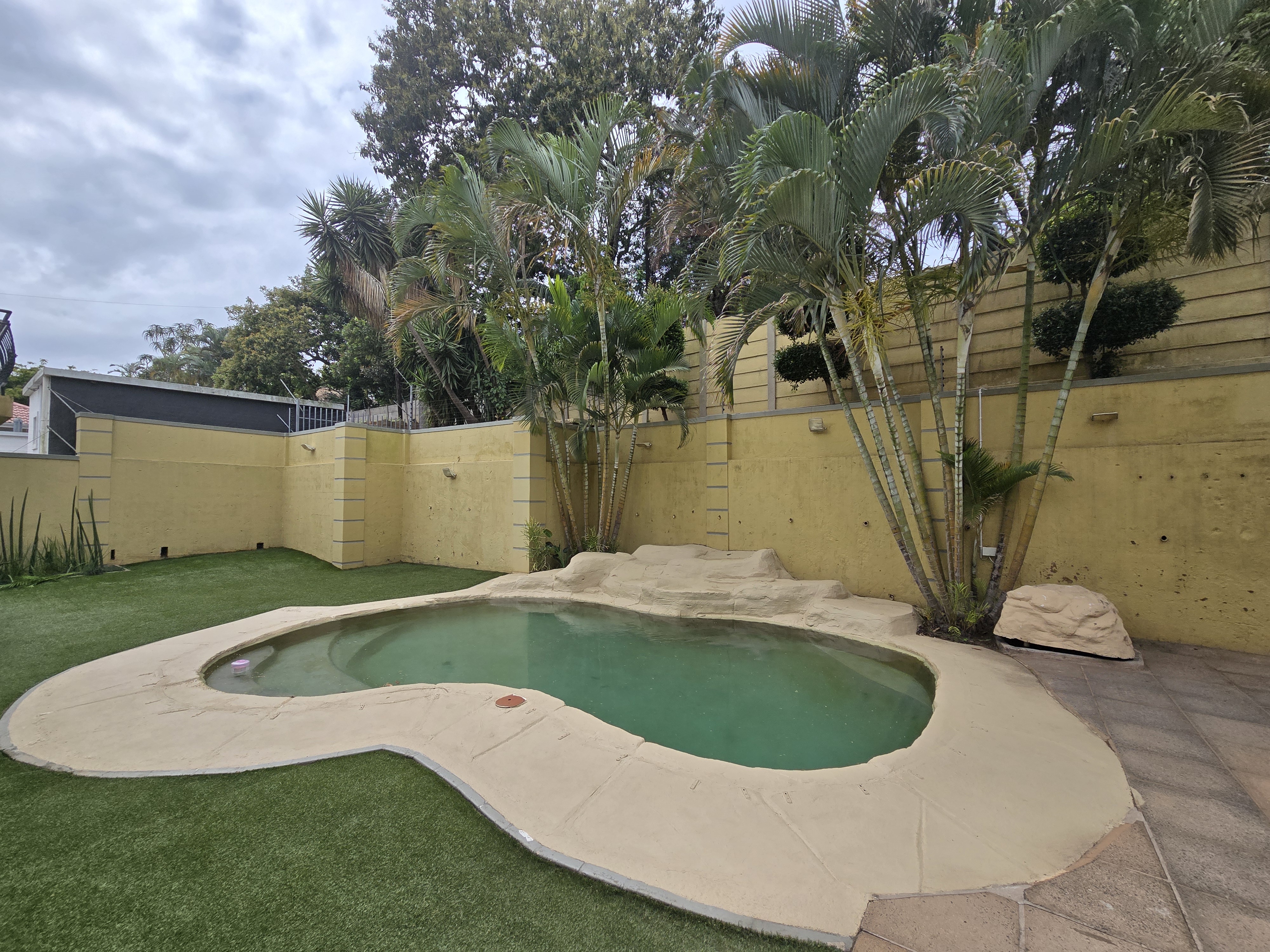 One living room opens onto a lush tropical garden, while another enjoys a covered patio overlooking a rock-finished pool and braai area.