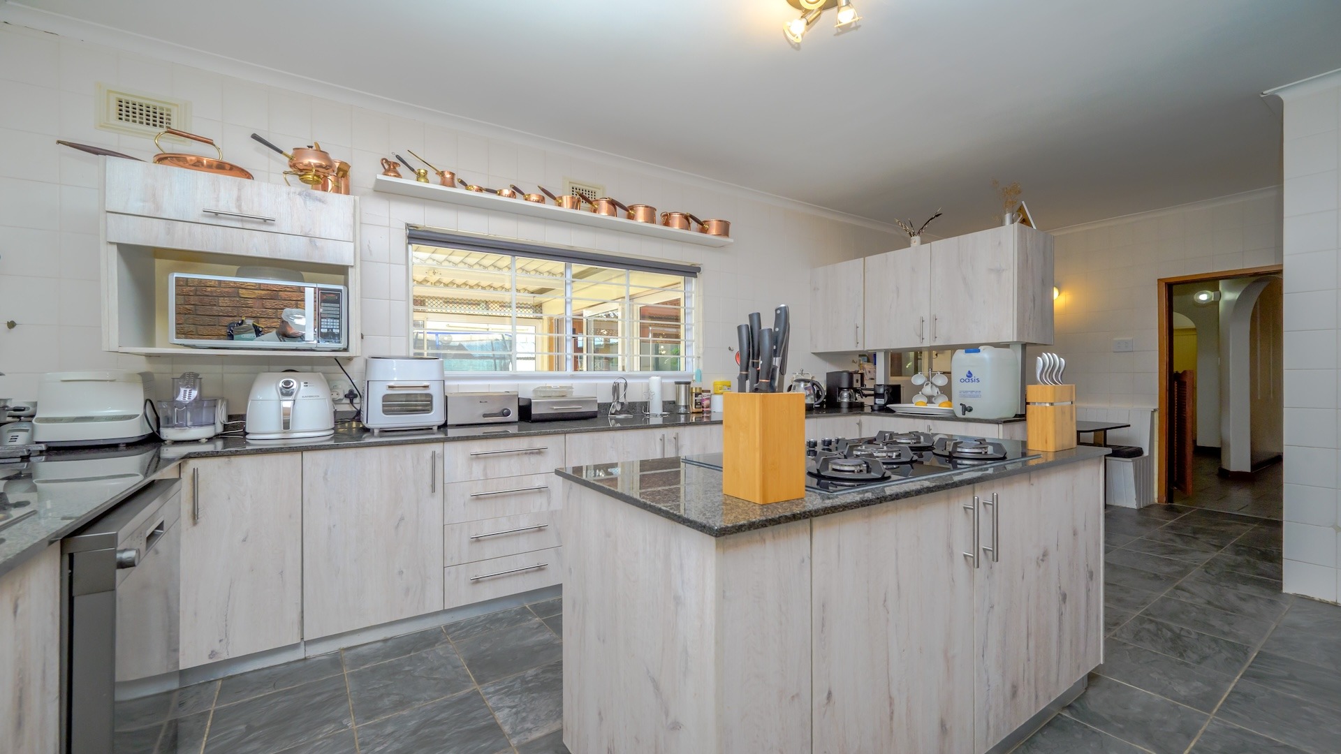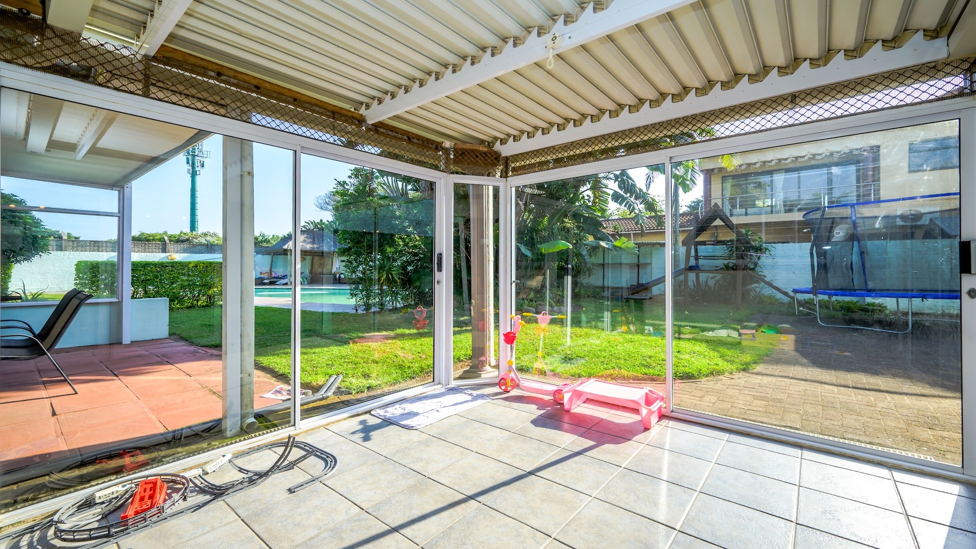 Downstairs: A spacious lounge opening directly to the large back garden, sparkling pool, and inviting lapa area. The modern kitchen features a gas stove, pantry, laundry, and a charming breakfast nook reminiscent of classic American diners. The home also includes a separate dining lounge, a bar, and a sunny entertainment room.