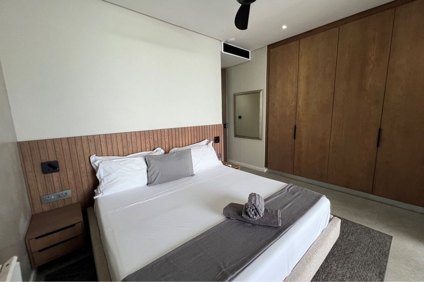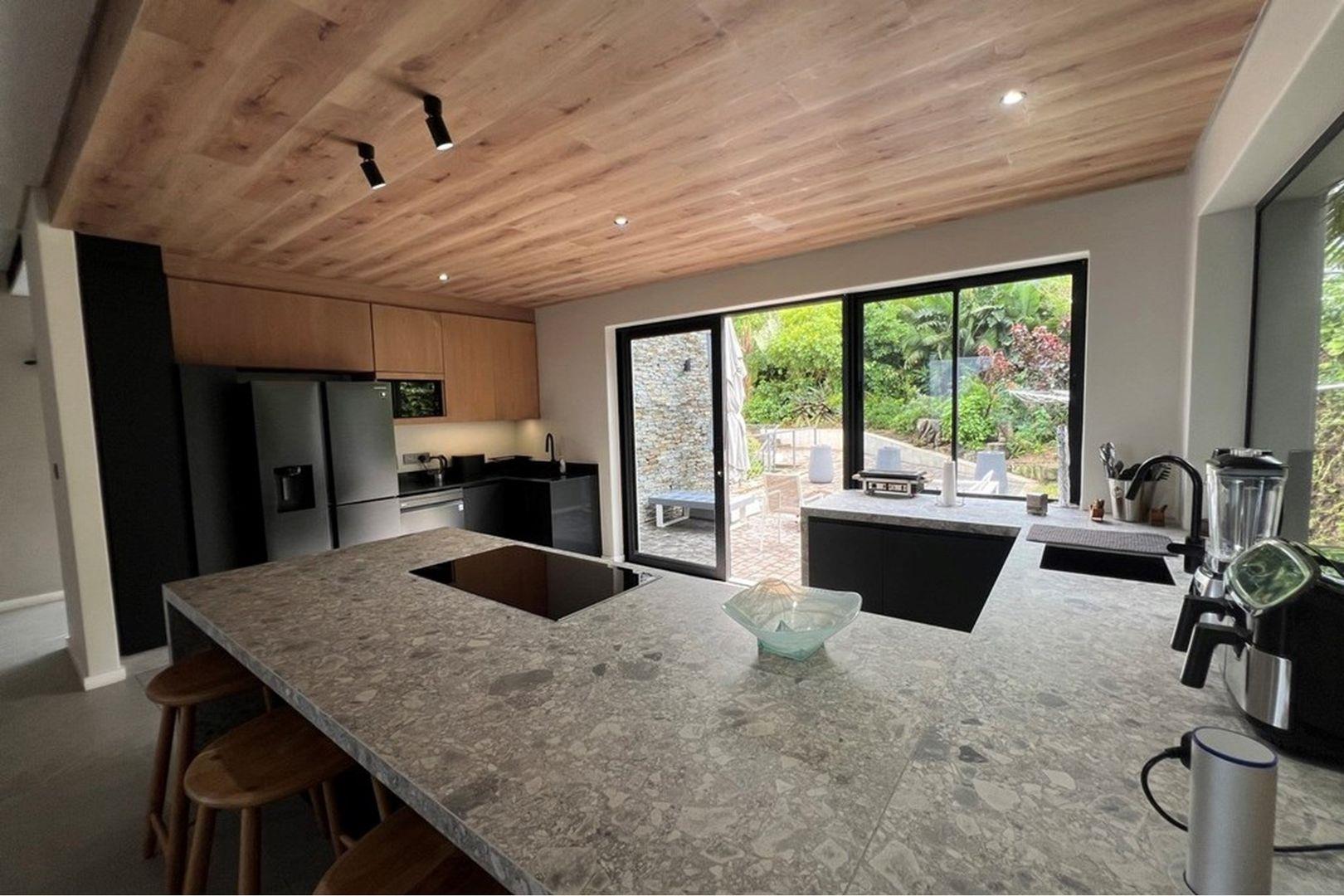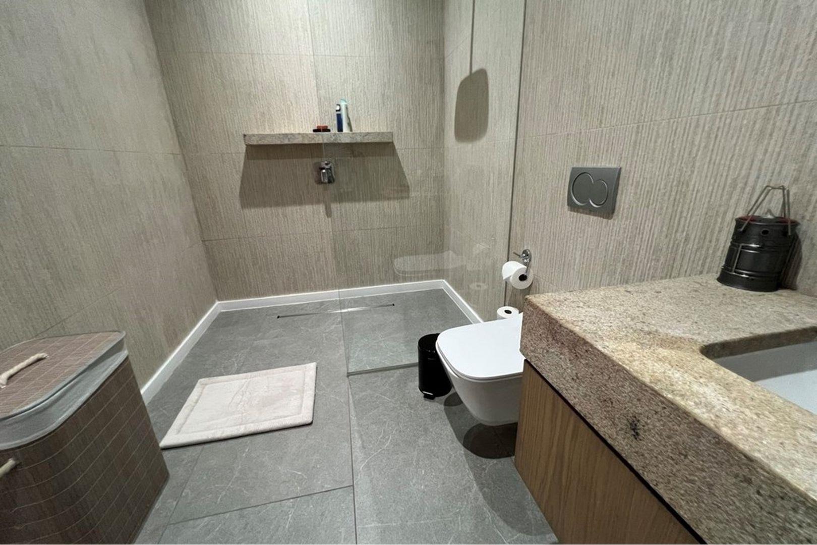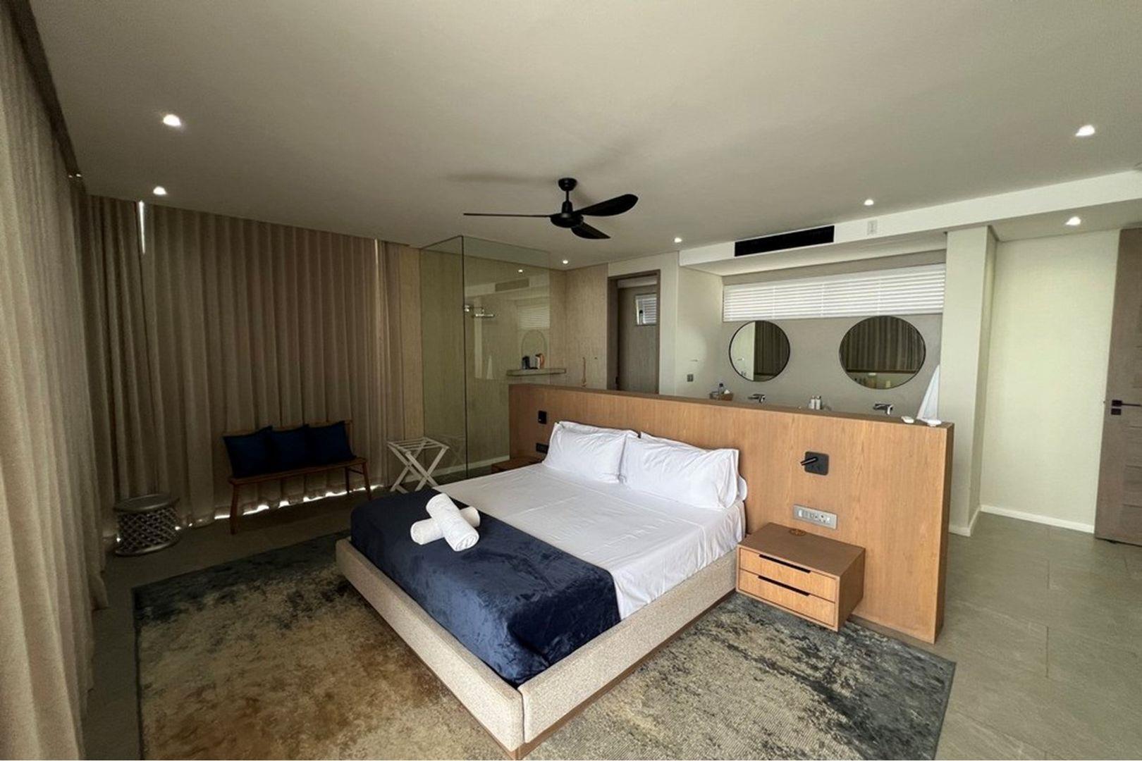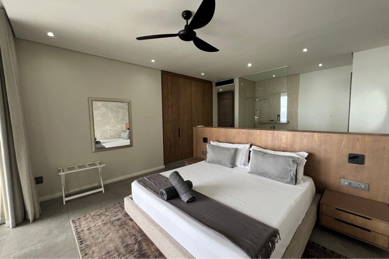 Enter through the top entrance into a private parking area accommodating up to four vehicles. Inside, expansive open-plan living spaces unfold – a sleek modern kitchen flows into a stylish dining area and refined lounge, all extending seamlessly onto a large balcony with uninterrupted sea views. Two sophisticated bedrooms, each with full en suite bathrooms, open directly to the balcony, creating tranquil retreats bathed in ocean light.