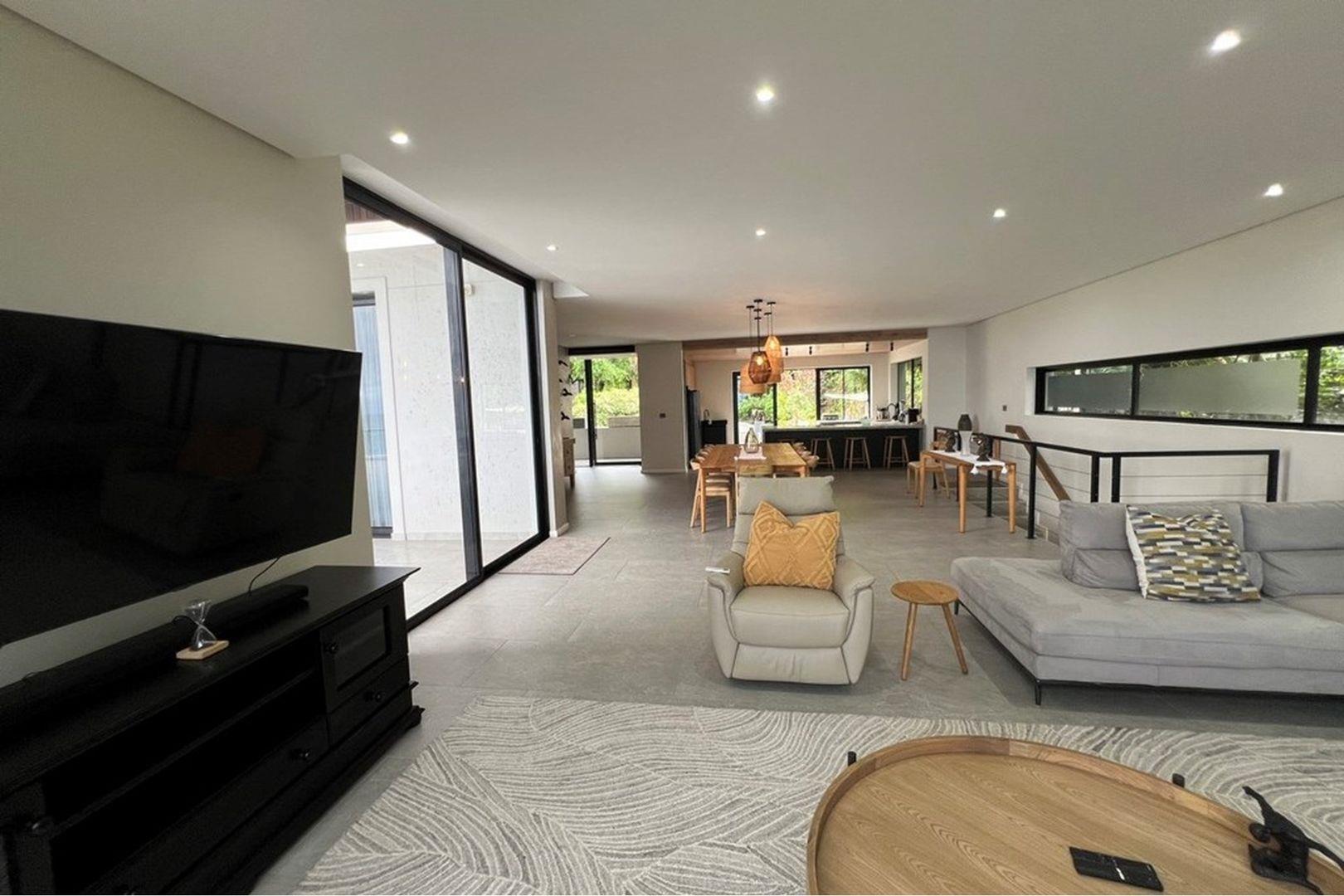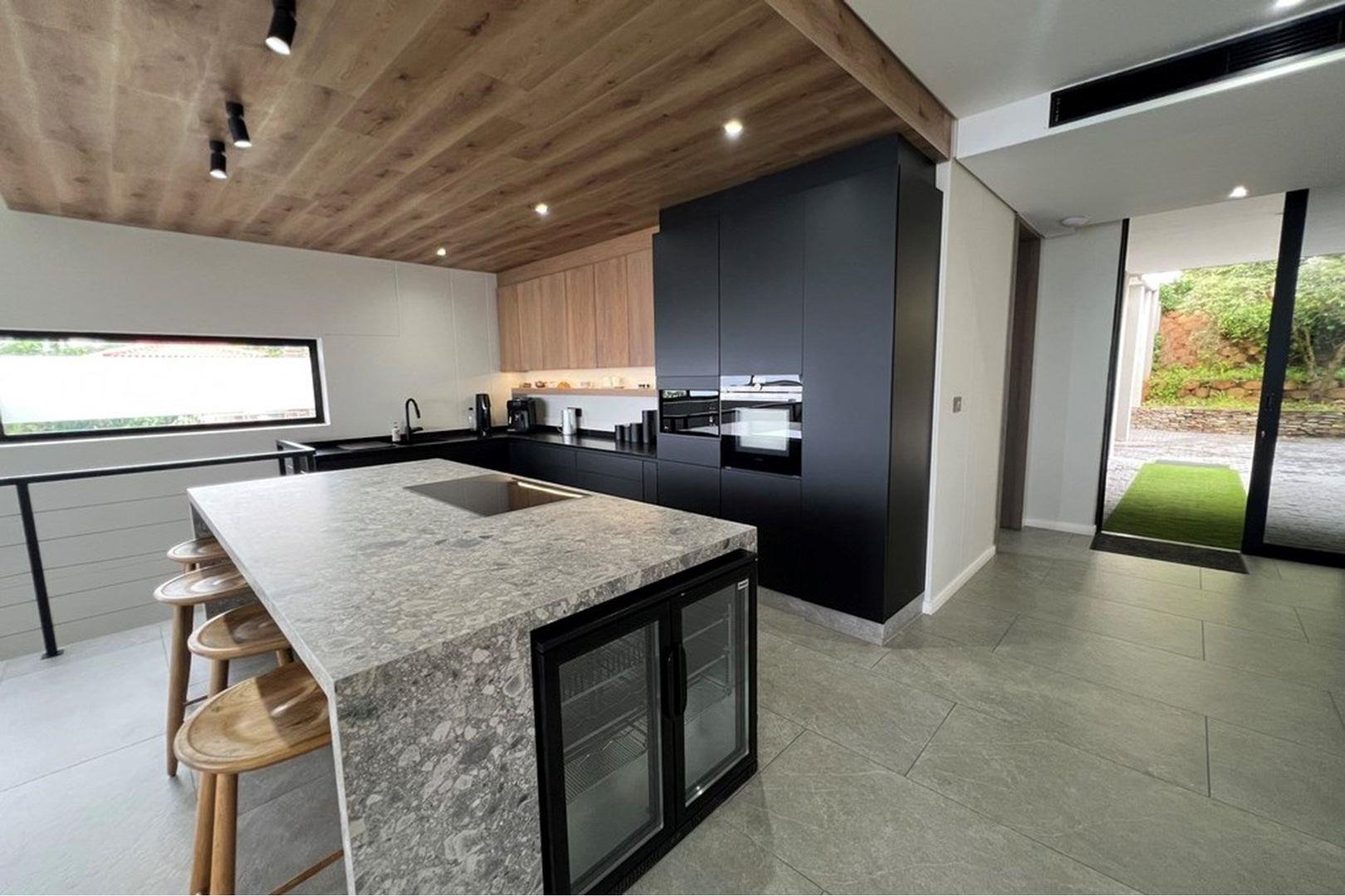 Descend to the middle level where indoor and outdoor living blend effortlessly. The sparkling swimming pool deck, framed by a mature shade tree, connects to a beautifully appointed braai (BBQ) area – the perfect setting for lazy summer afternoons or elegant evening gatherings.
