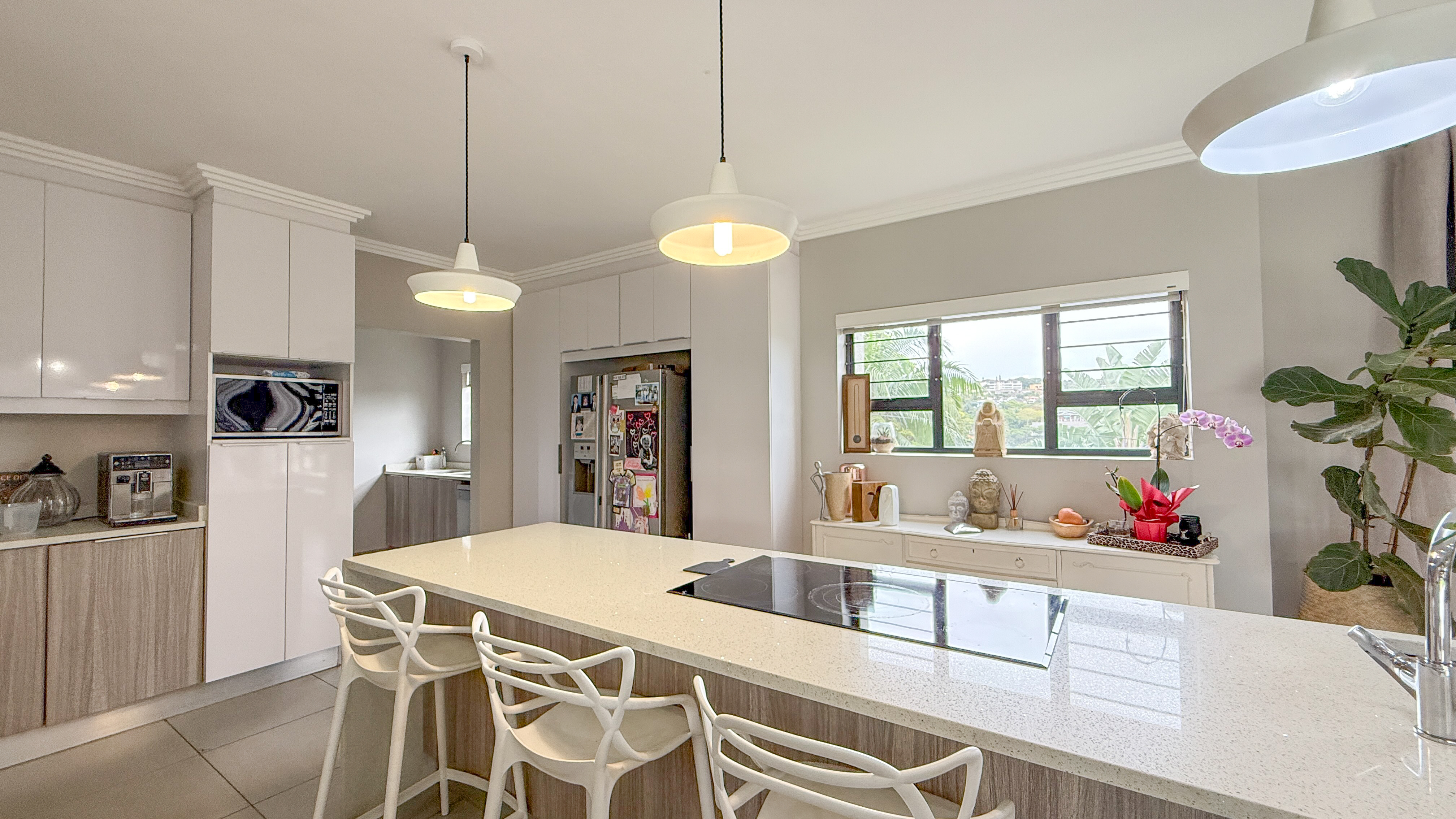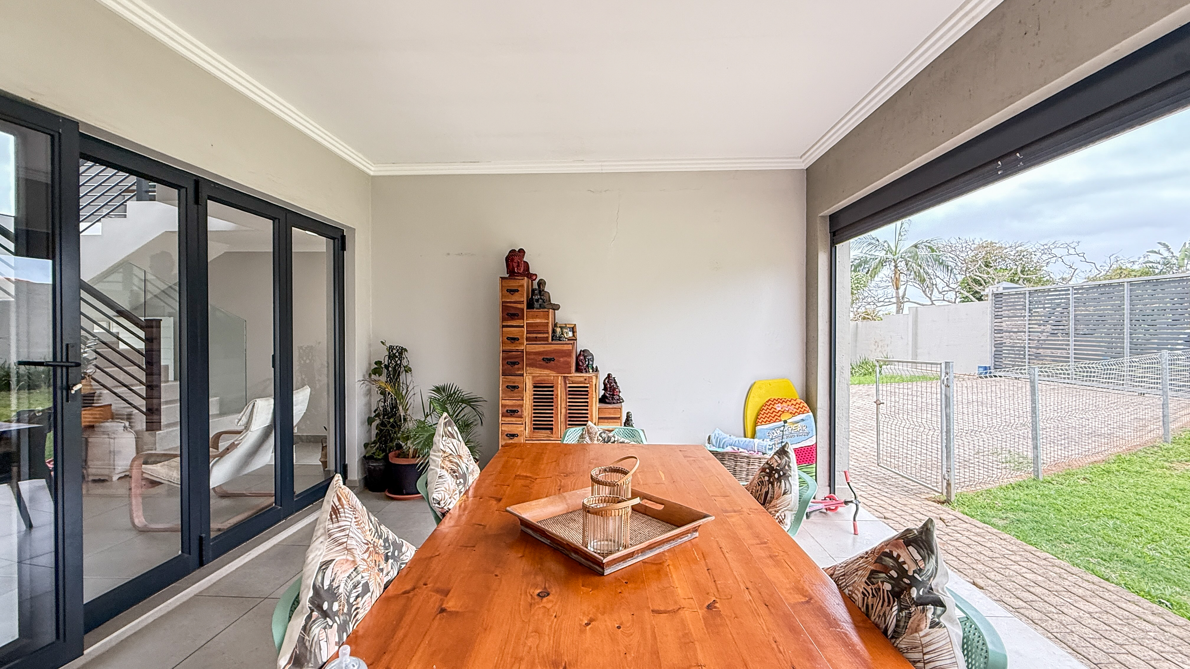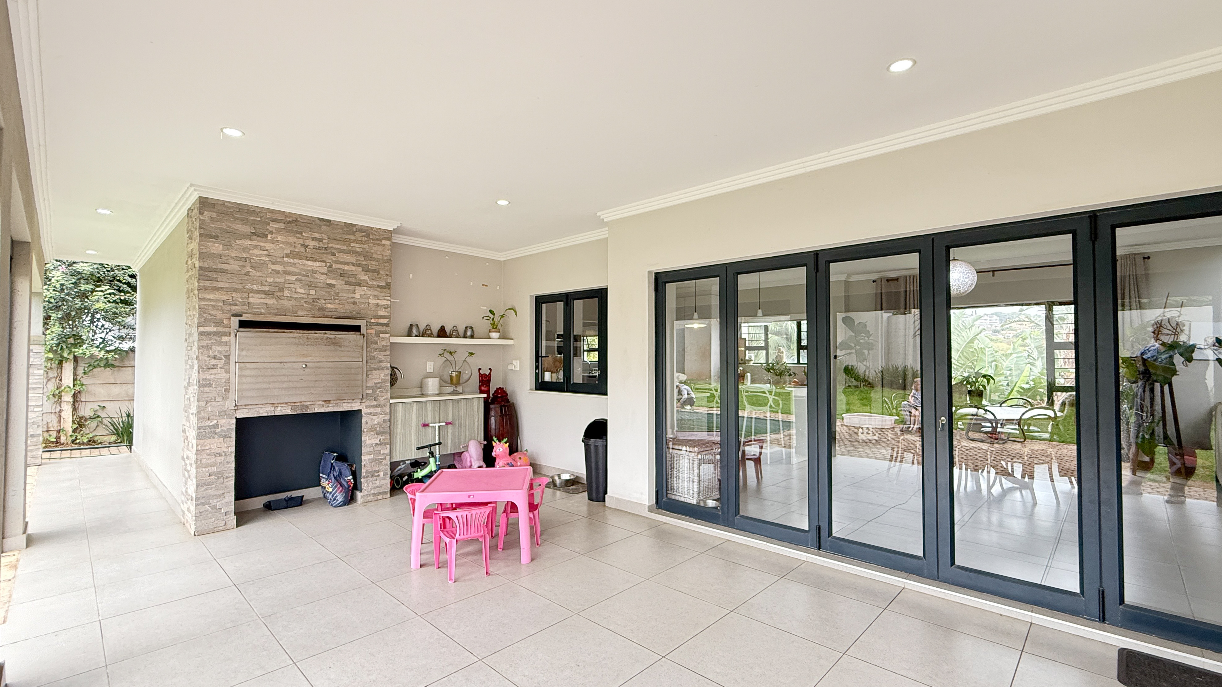 The entertainment area is fitted with a built-in braai and stylish sheer weave roller shutter blinds, so it works well in any weather. This space opens up to the front garden and pool, creating the perfect indoor-outdoor flow for entertaining or just enjoying the Ballito climate.