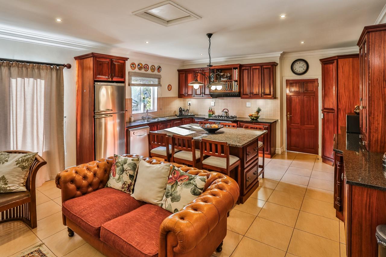 A gourmet kitchen with bespoke African mahogany cabinetry, granite countertops, and an expansive family room.