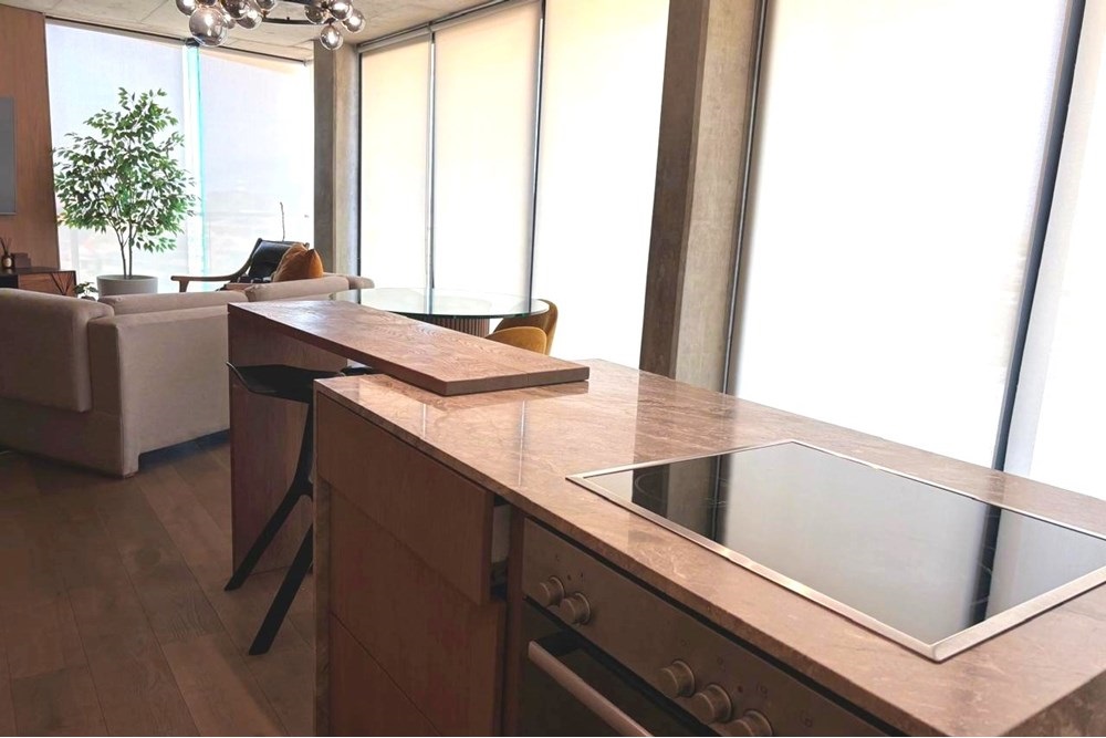 Open-plan living and dining areas lead out onto a balcony with scenic urban and sea views. The kitchen is stylish and functional with modern finishes, under-counter oven, double sink, and ample cupboard space.