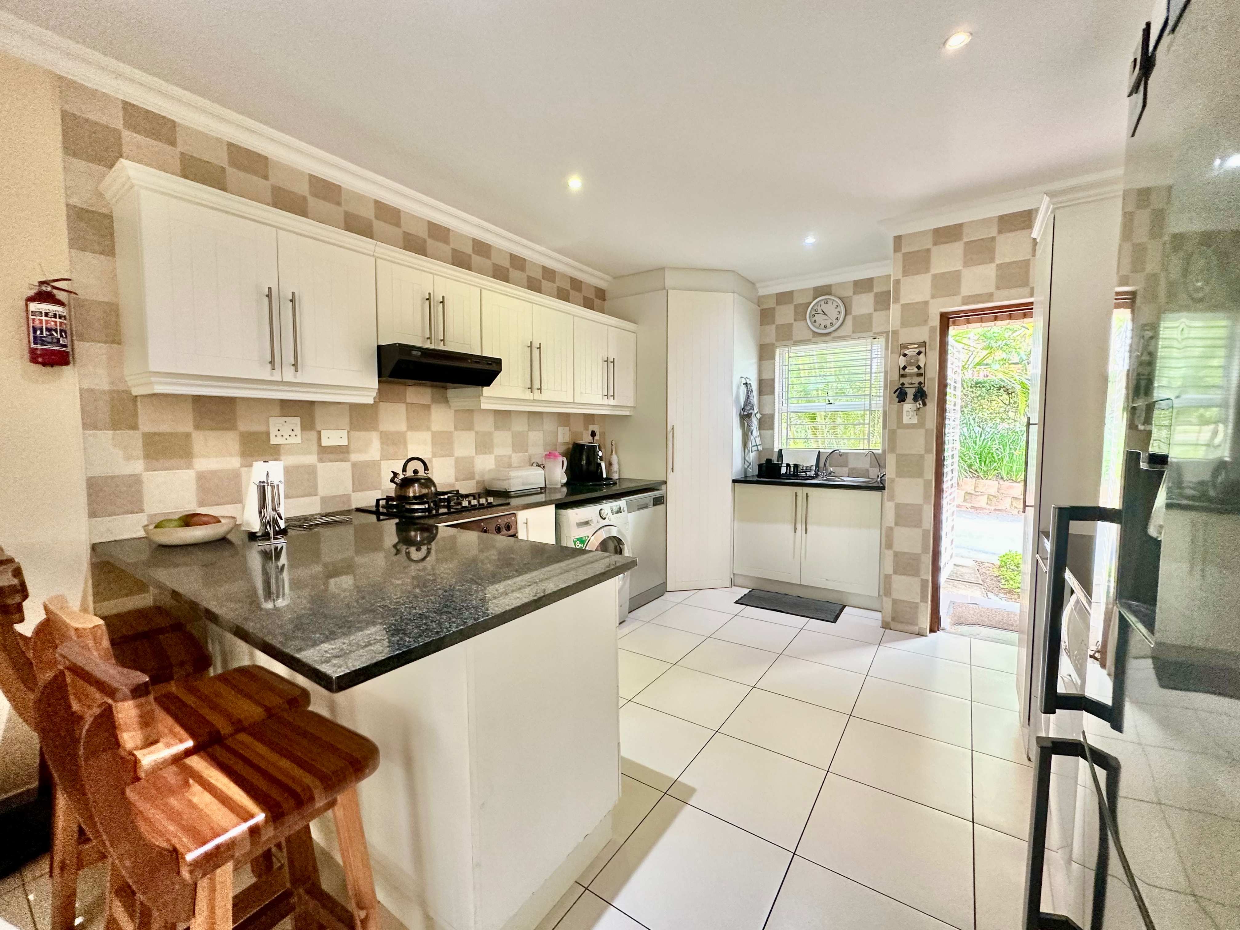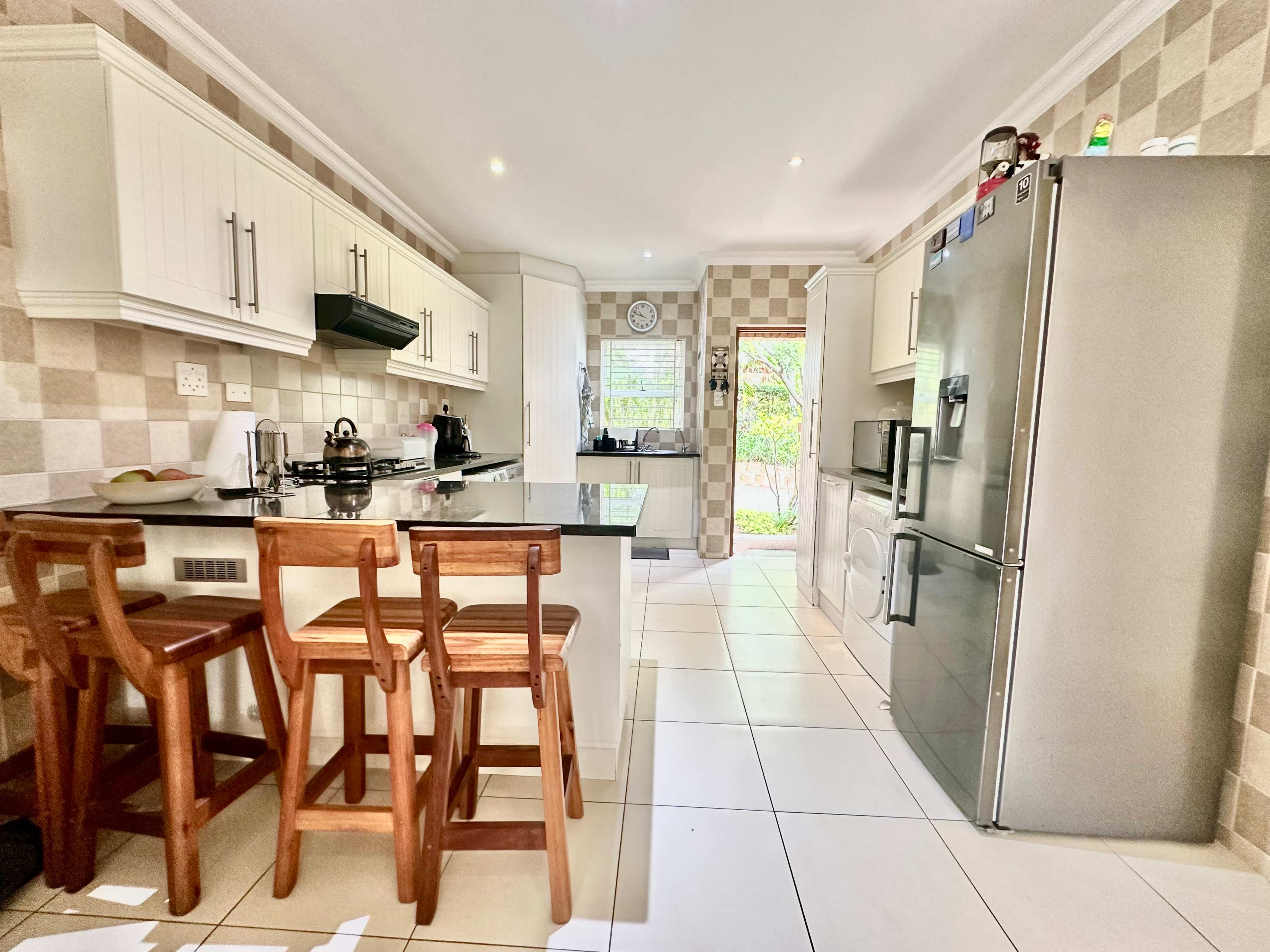 The ground floor offers a modern, well designed kitchen that flows into an open plan dining and lounge area, opening through sliding doors to a covered patio with a built in gas braai and a private pet friendly garden, ideal for holiday guests and entertaining. A downstairs bedroom with a full en-suite bathroom adds flexibility for guests or extended family.