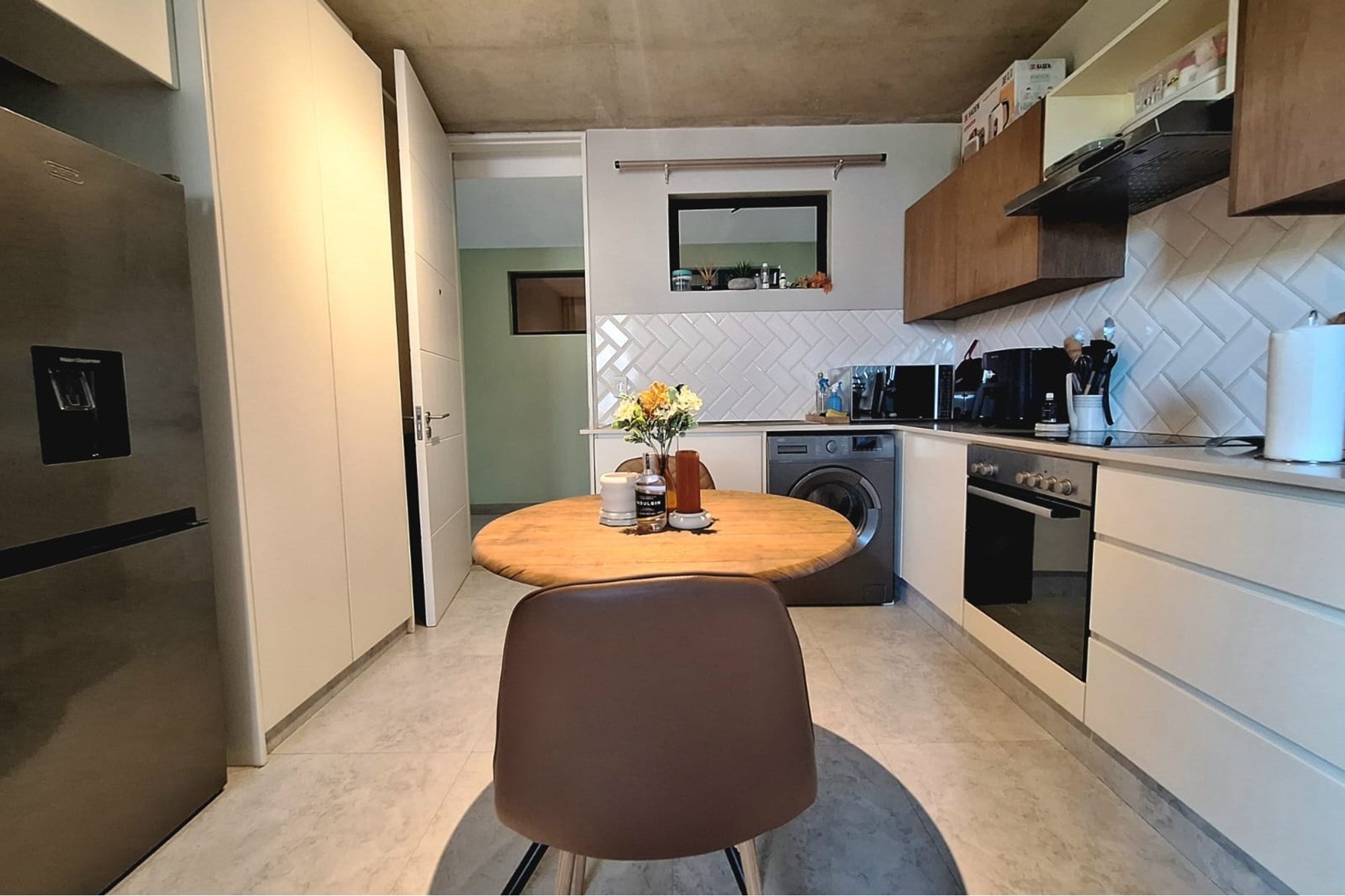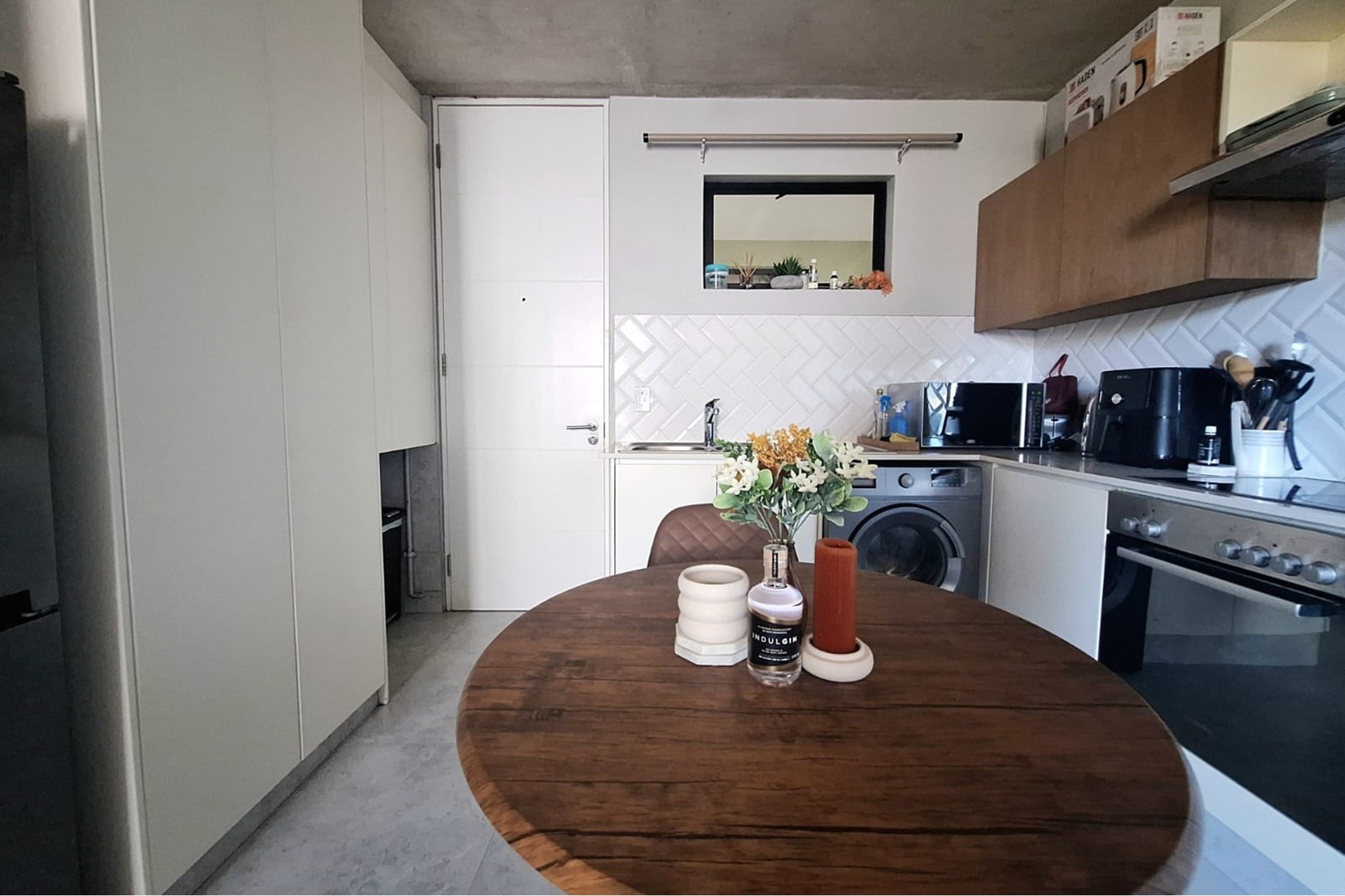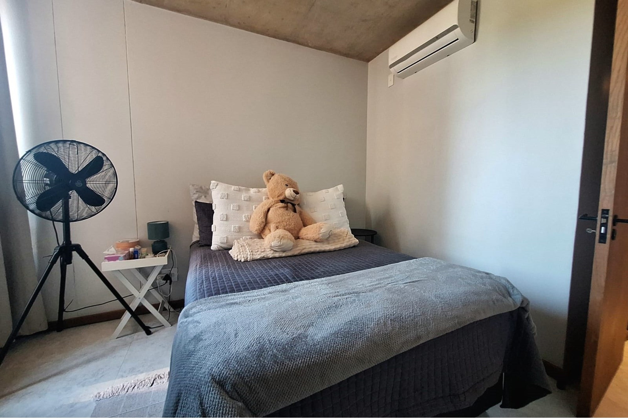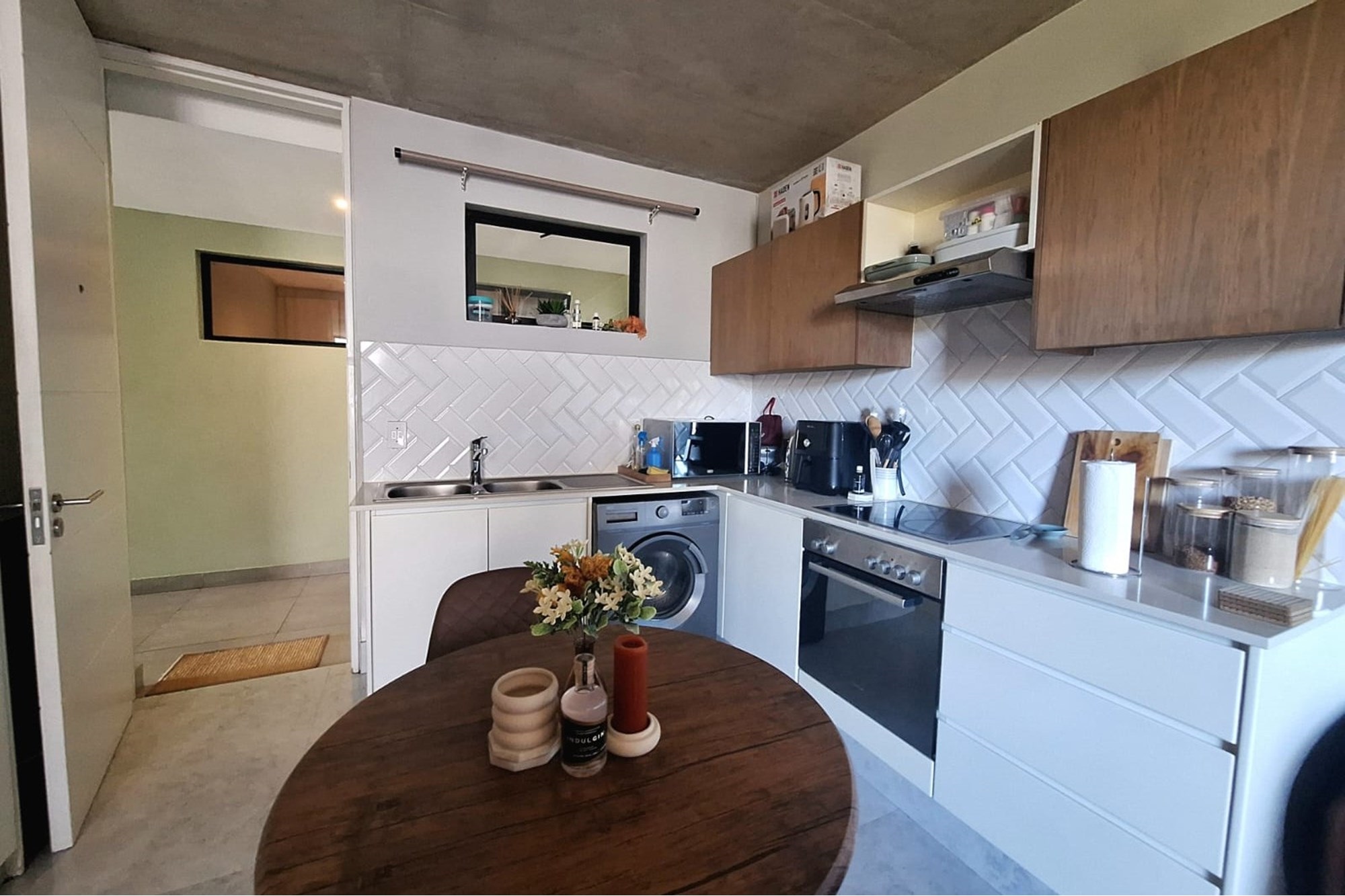 The open-plan living area is equipped with air-conditioning and flows seamlessly into a sleek, fitted kitchen—creating a functional, easy-to-maintain space. The bedroom includes built-in cupboards and air-conditioning, while the bathroom features a modern shower.