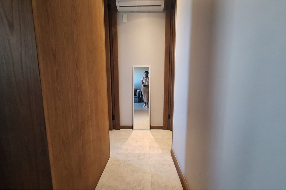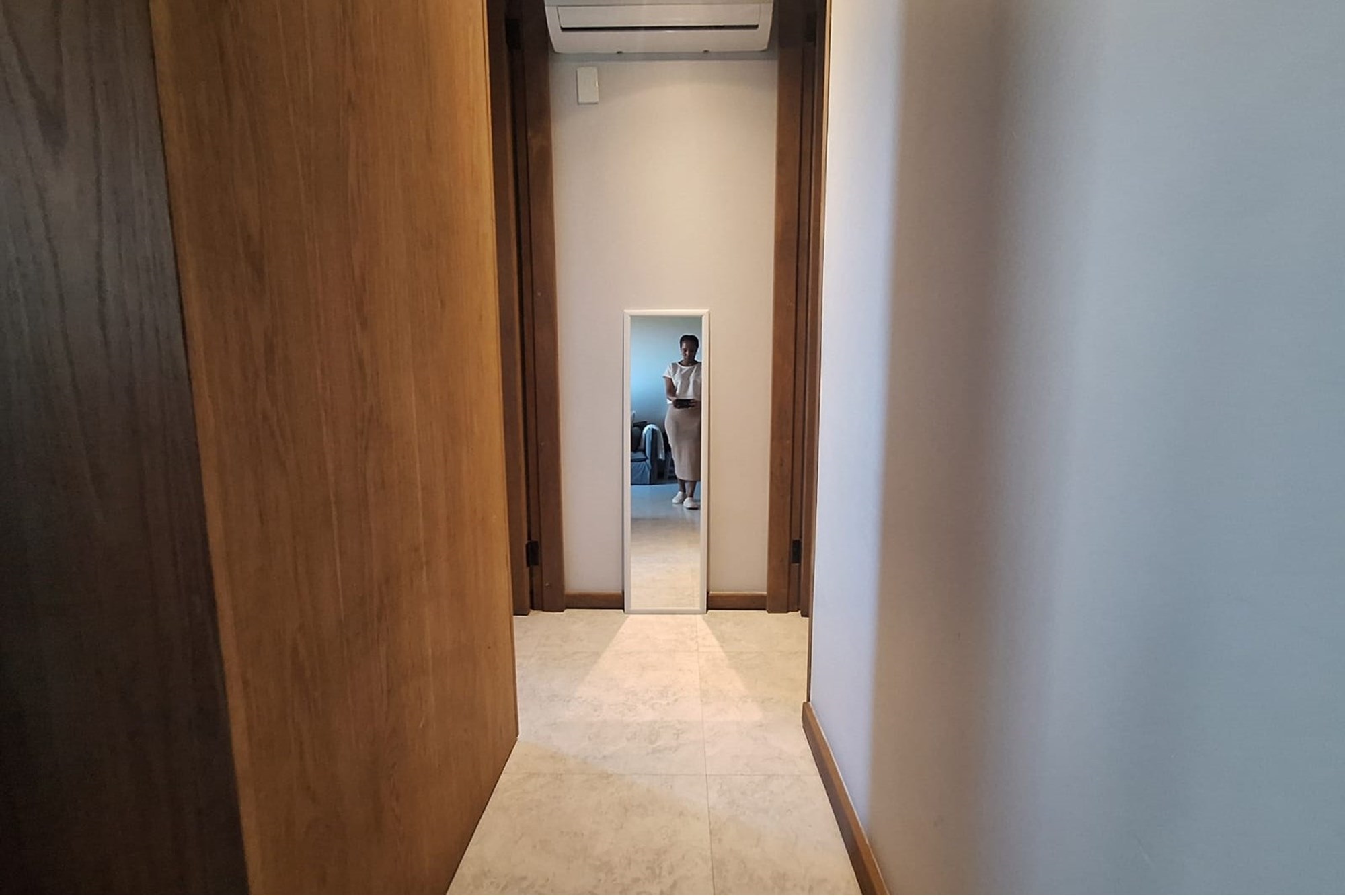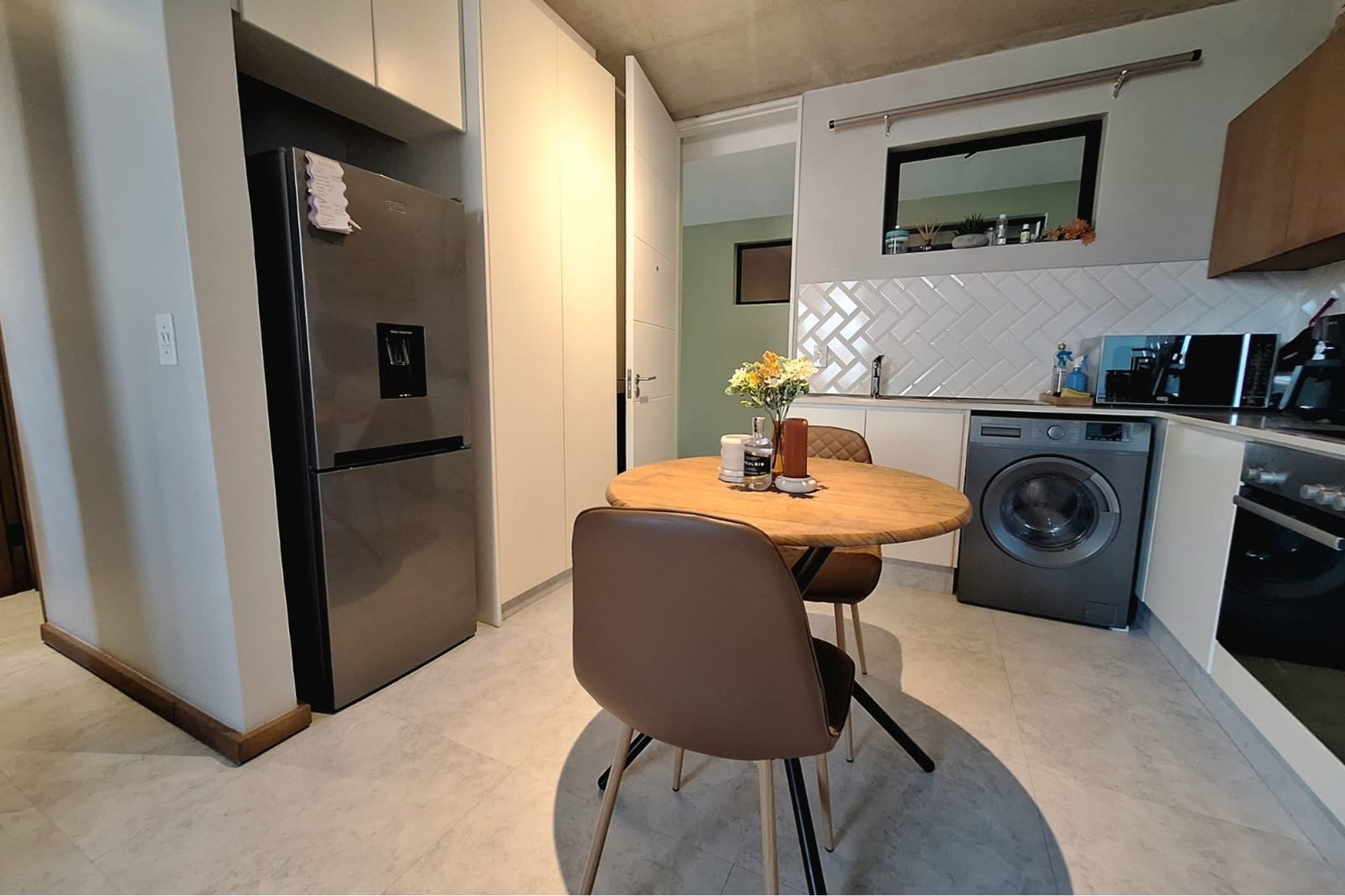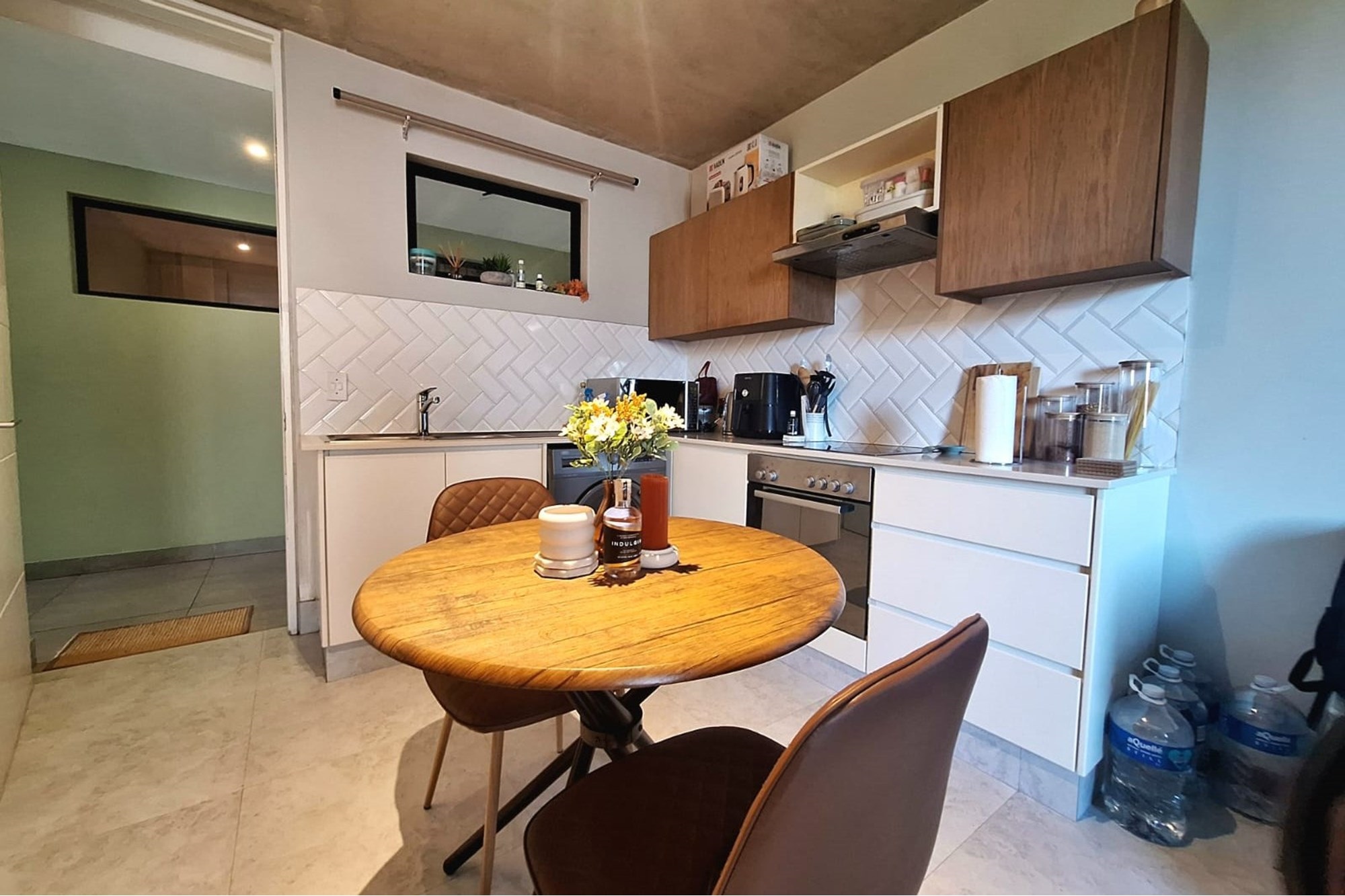 The open-plan living area is equipped with air-conditioning and flows seamlessly into a sleek, fitted kitchen—creating a functional, easy-to-maintain space. The bedroom includes built-in cupboards and air-conditioning, while the bathroom features a modern shower.