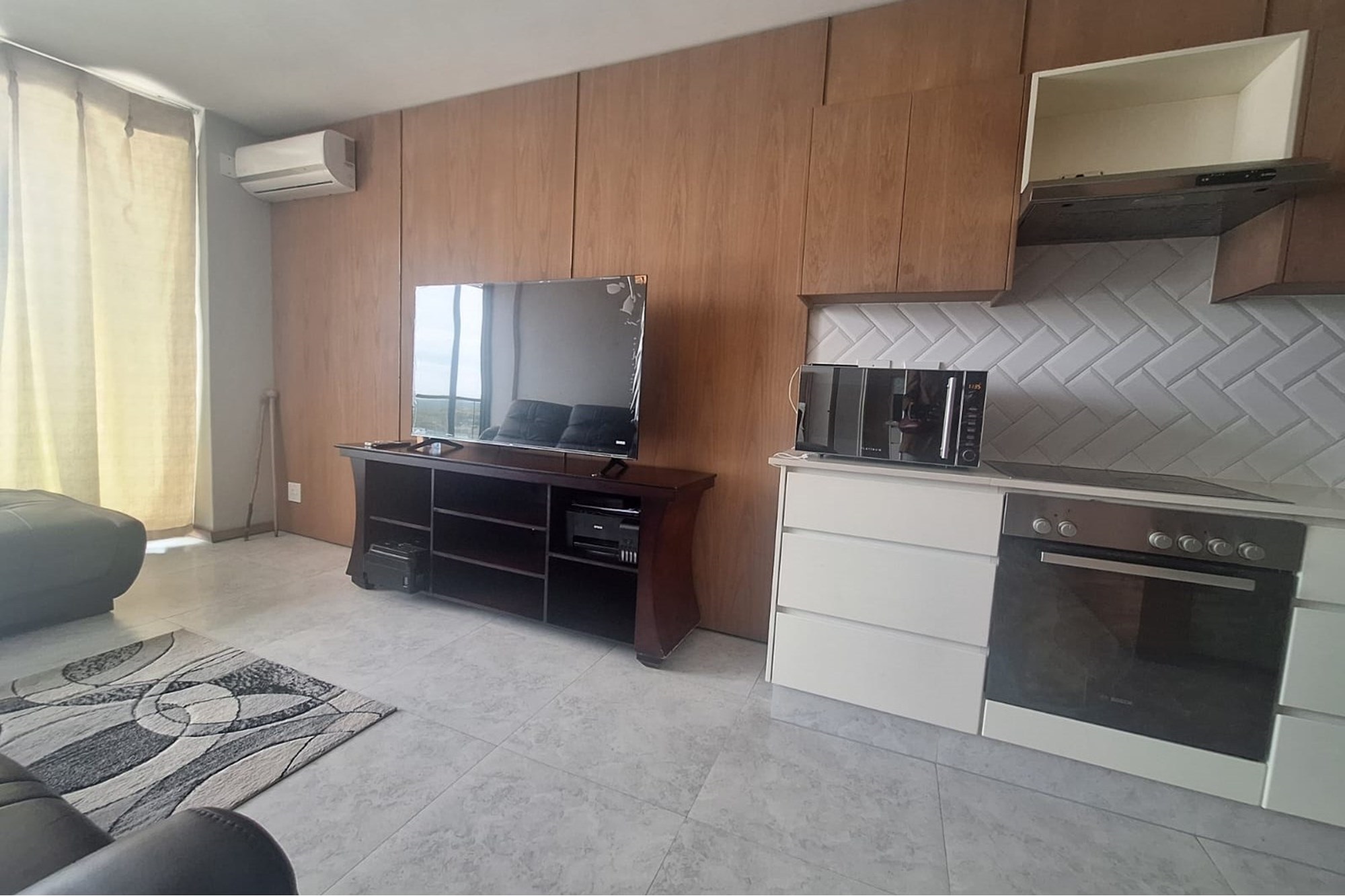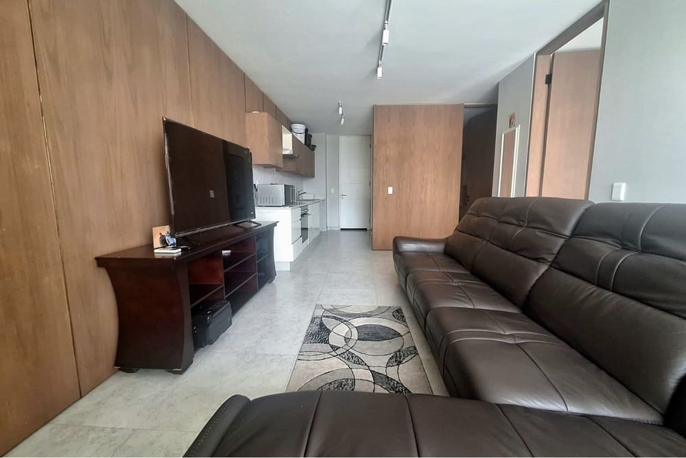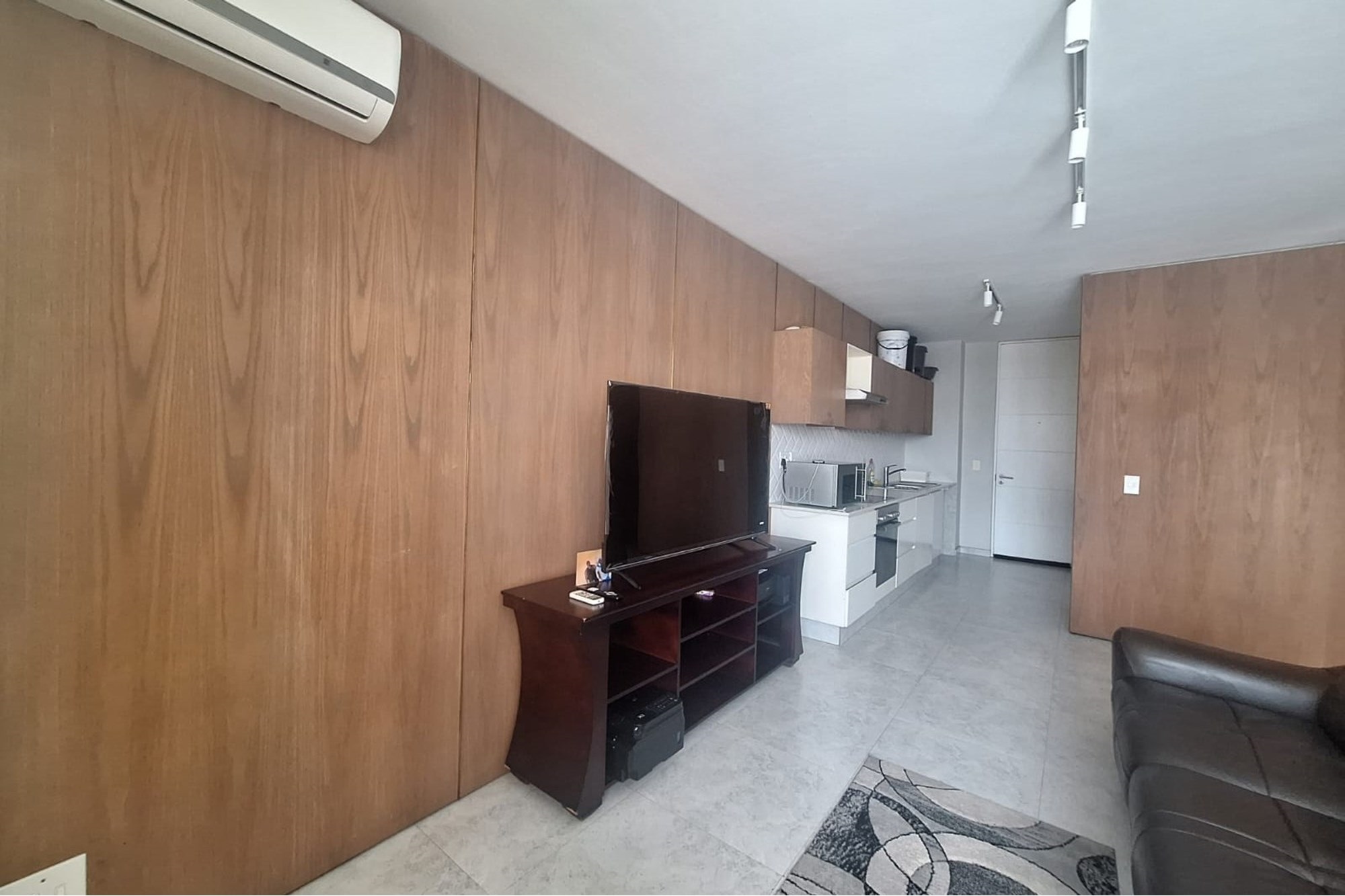 The open-plan living area is fitted with air-conditioning and leads out to a private balcony, providing some outdoor space. A modern, fitted kitchen flows seamlessly into the lounge, creating a functional and easy-to-maintain living space.