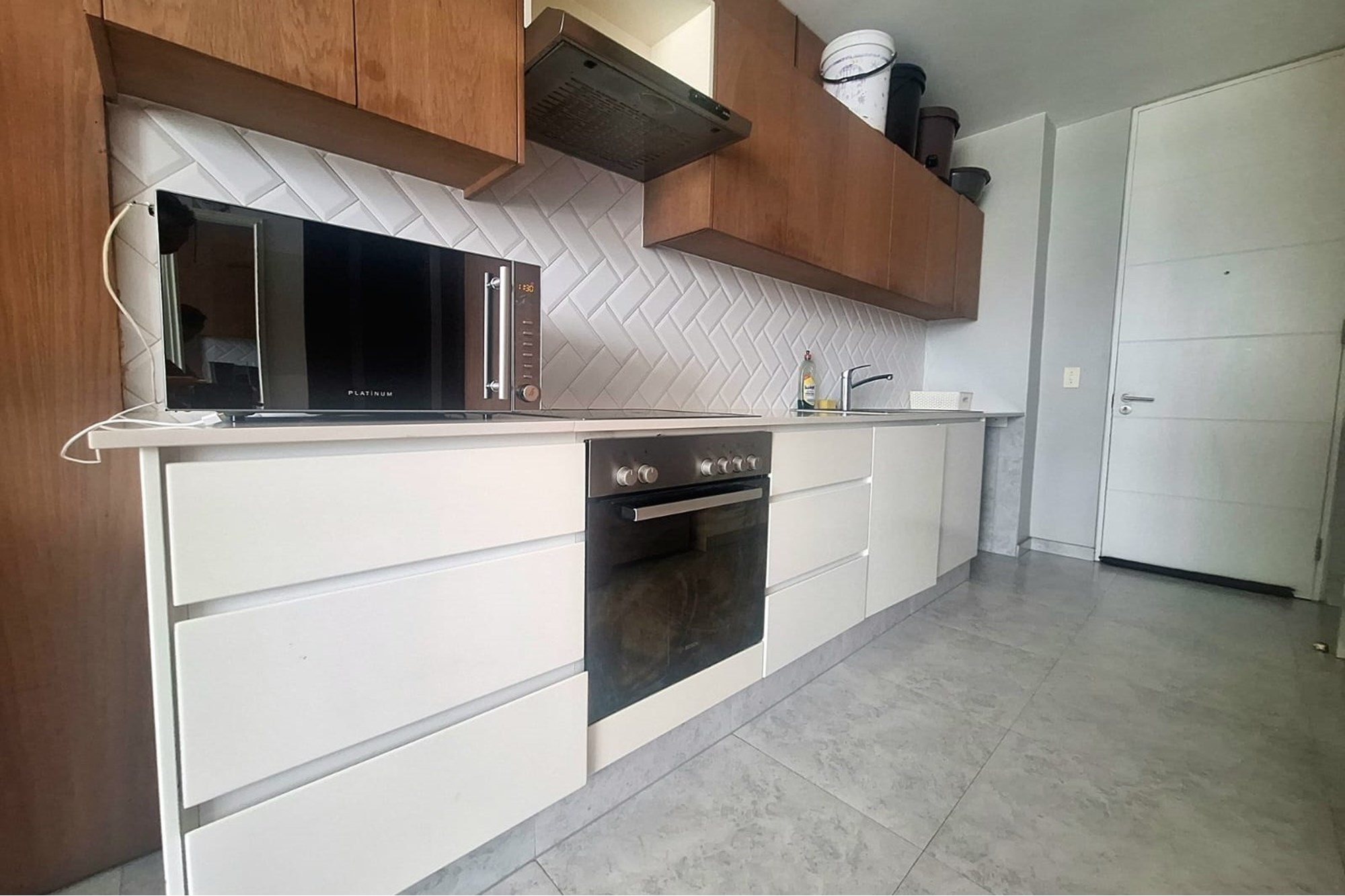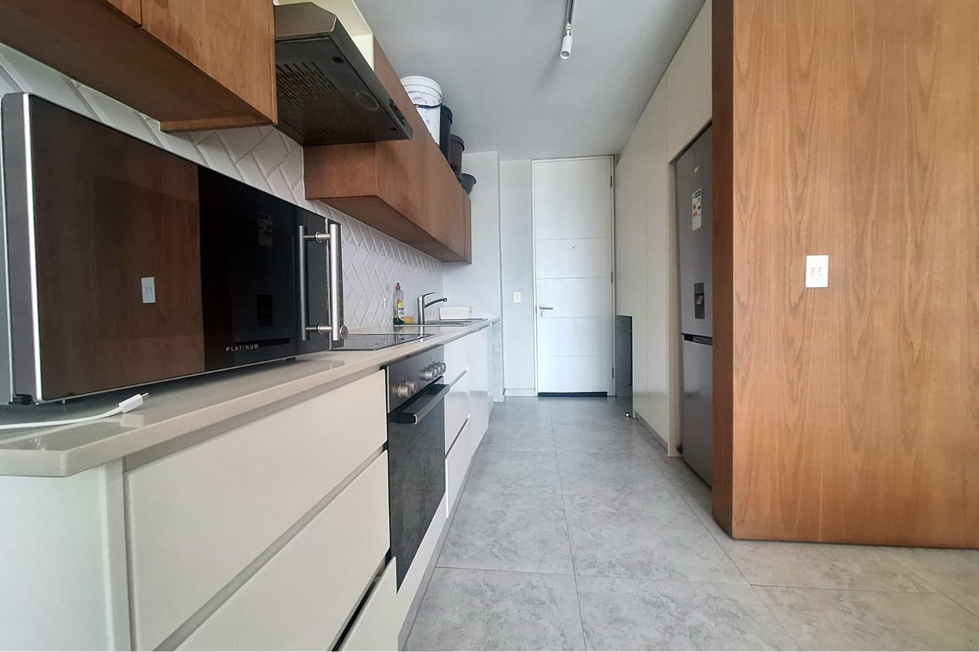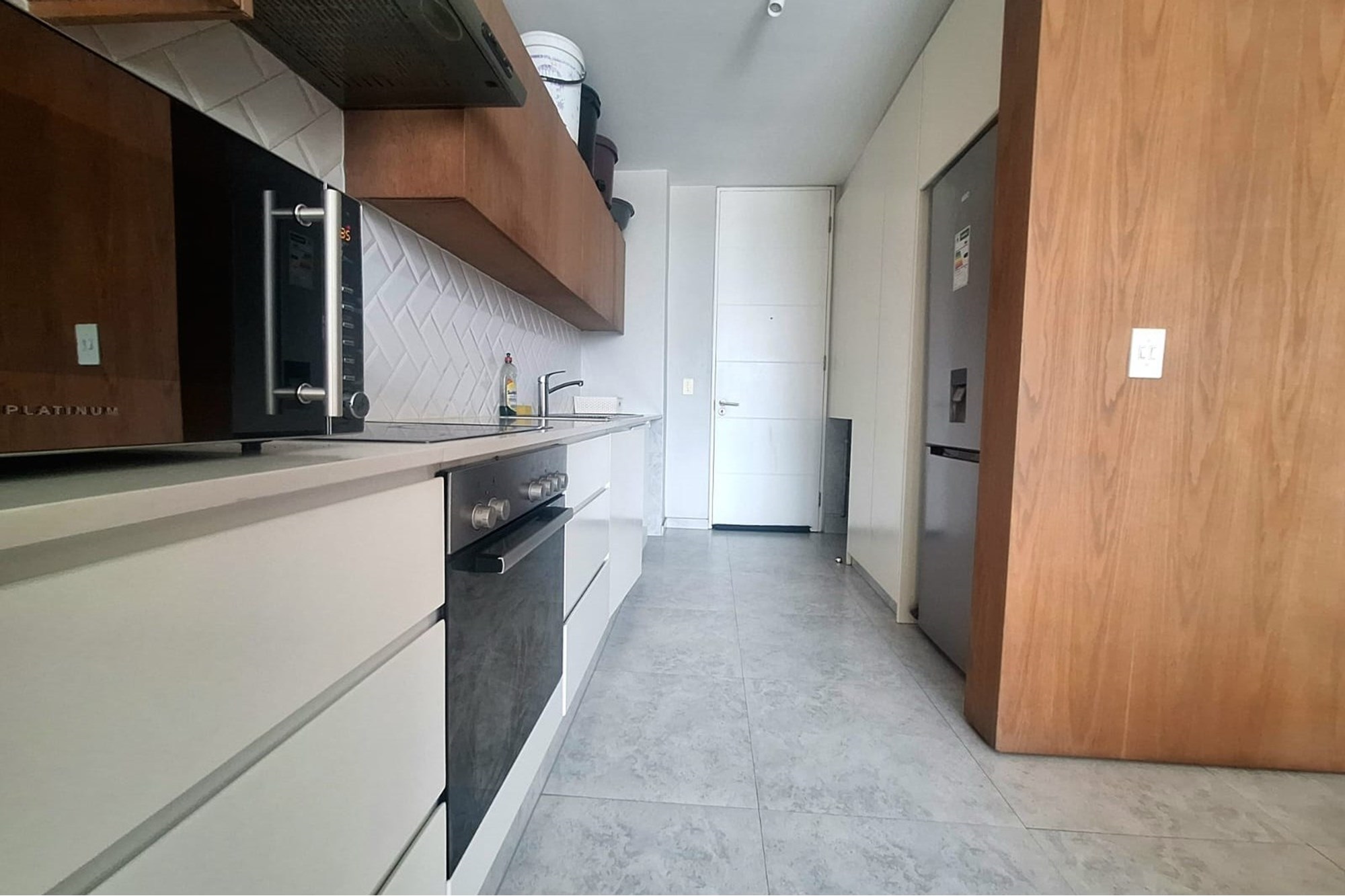 The open-plan living area is fitted with air-conditioning and leads out to a private balcony, providing some outdoor space. A modern, fitted kitchen flows seamlessly into the lounge, creating a functional and easy-to-maintain living space.