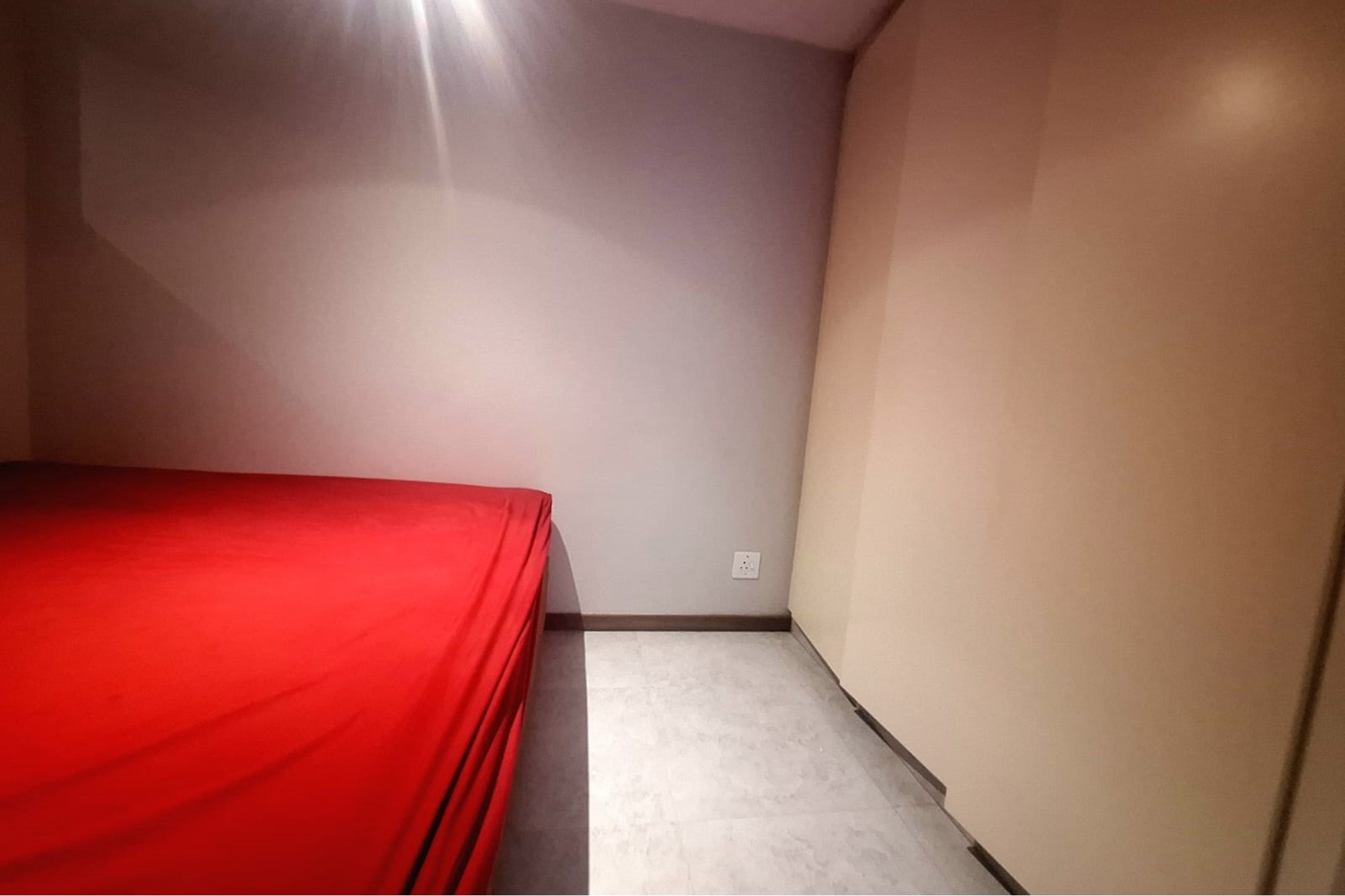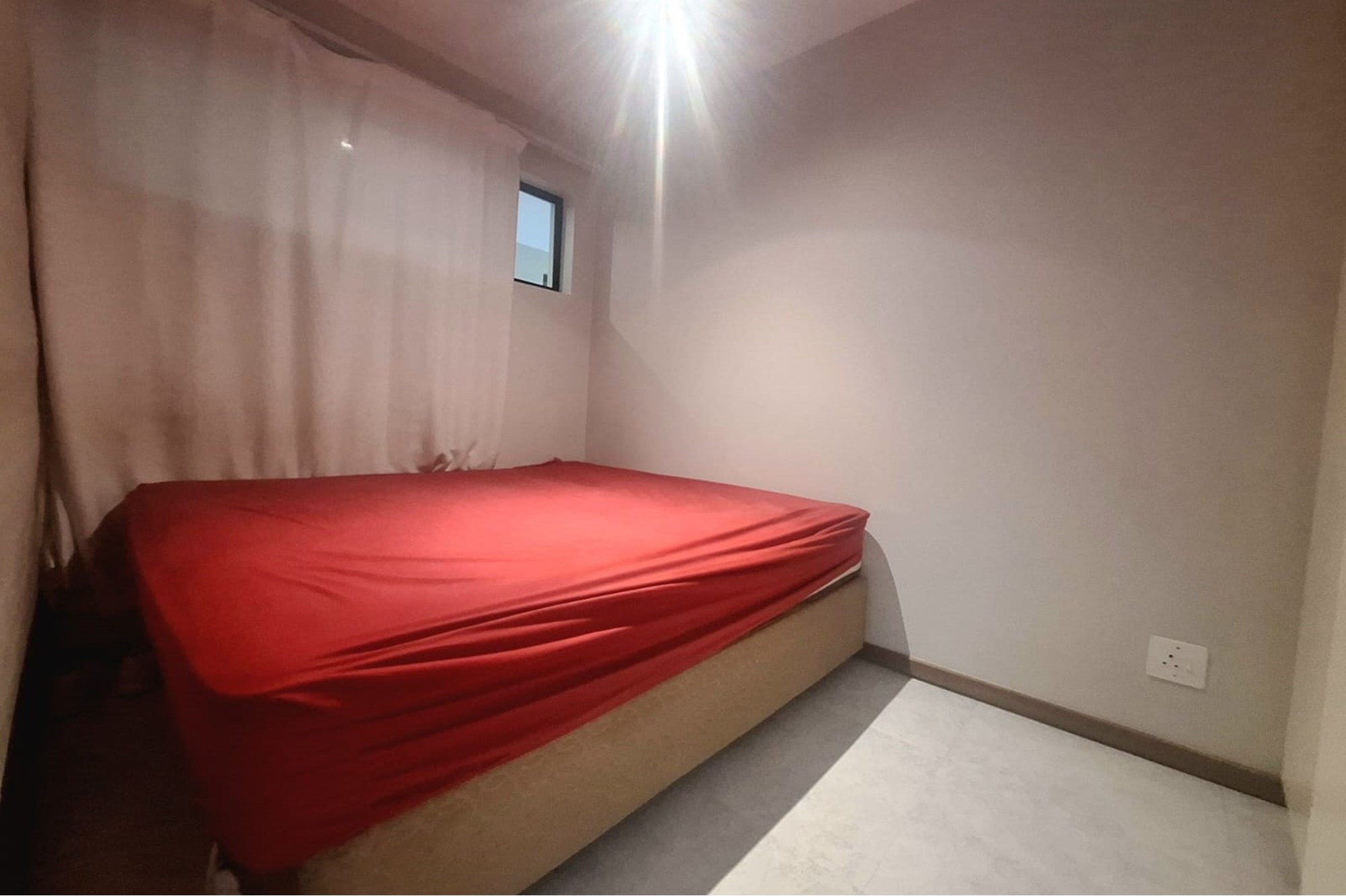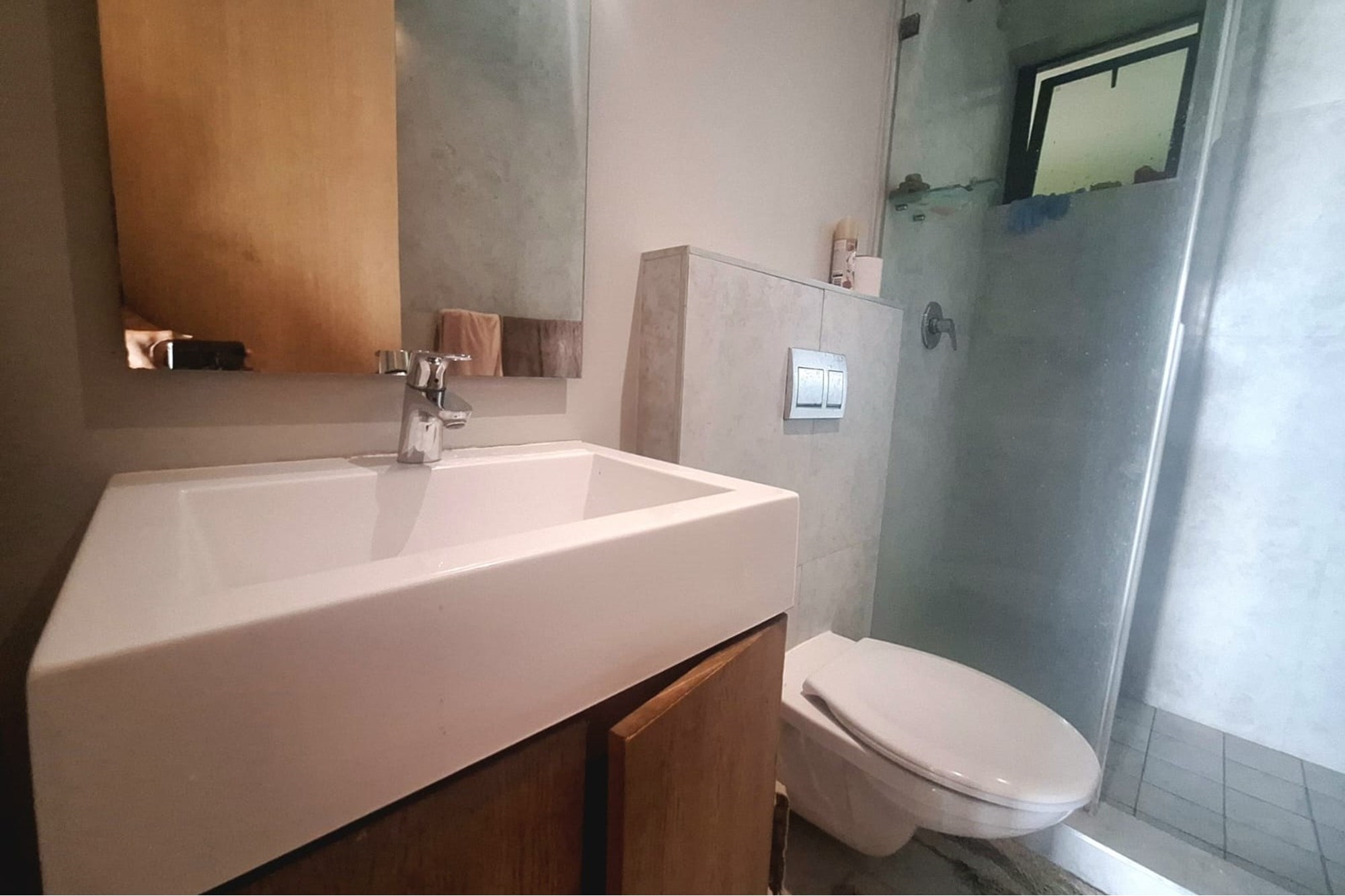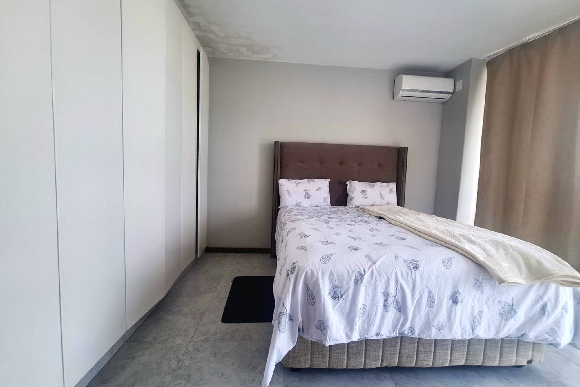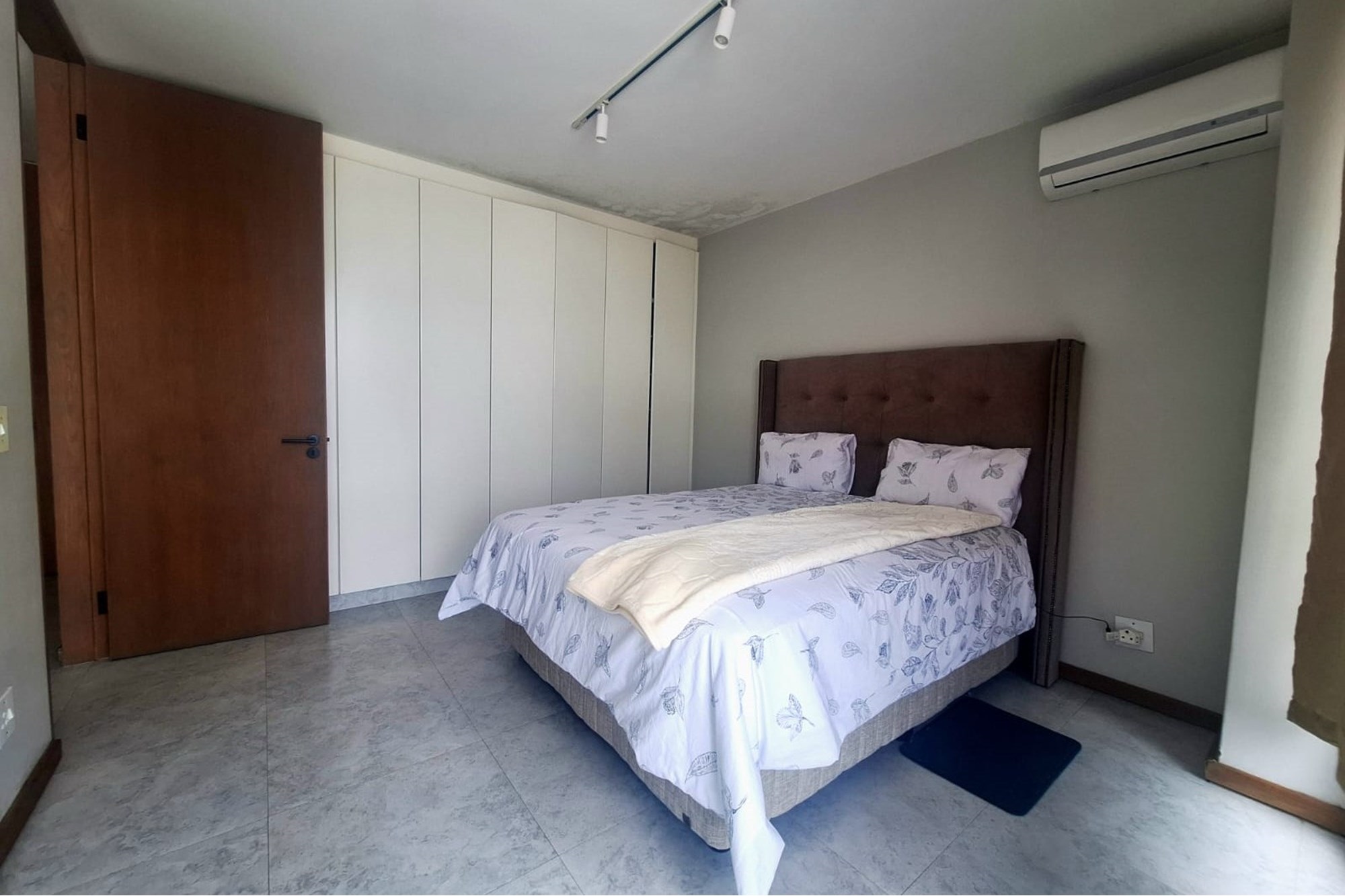 The main bedroom includes built-in cupboards and air-conditioning, and opens onto the balcony through sliding doors, ideal for enjoying early morning air or quiet evenings. There’s also an additional bedroom with built-in cupboards, plus a shared family bathroom with a shower.