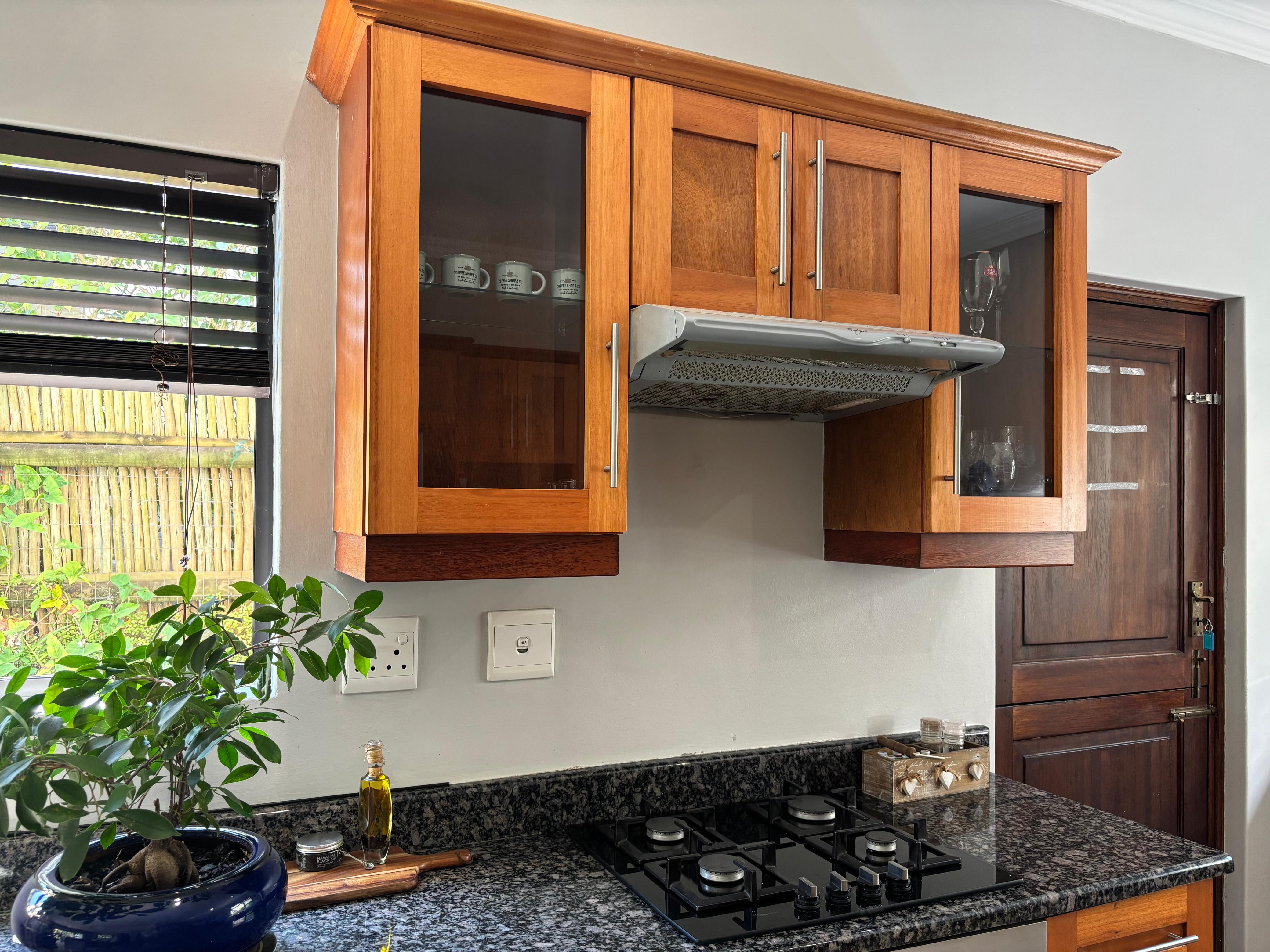 As you approach the property, a few steps lead you down through lush greenery, creating a serene and private entrance. The wide hall area guides you into your light and airy living space, which is combined with the kitchen, boasting generous granite countertops, perfect for meal preparation, a dedicated double door fridge space and a gas hob.