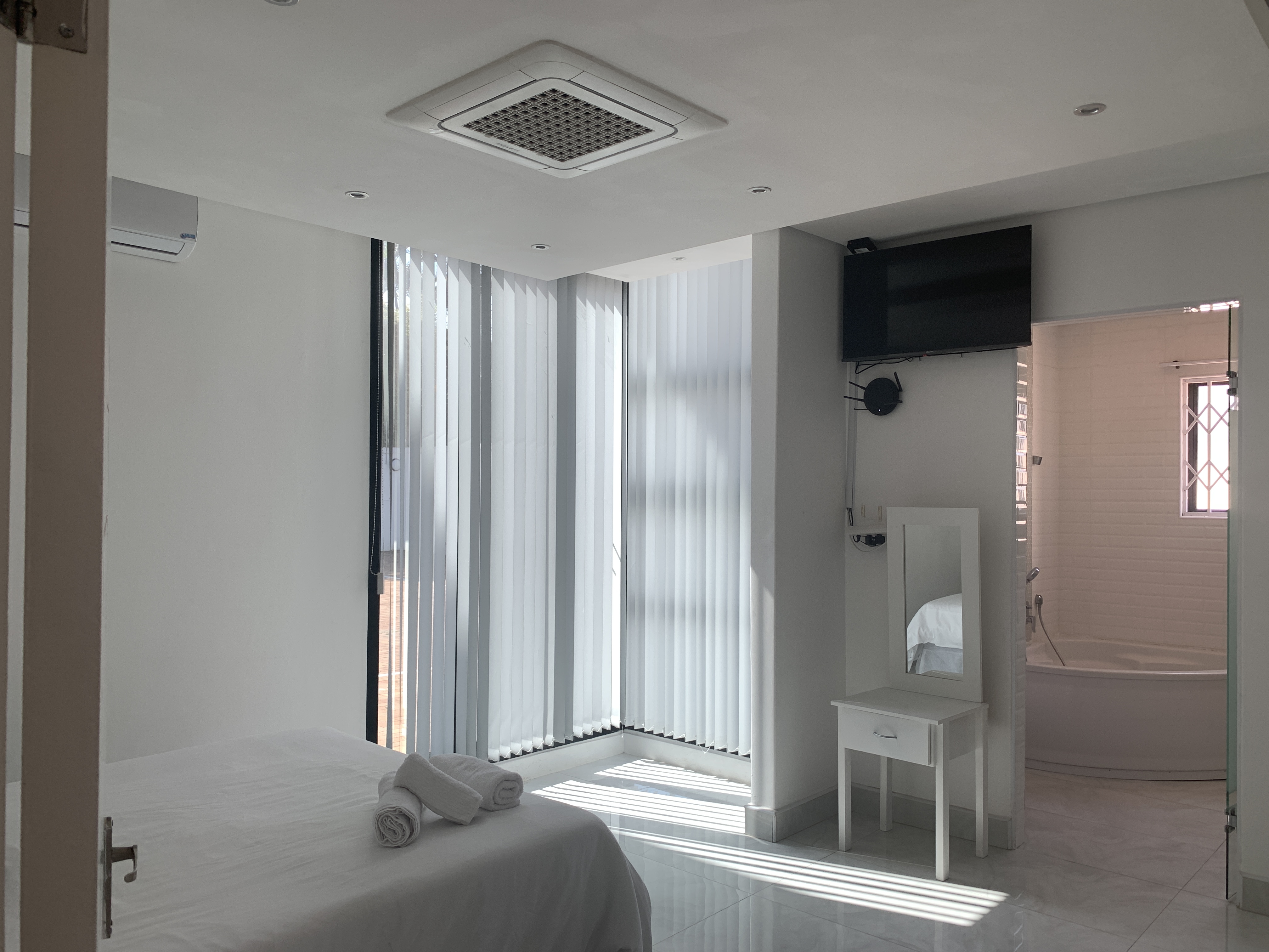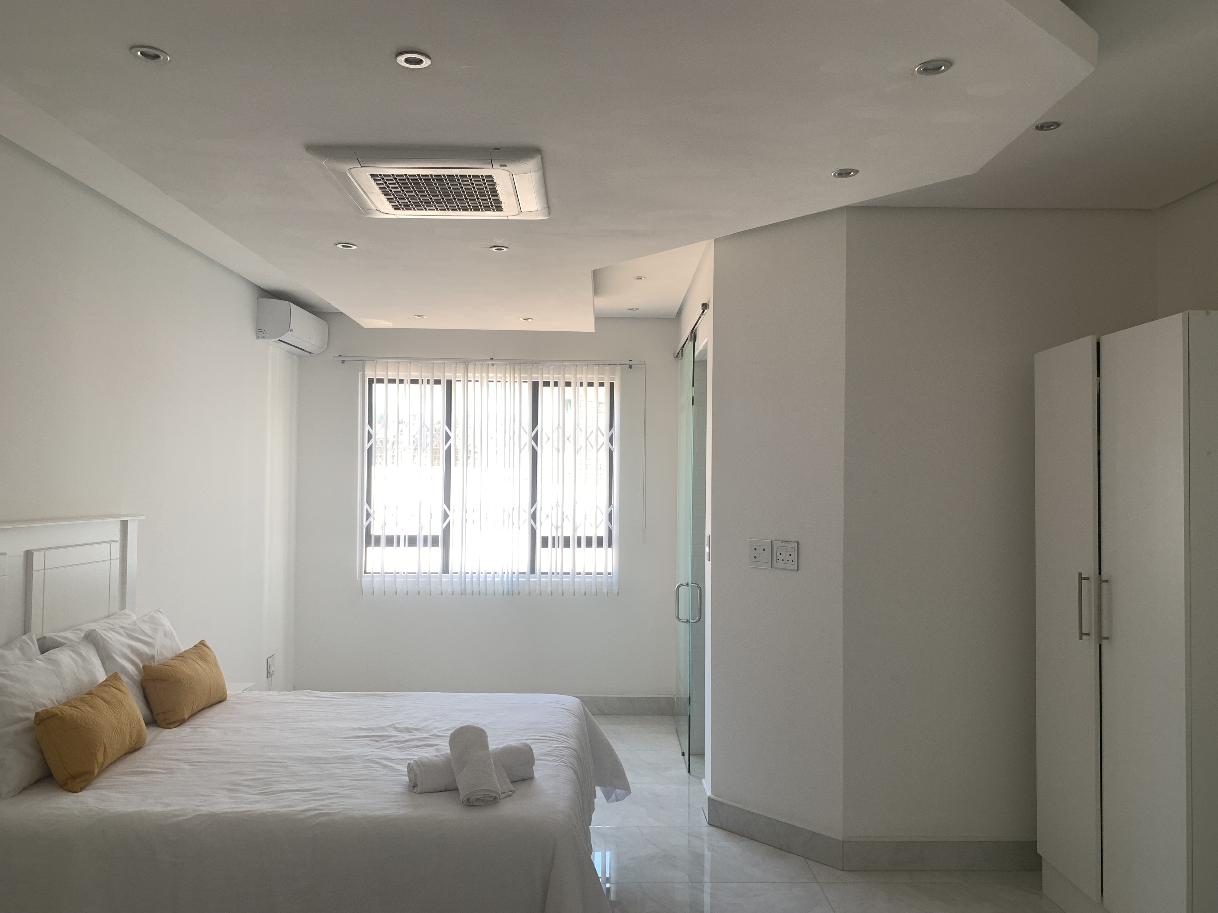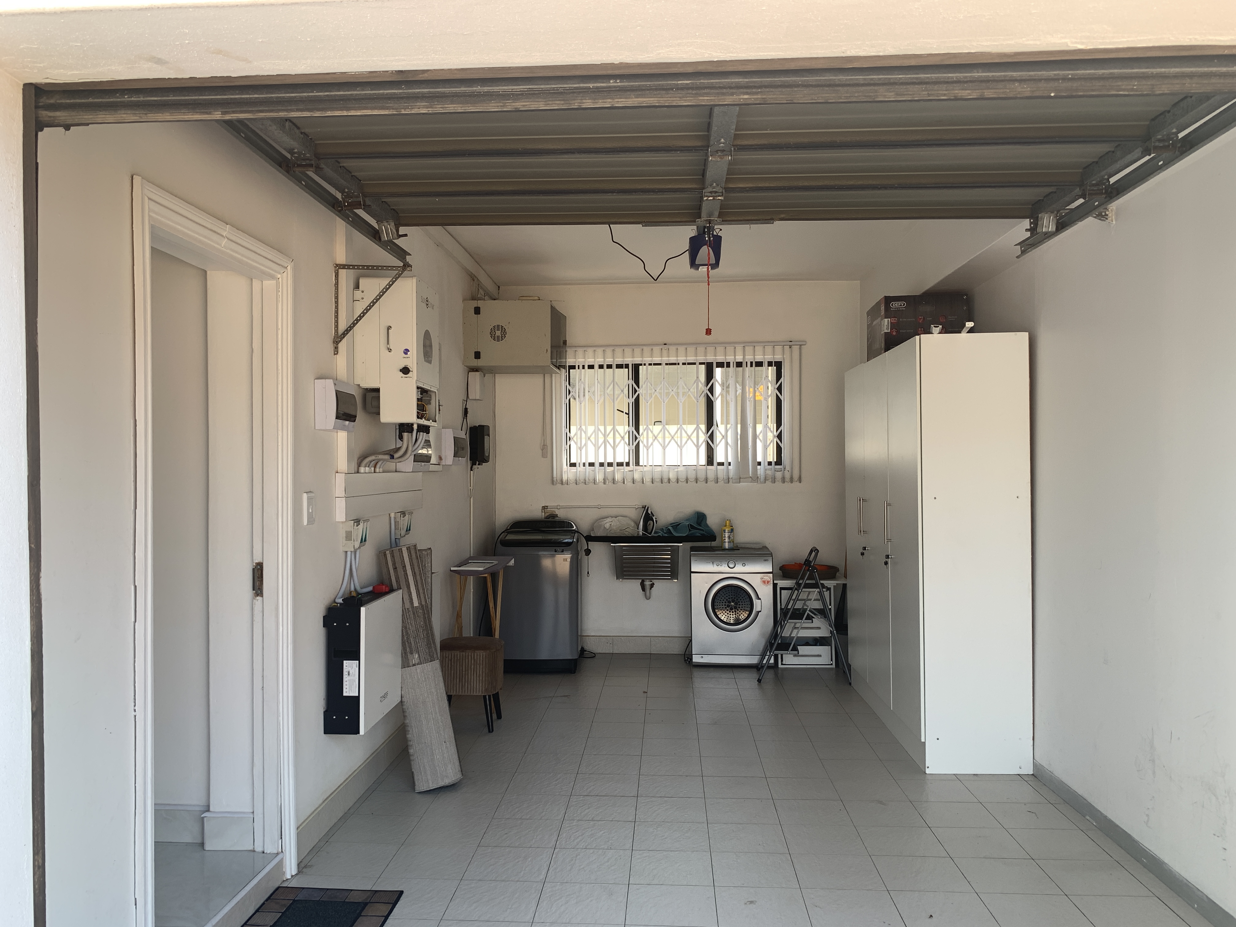 On the first level, you’ll find three spacious bedrooms, each equipped with air conditioning and en-suite bathrooms. The hallway connects to the garage, which includes laundry facilities. The property boasts three lock-up garages and ample parking space for eight or more vehicles. At the rear of the home, there are charming domestic quarters complete with a shower, basin, and toilet.