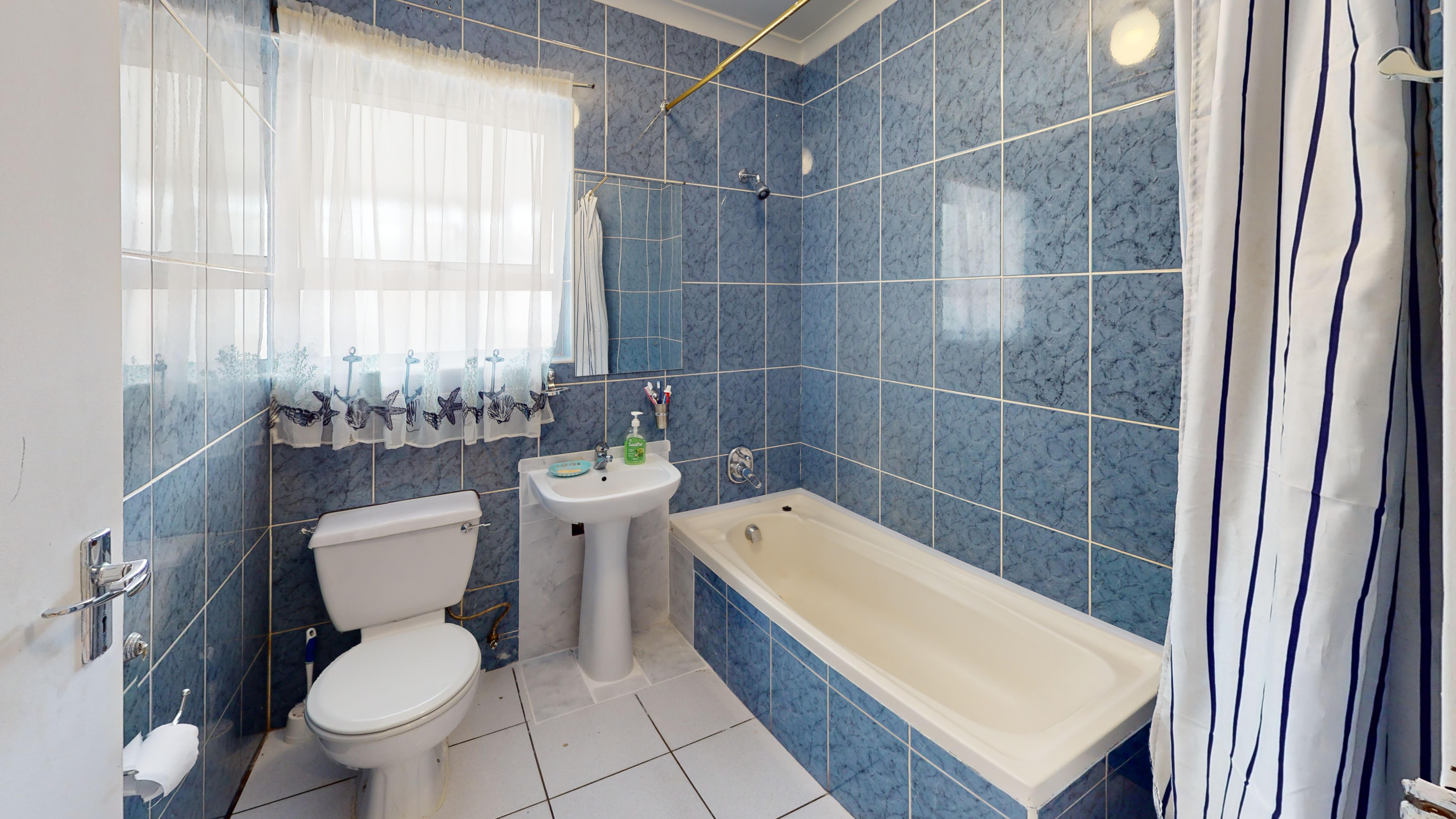 The family bathroom features a bath with overhead shower, catering comfortably to family living.