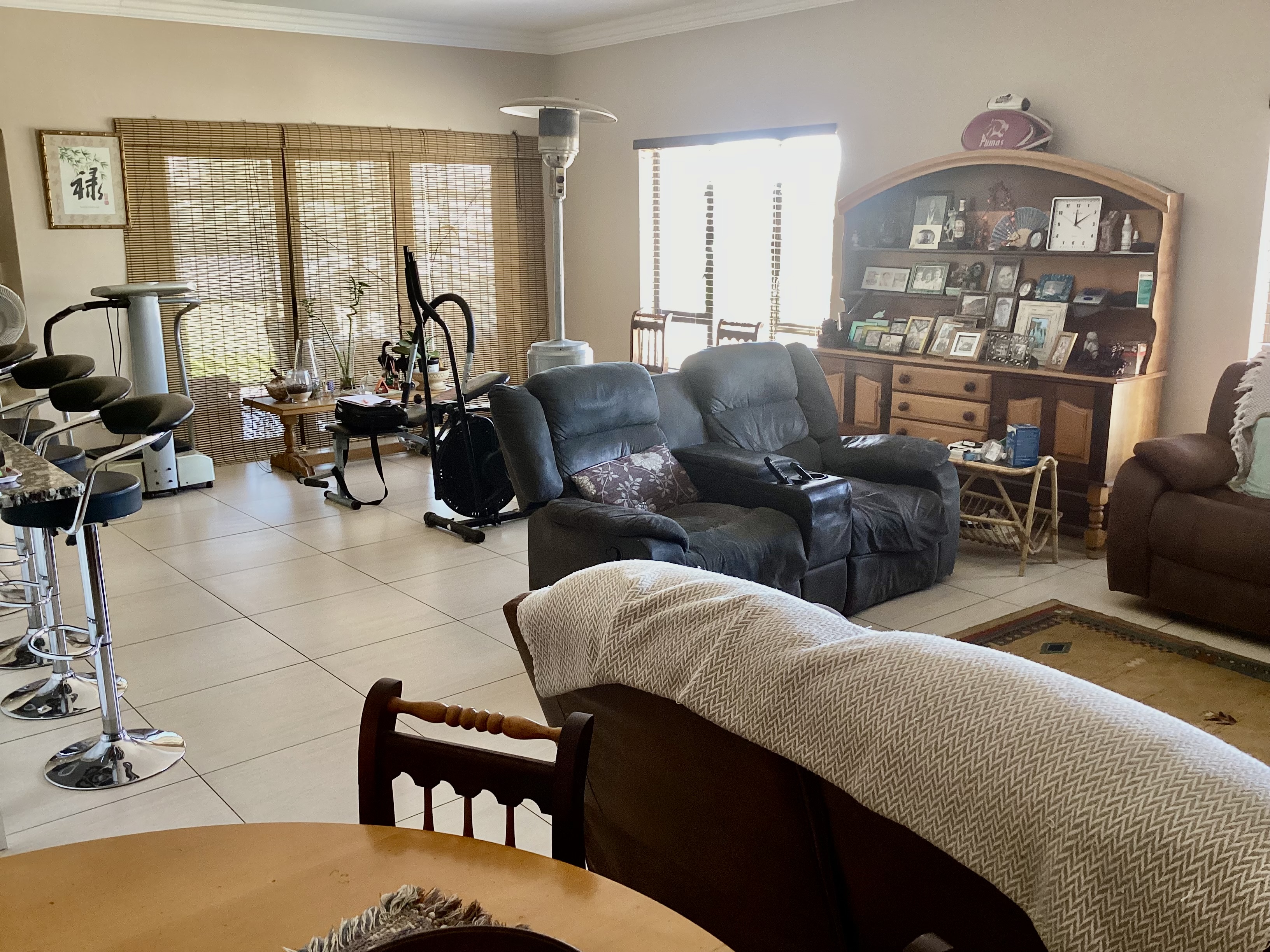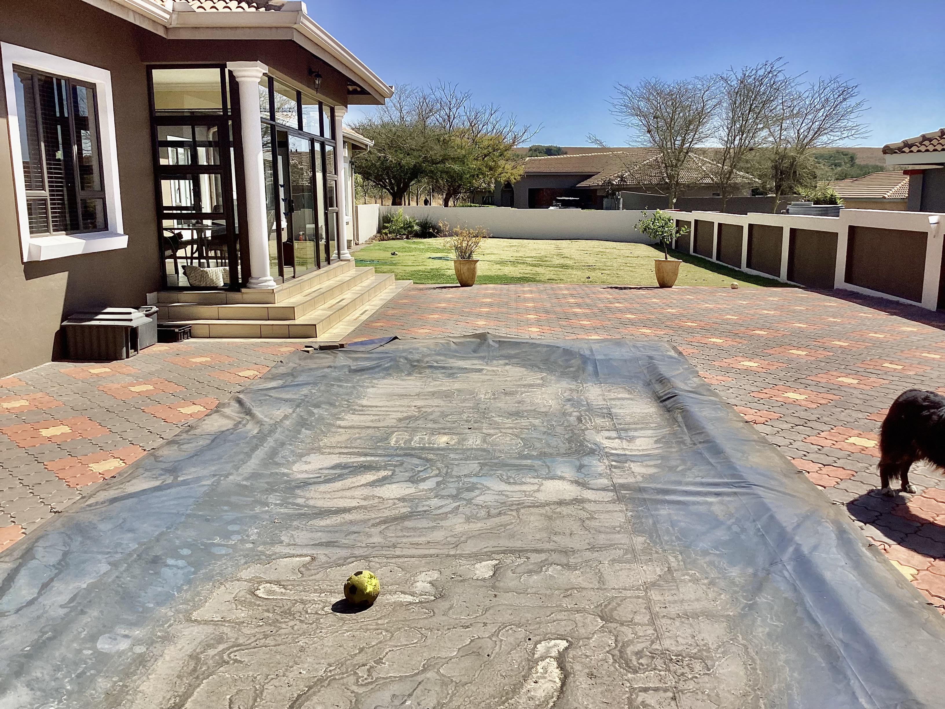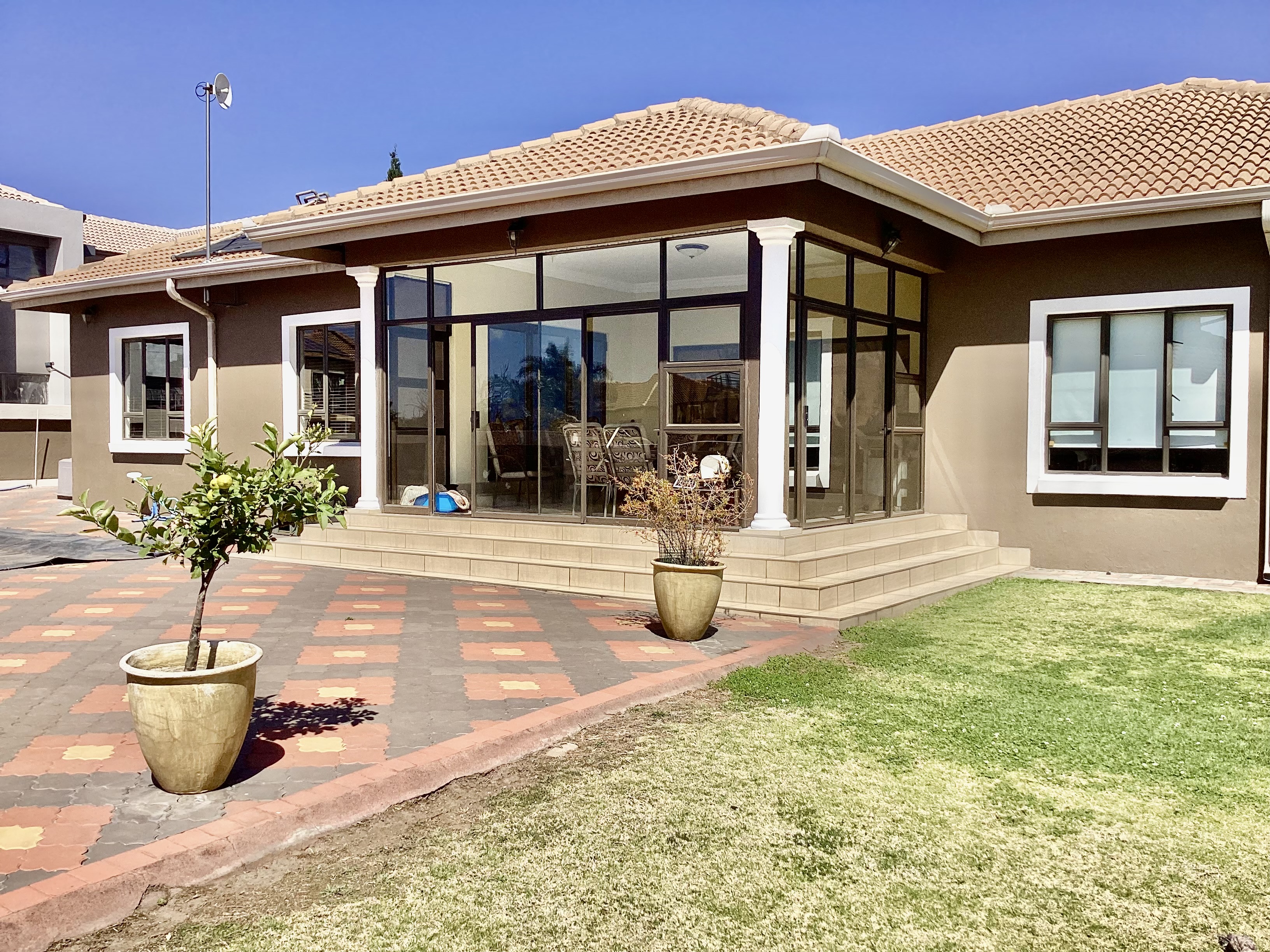 Enclosed entertainment room that leads you to a solar heated swimming pool and garden.