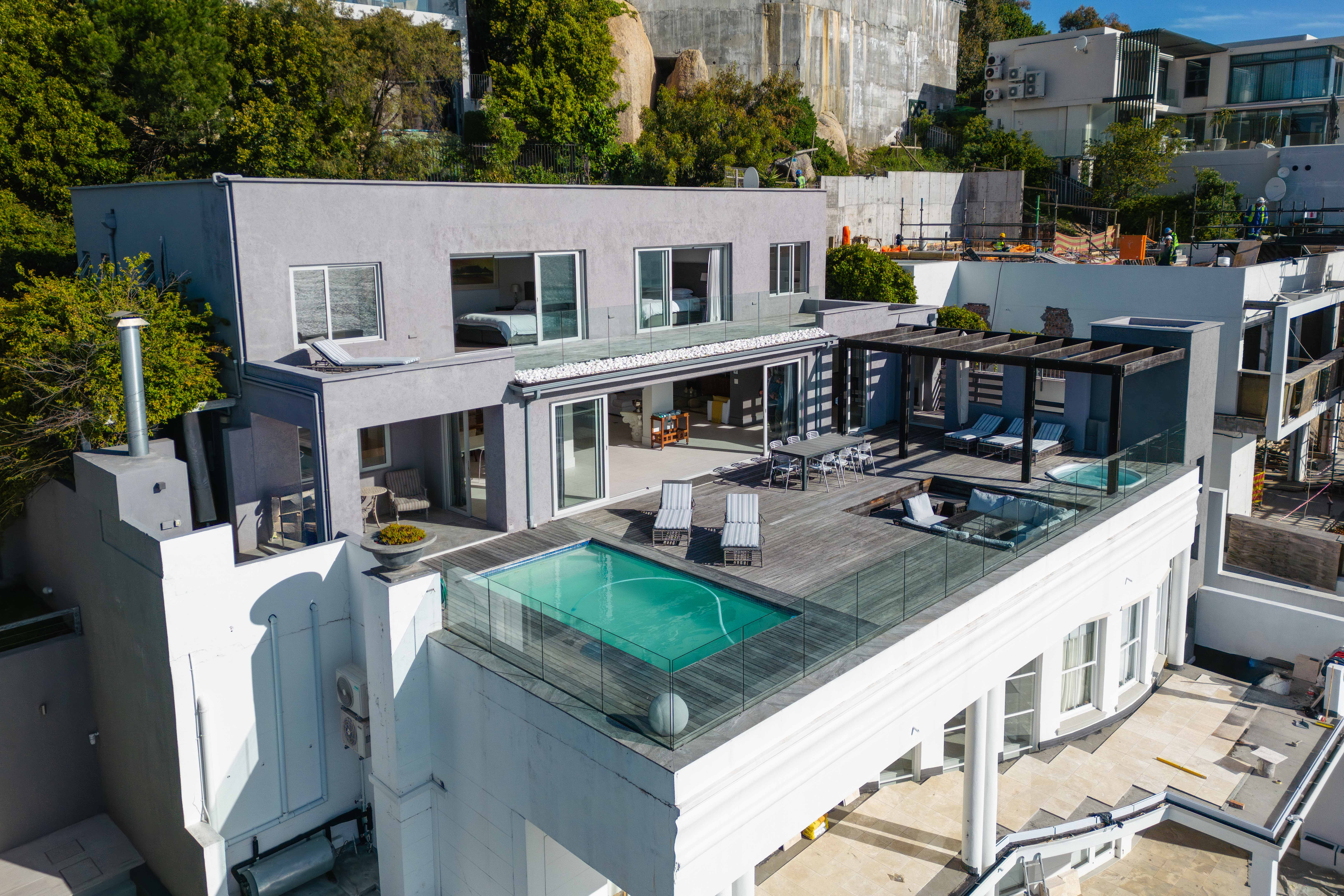 The open plan living area is flooded with natural light and offers sweeping views of the bay. The contemporary kitchen is designed for entertaining, while the covered braai area and inviting pool create a perfect outdoor oasis. Unwind in the hot tub or enjoy the captivating scenery from the private balcony of the master suite.