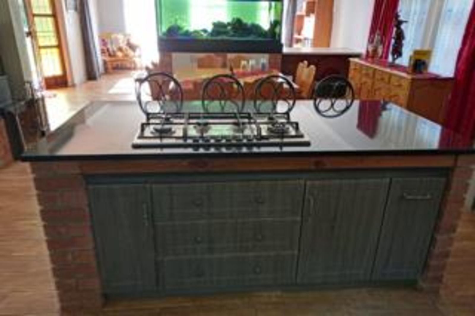 - Modern kitchen with island gas stove, electric oven, and granite work surfaces