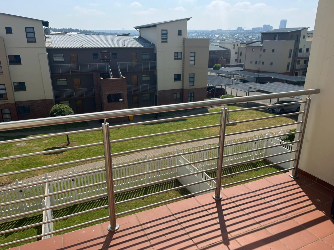 The spacious bedroom includes built-in cupboards and is serviced by a modern bathroom finished with clean, neutral tones. As a top-floor apartment, the unit benefits from added peace, enhanced natural light, and elevated views across the estate.