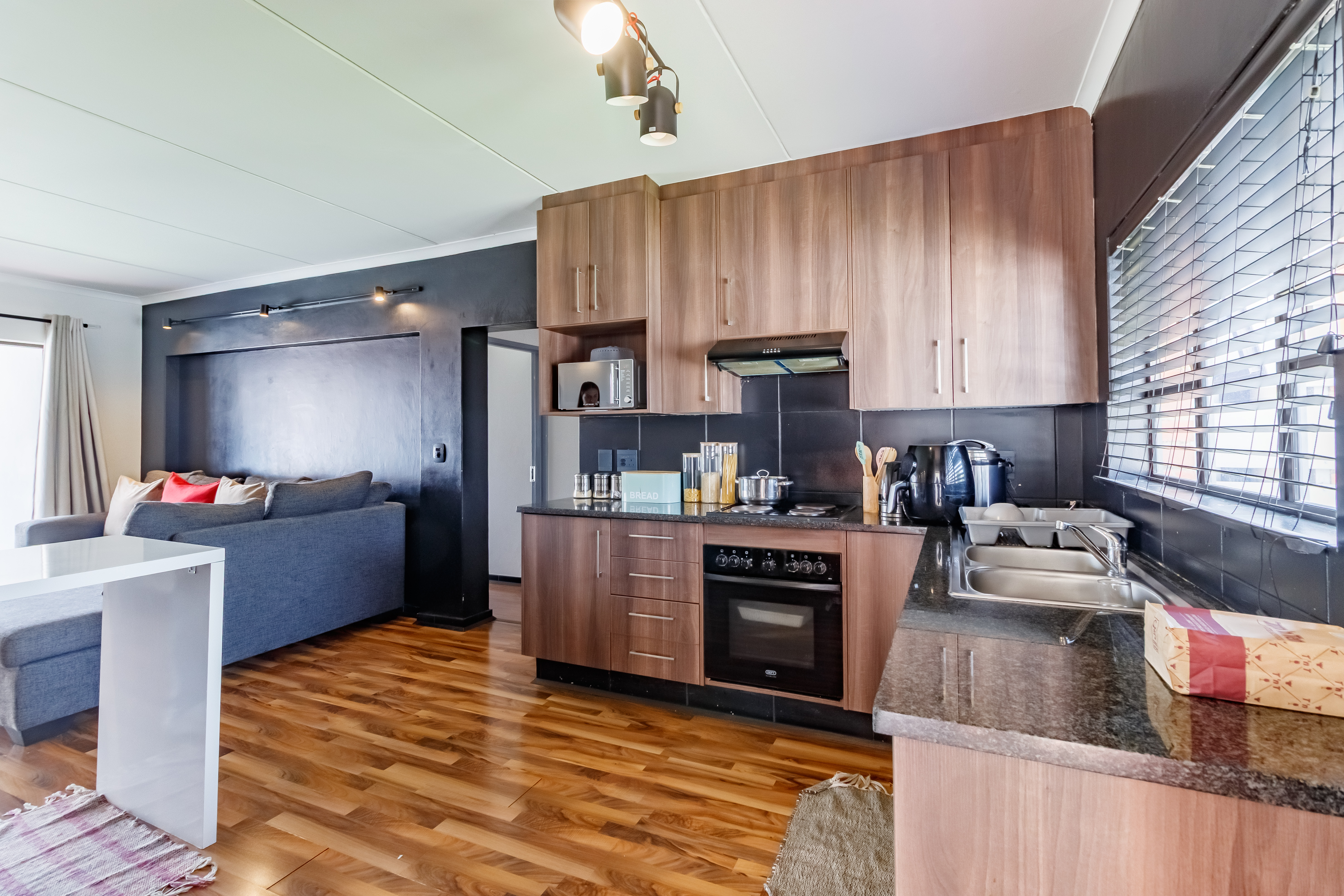 The open-plan kitchen and living area is well designed and flows seamlessly onto the covered patio and garden, creating an ideal space for entertaining or unwinding at home. The kitchen is finished with contemporary cabinetry, ample counter space, and space for appliances, while the living area is bright and inviting.