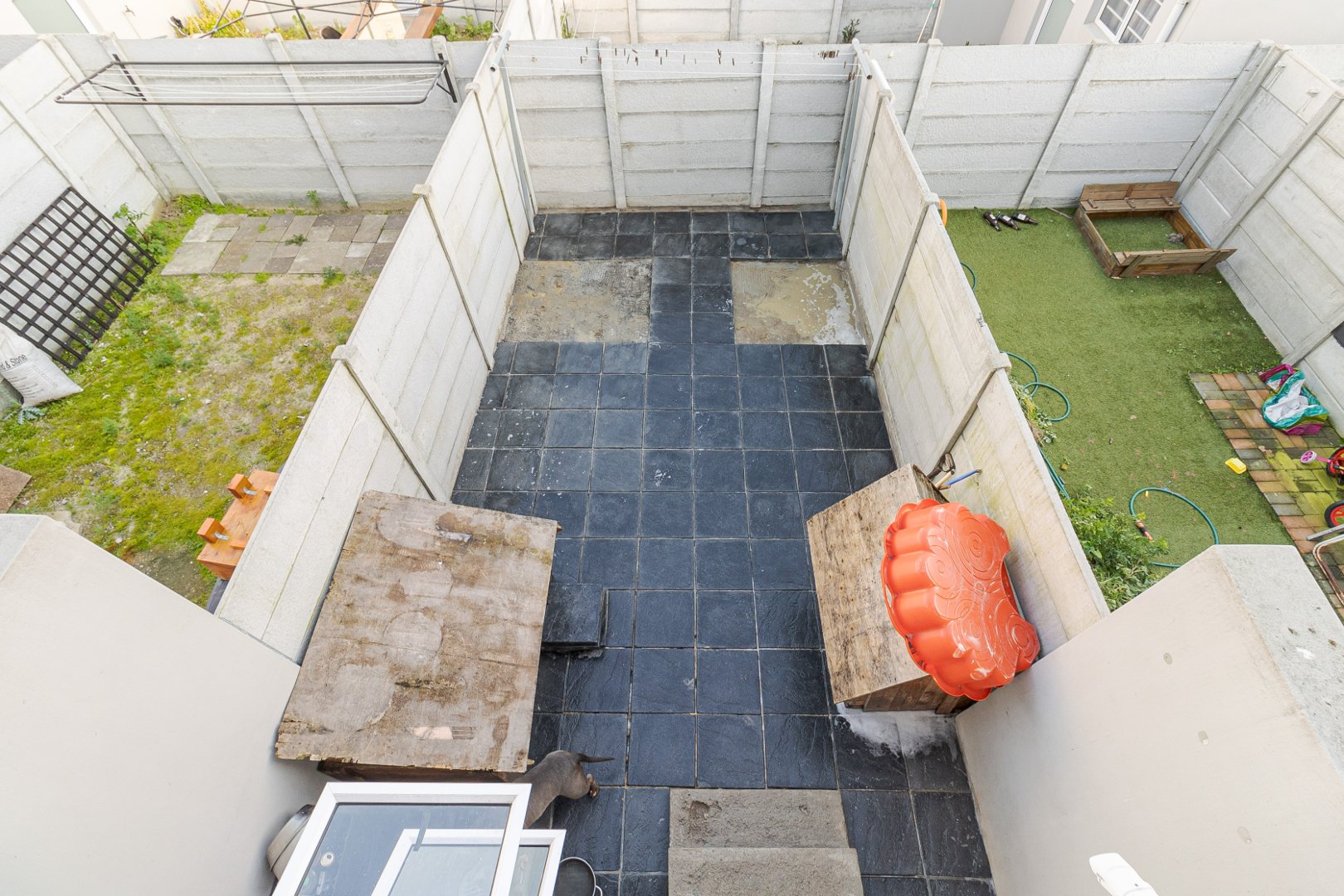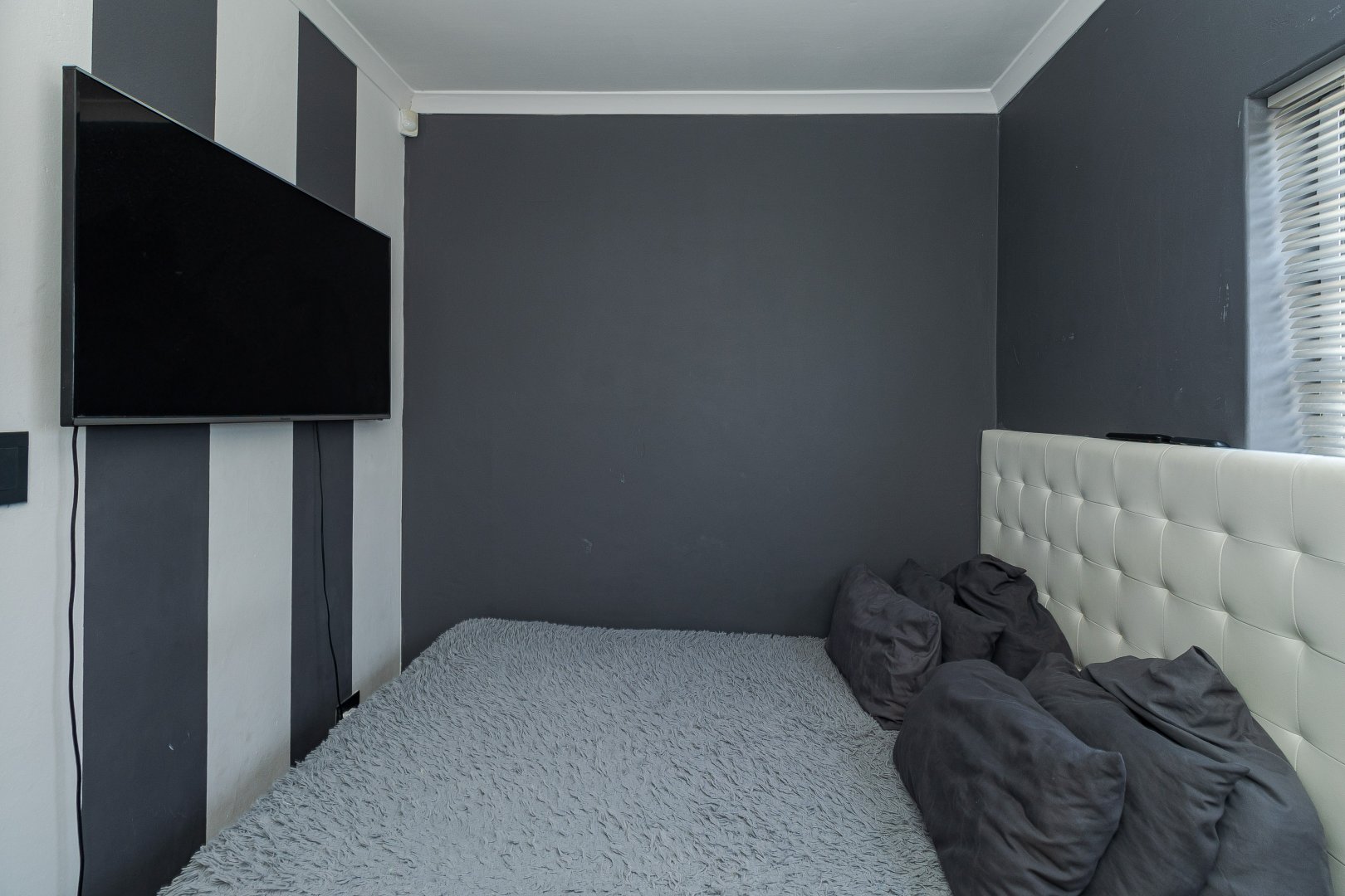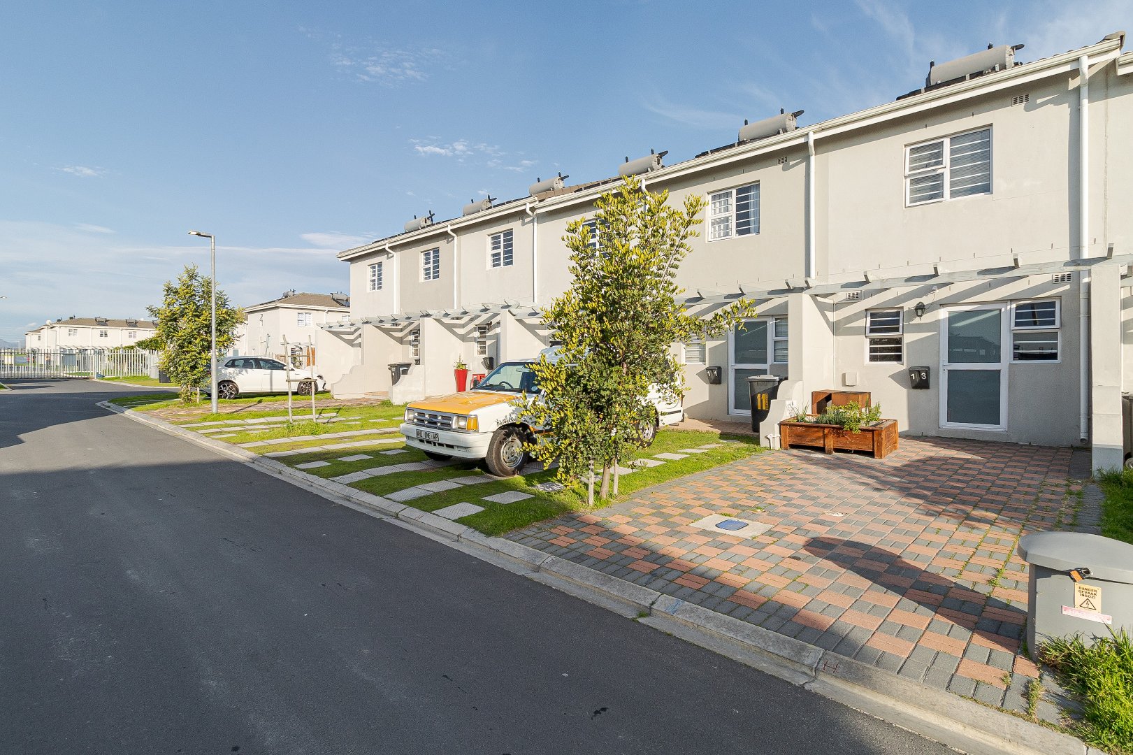 The home features two spacious bedrooms with built-in cupboards, providing ample storage space. A modern bathroom with a sleek shower adds to the contemporary appeal. The open-plan living area seamlessly connects to the paved backyard, ideal for outdoor relaxation or entertainment. Additionally, parking is available for two vehicles right in front of the house.