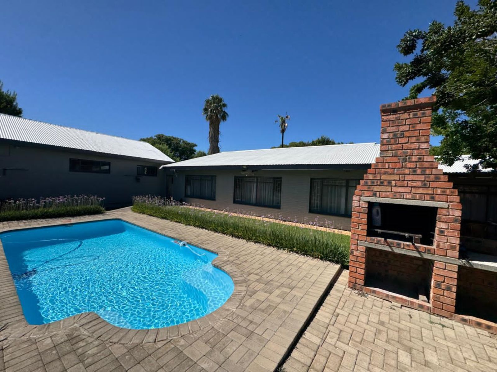 Security is a standout feature, with an alarm system, CCTV cameras, and electric fencing providing complete peace of mind. Outdoor living is enhanced by a sparkling swimming pool and a dedicated braai area, ideal for relaxed gatherings.